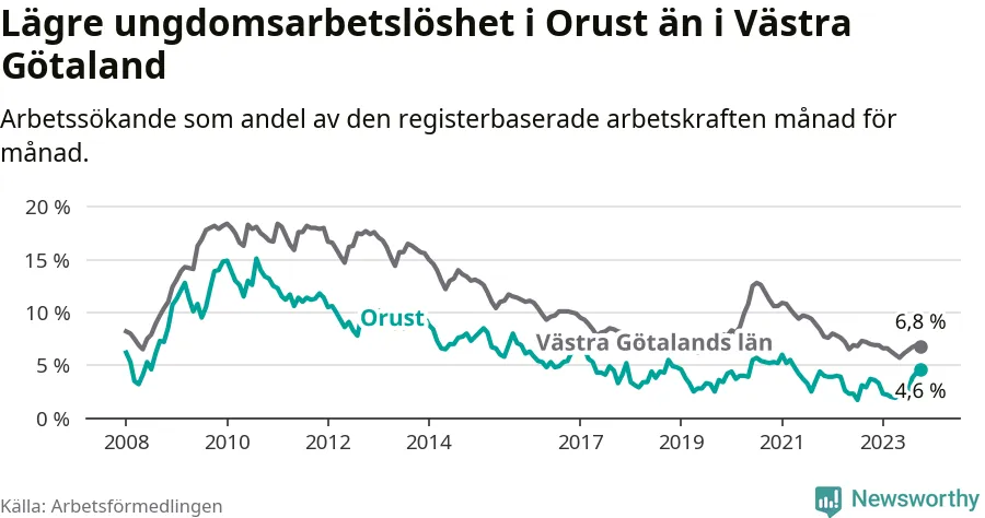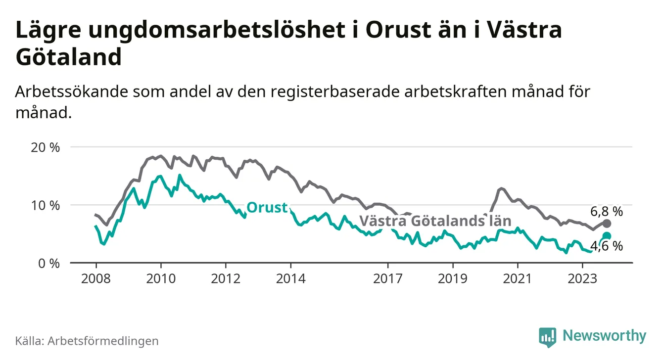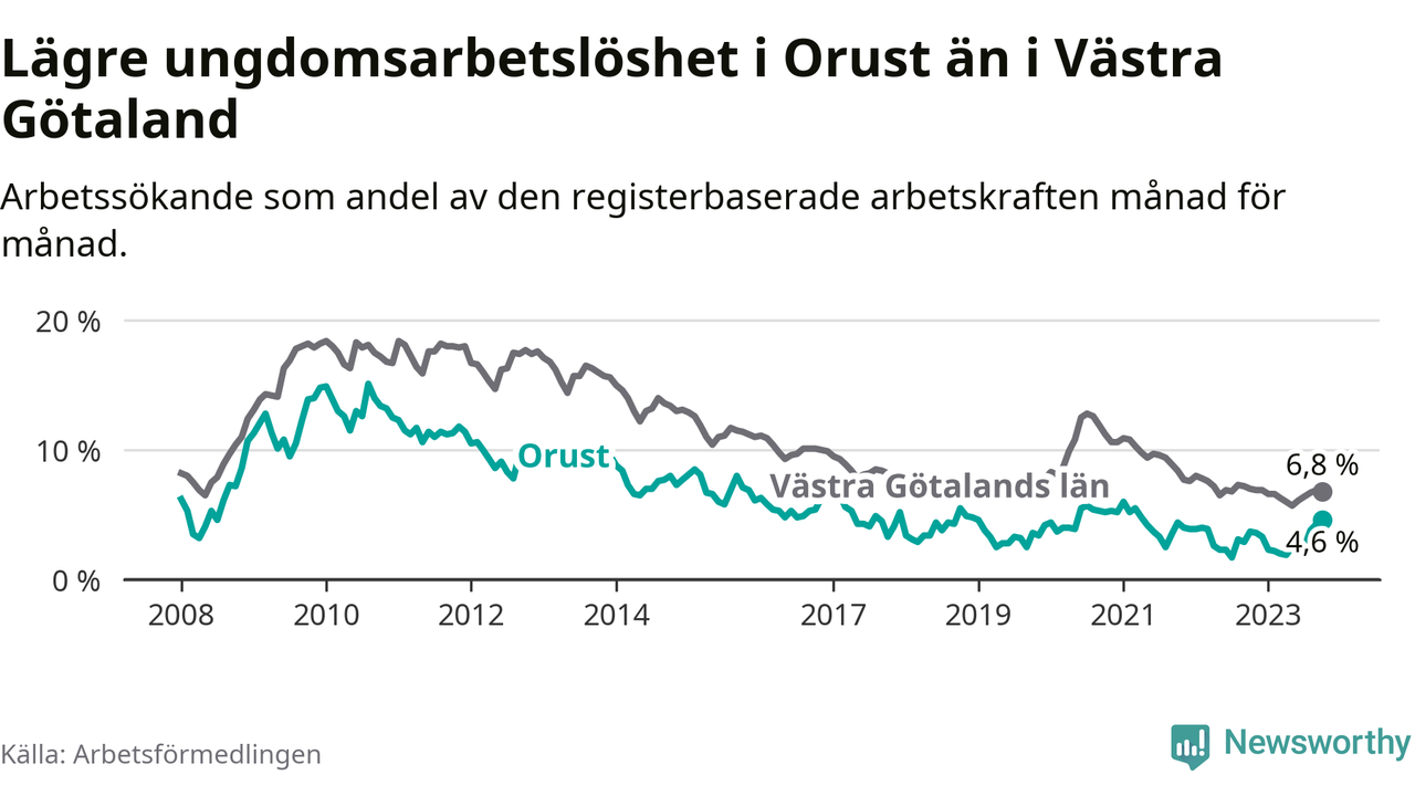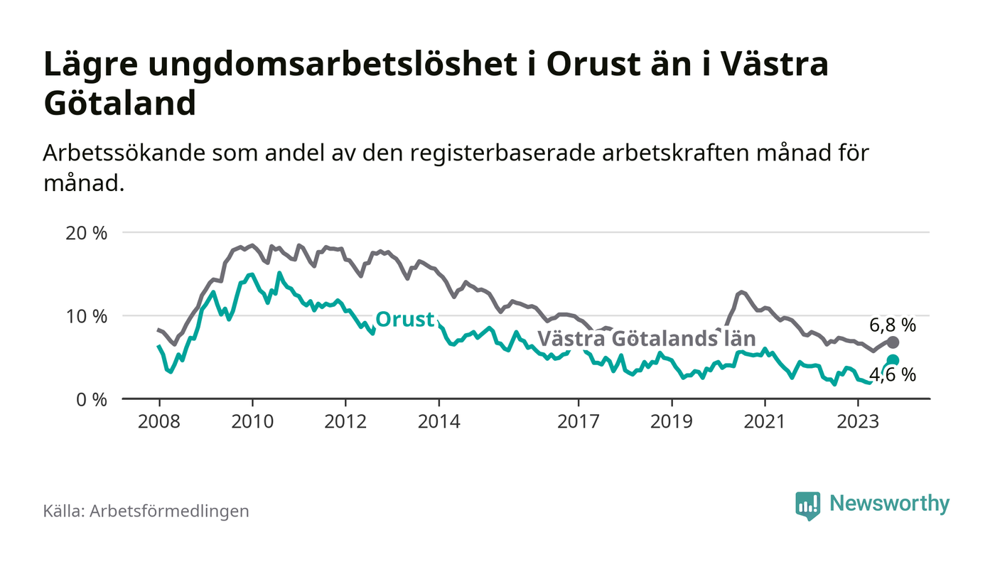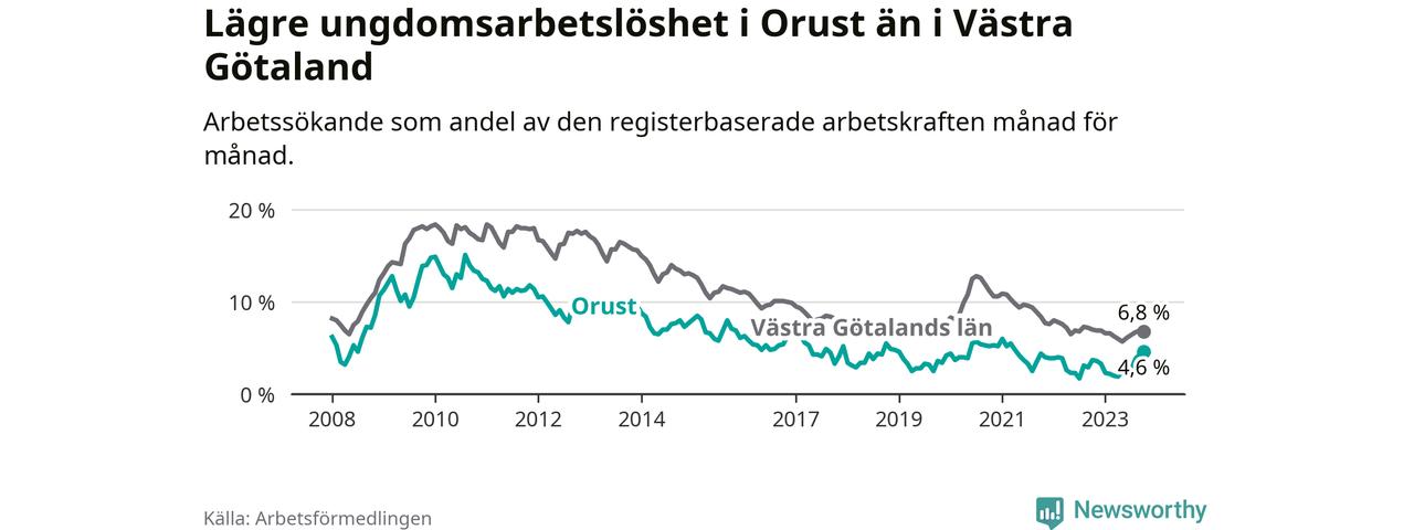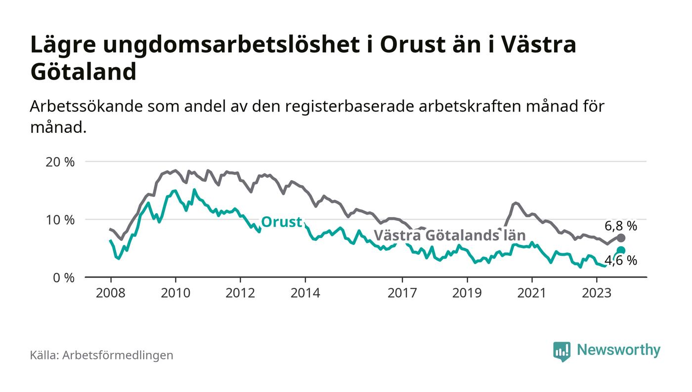 Graf: Arbetslöshet bland unga i Orusts kommun och Västra Götalands län