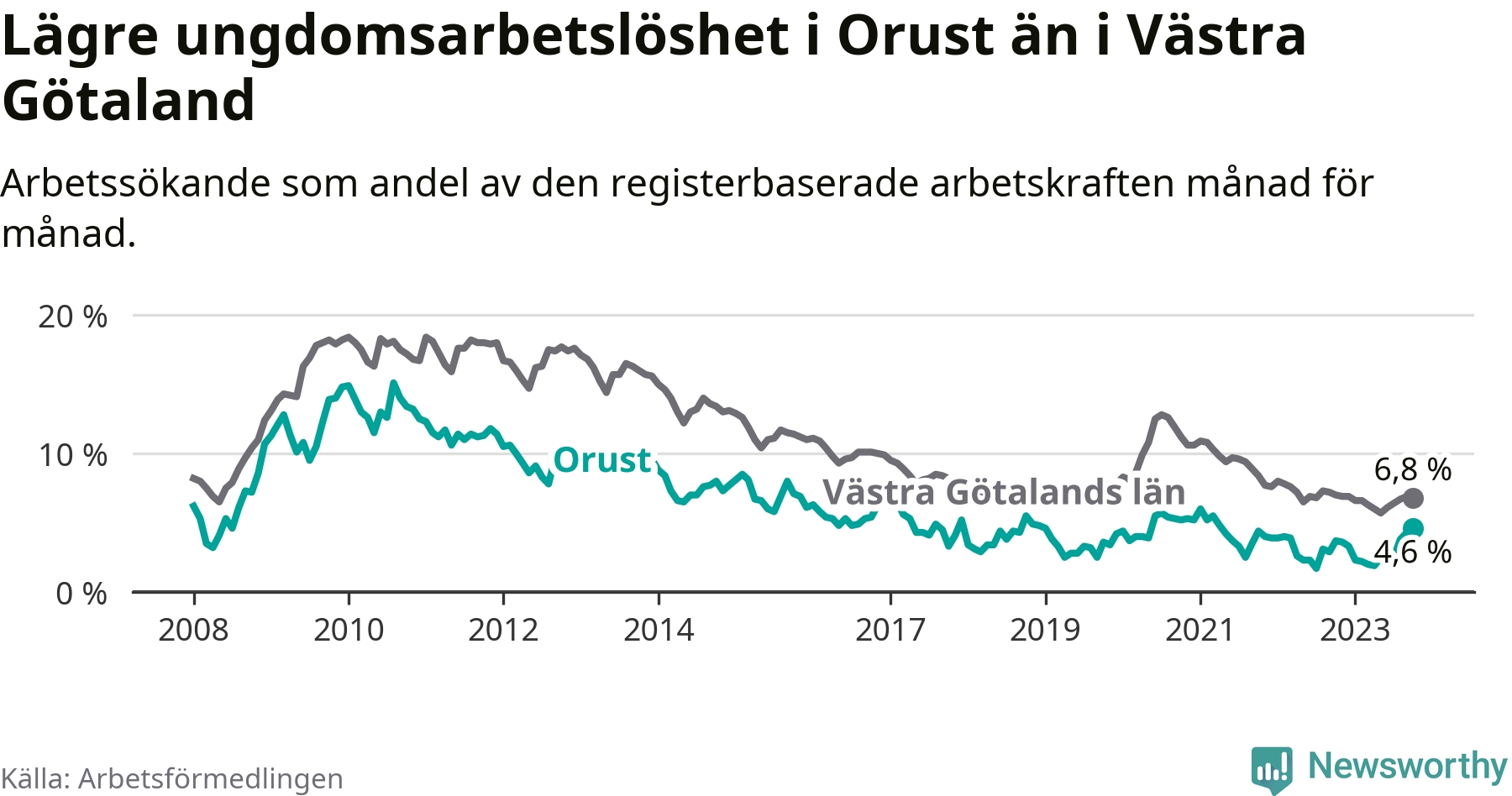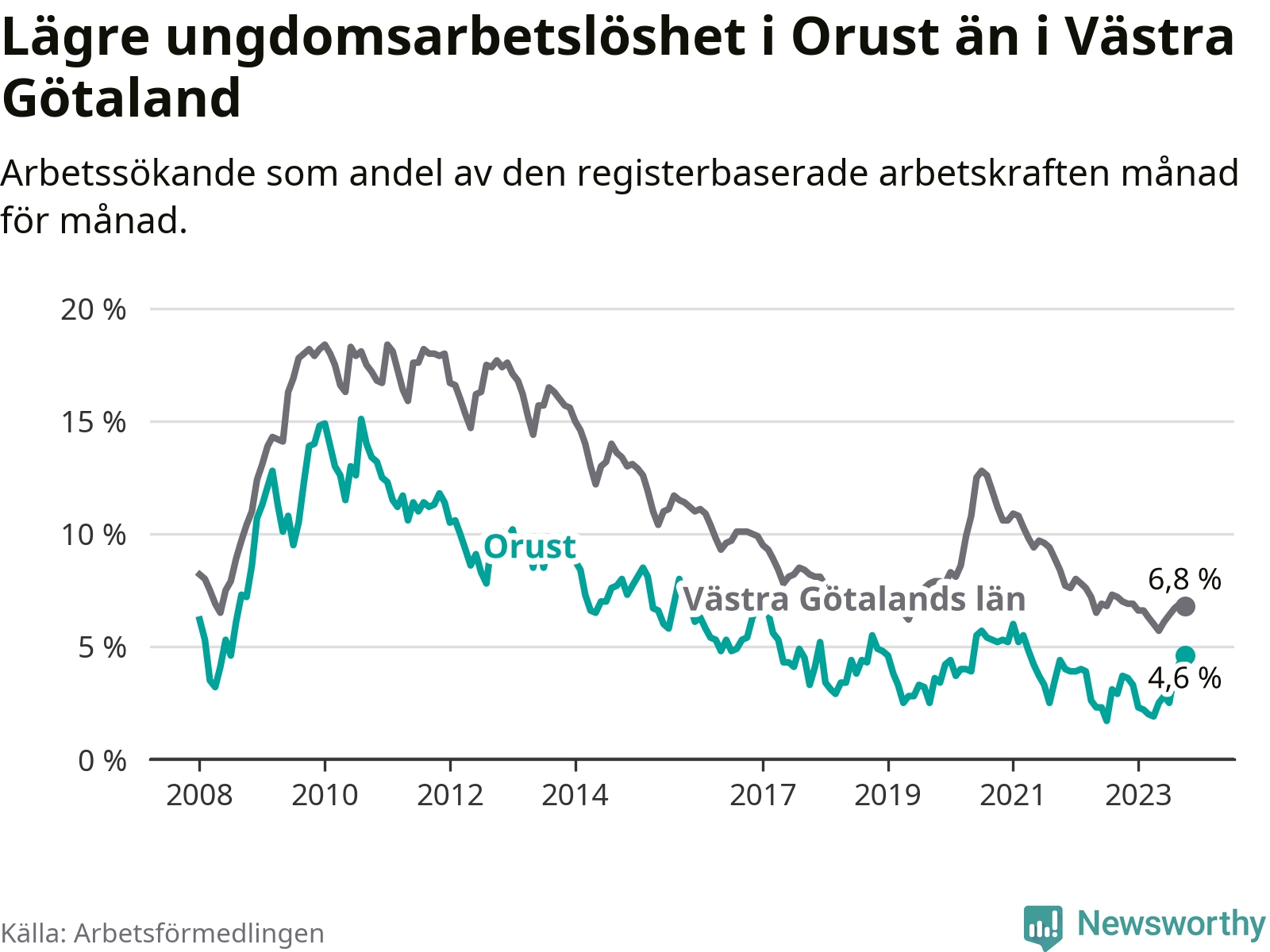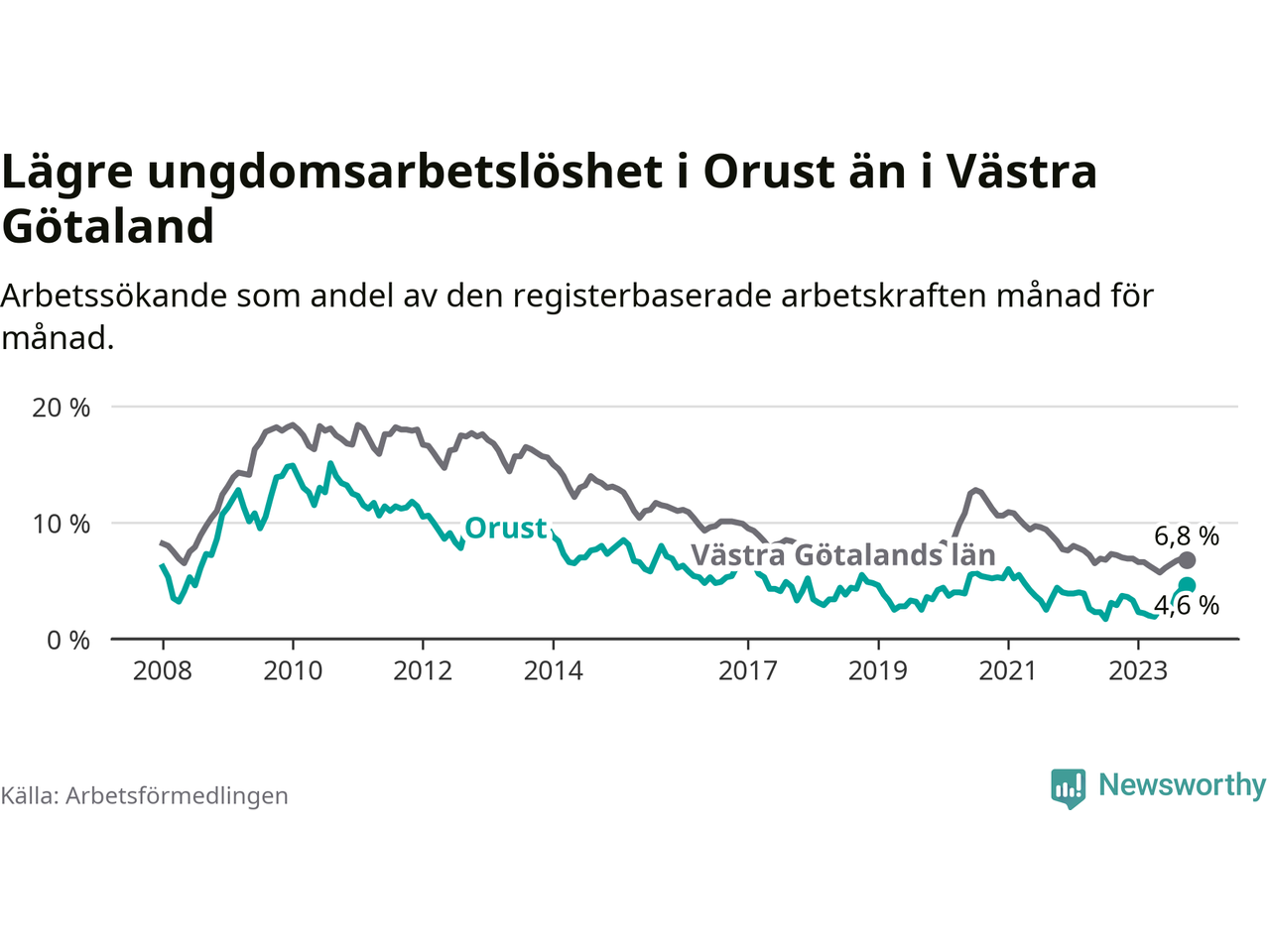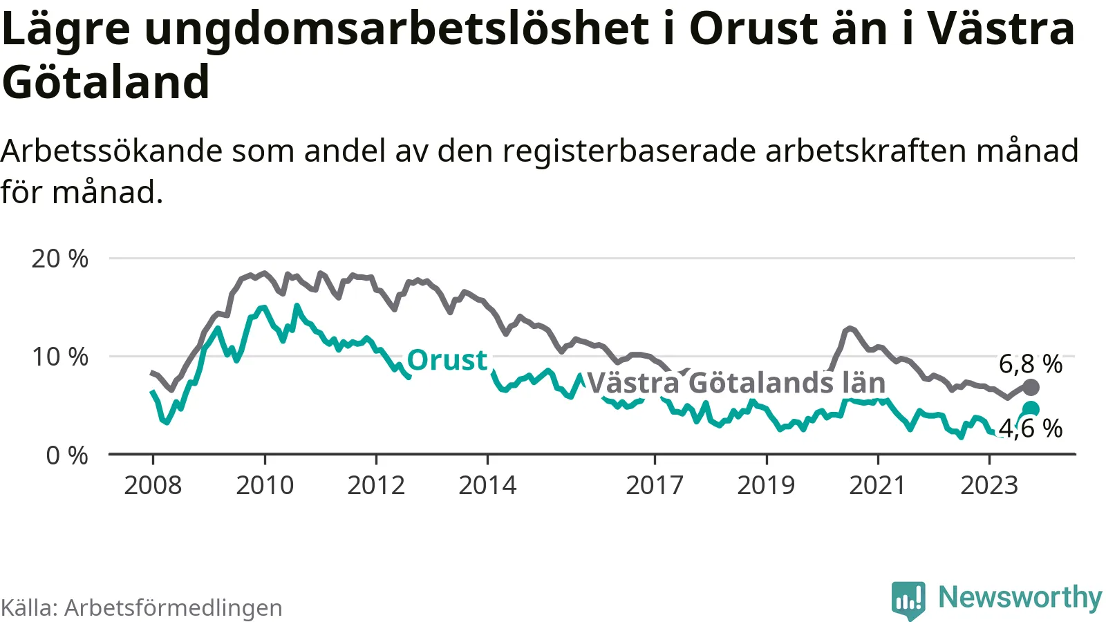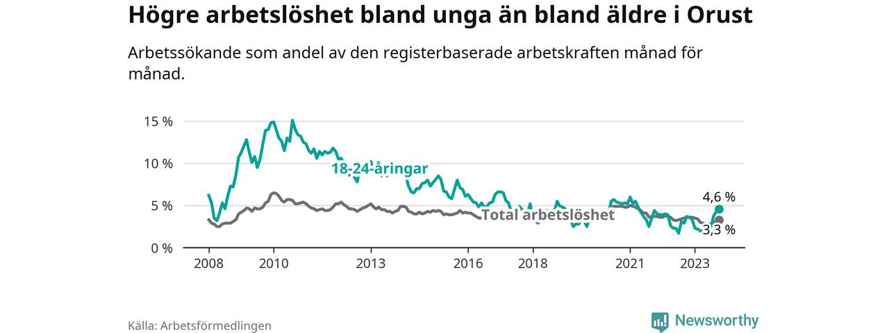 Graf: Arbetslöshet bland unga i Orusts kommun och Västra Götalands län