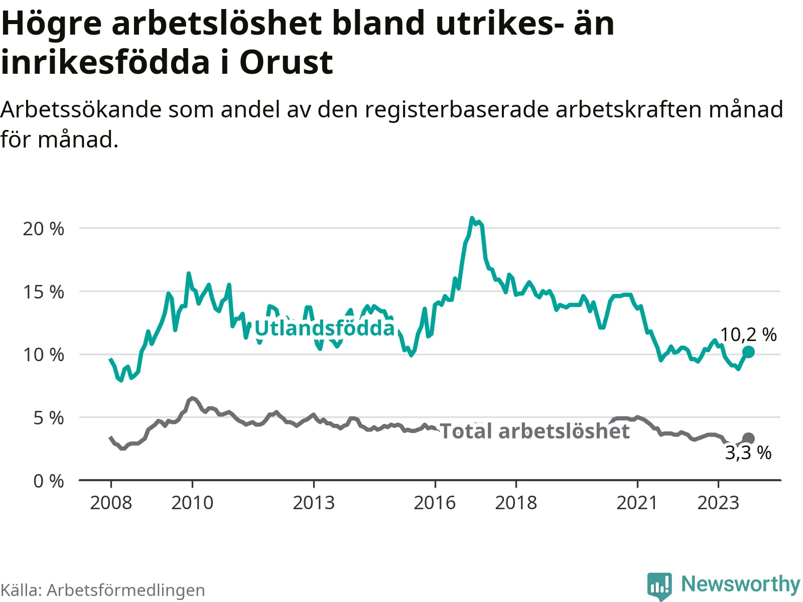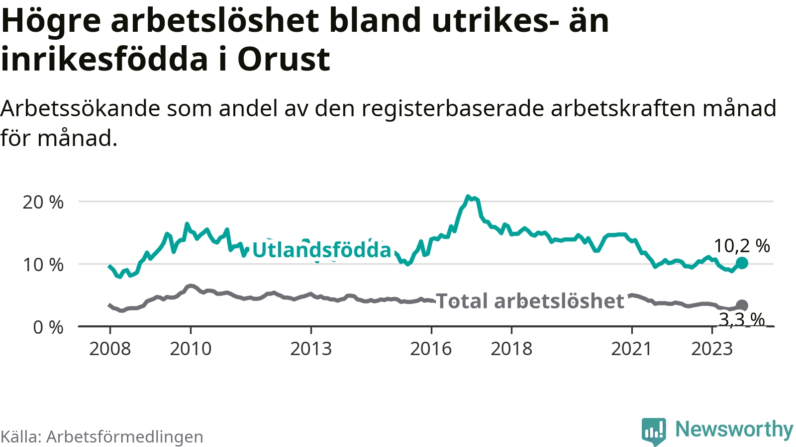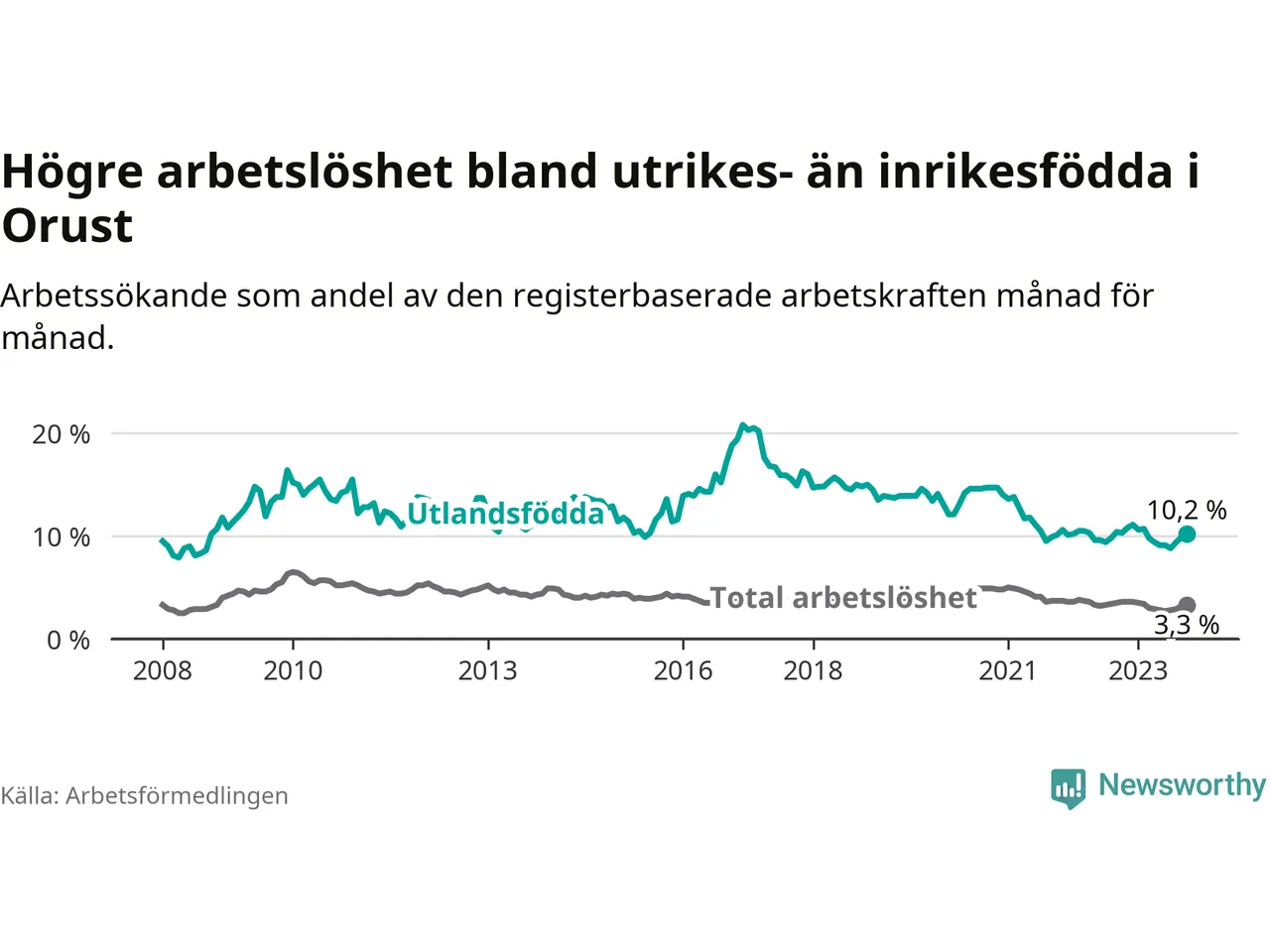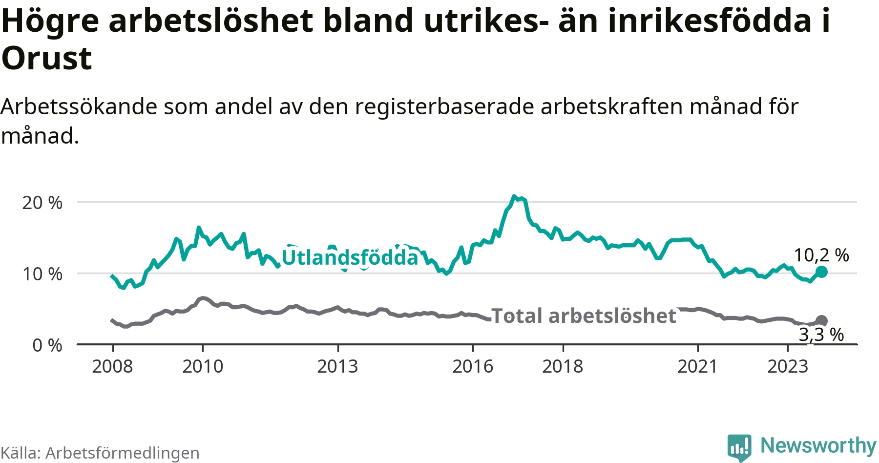 Graf: Skillnad i arbetslöshet mellan utrikesfödda och hela befolkningen i Orusts kommun