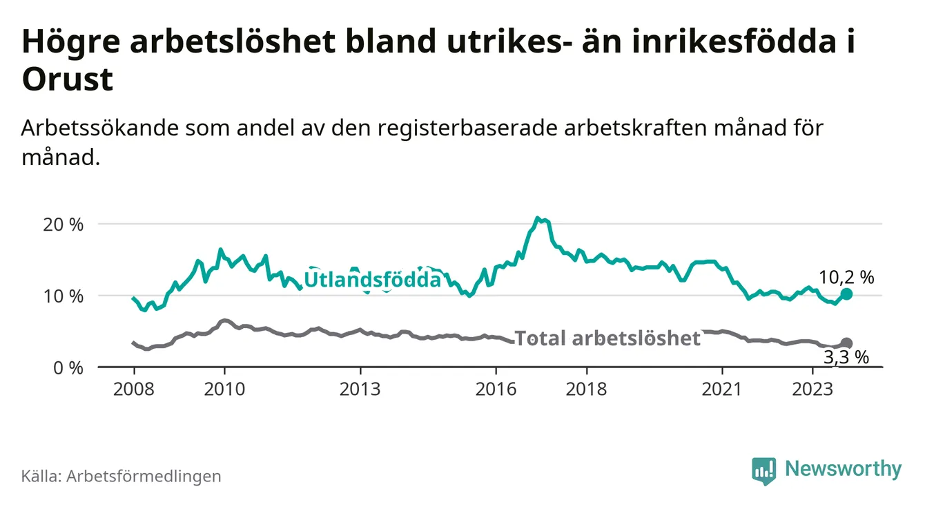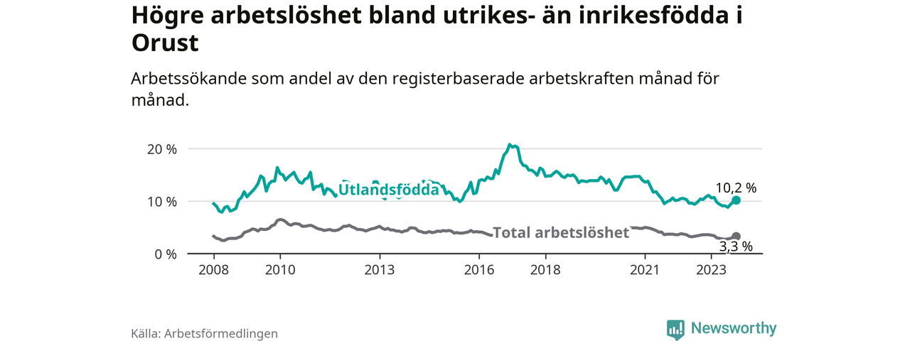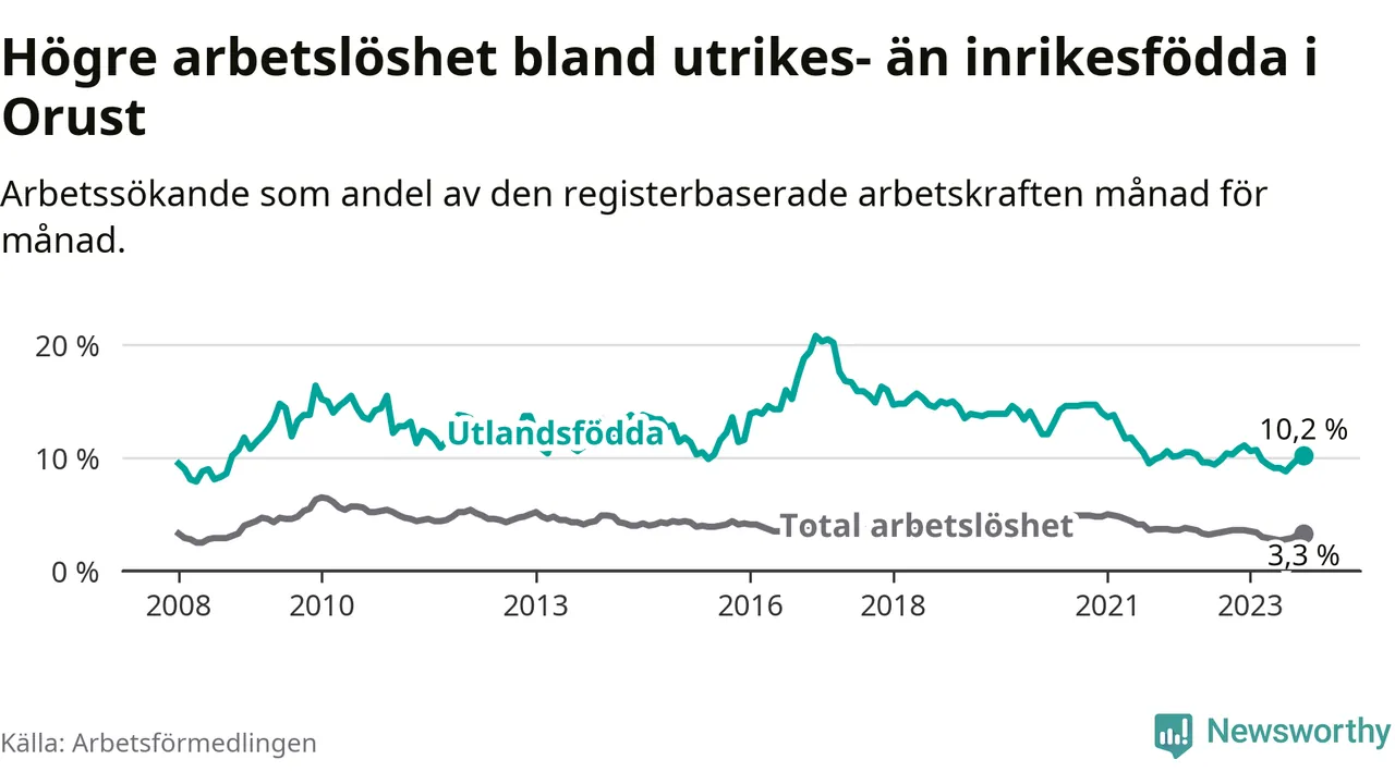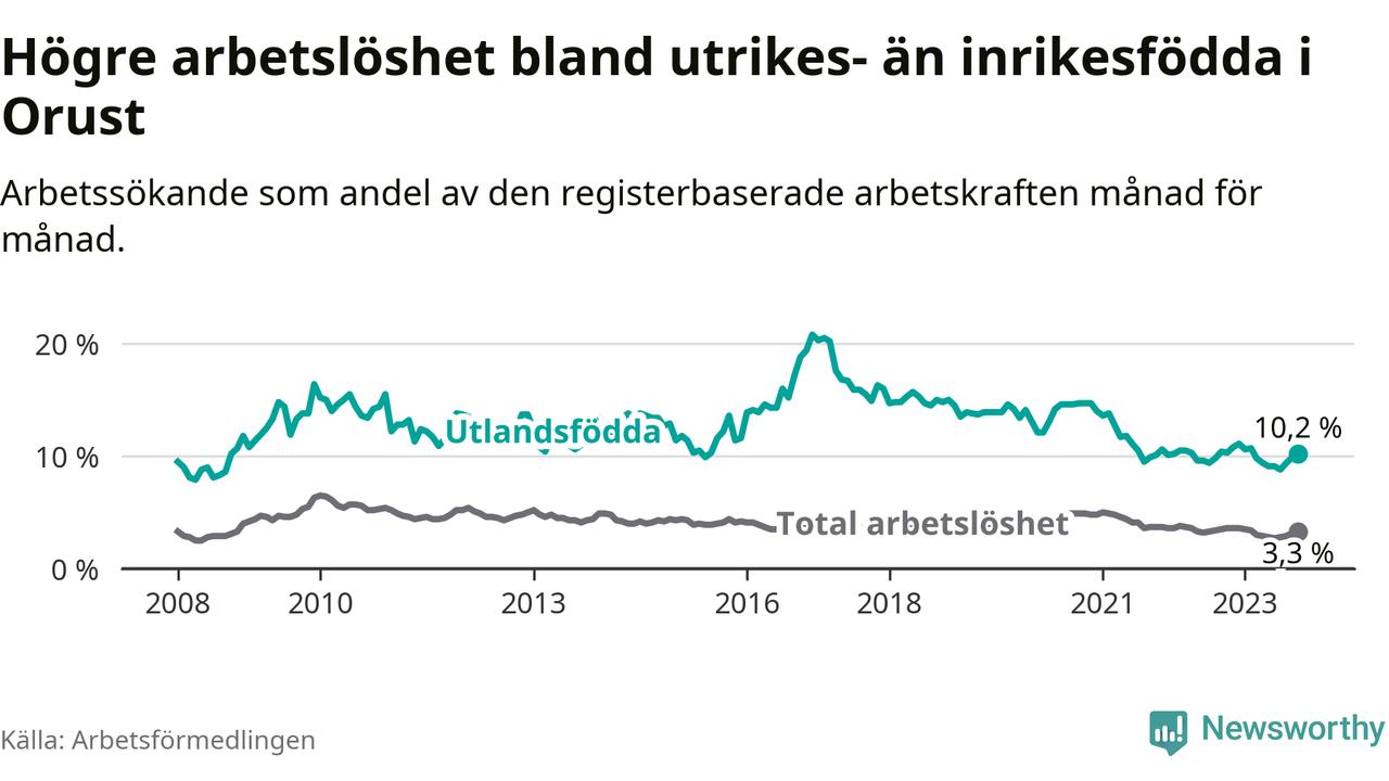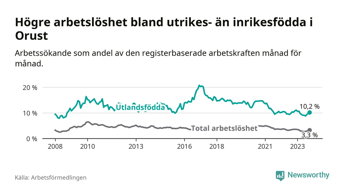 Skillnaden i arbetslöshet mellan utrikesfödda och hela befolkningen är 6,9 procentenheter på Orust.