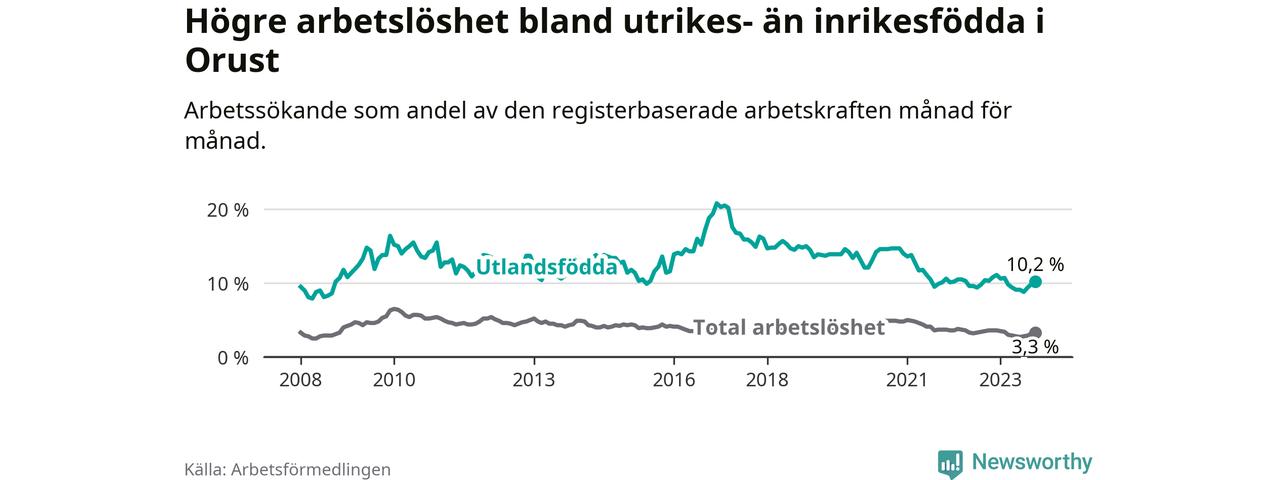 Arbetslösheten bland utlandsfödda var 10,2 procent på Orust under oktober månad, motsvarande 74 av 725 personer. Det är 0,1 procentenheter färre än vid samma tidpunkt i fjol (+3 om man räknar personer). Därmed är de utlandsföddas arbetslöshet lägre än vid samma tidpunkt i fjol för åttonde månaden i följd.