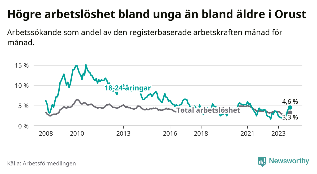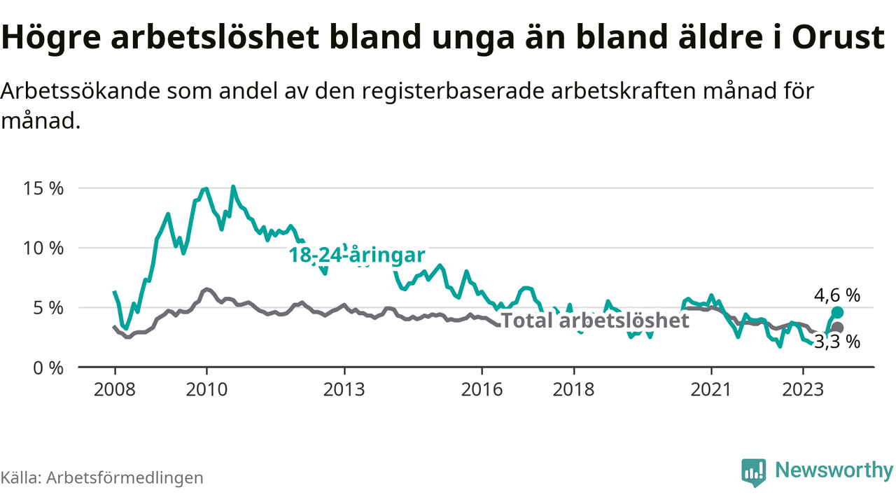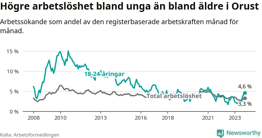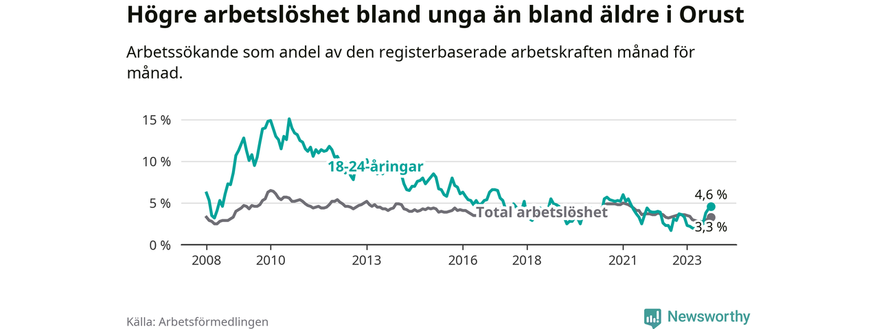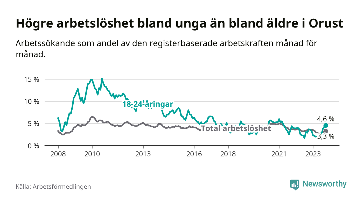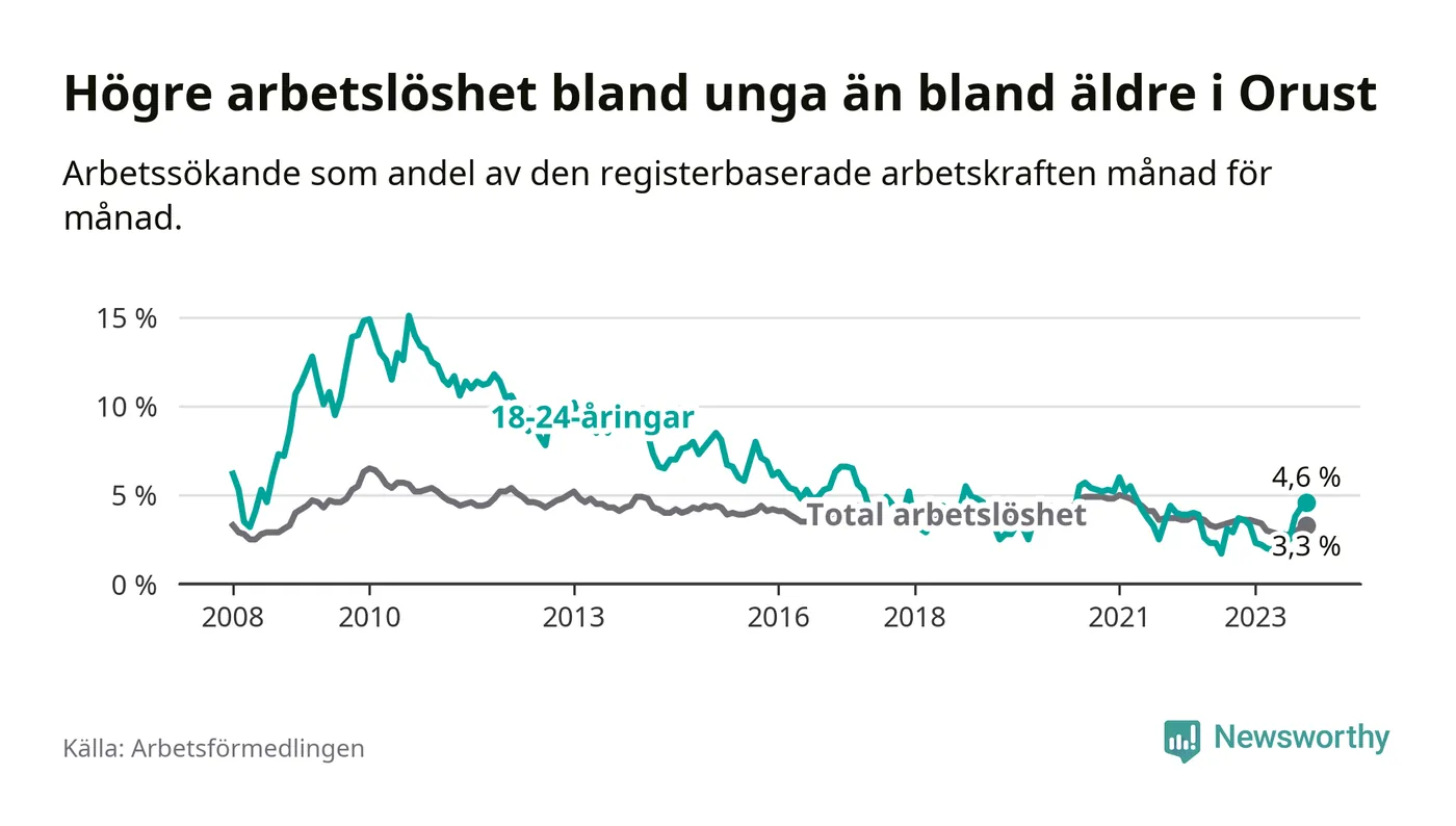 Till skillnad från den totala arbetslösheten stiger arbetslösheten bland unga (+0,9 procentenheter). I oktober var 4,6 procent av 18–24-åringarna inskrivna som arbetssökande (motsvarande 30 personer). Mäter vi antalet inskrivna ser vi en ökning med fem personer på ett års sikt.