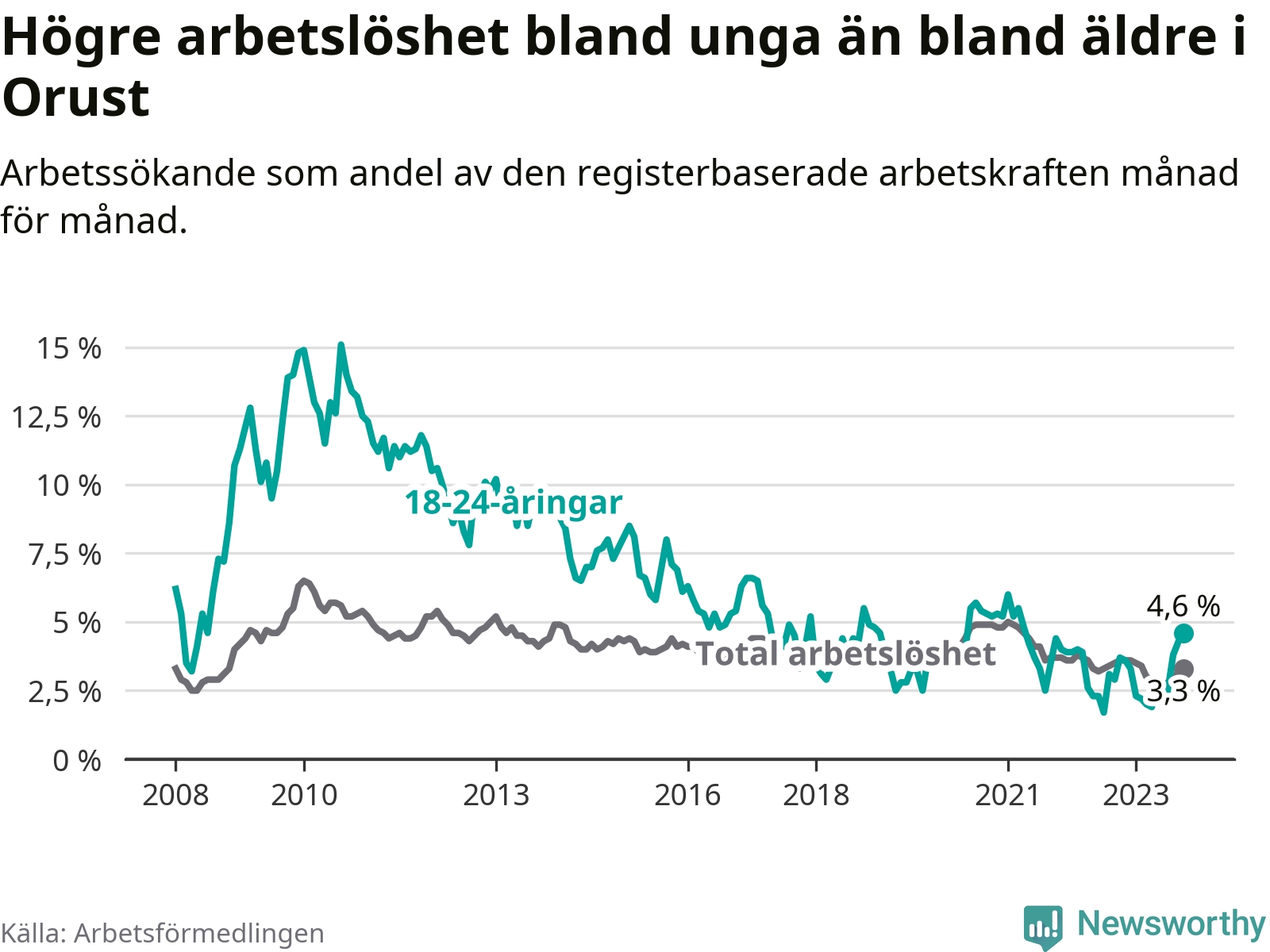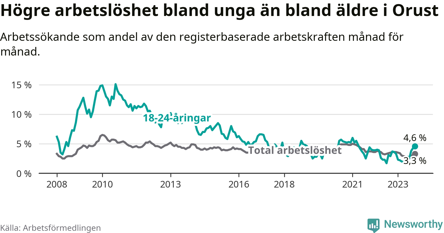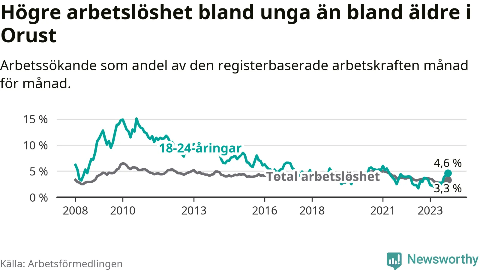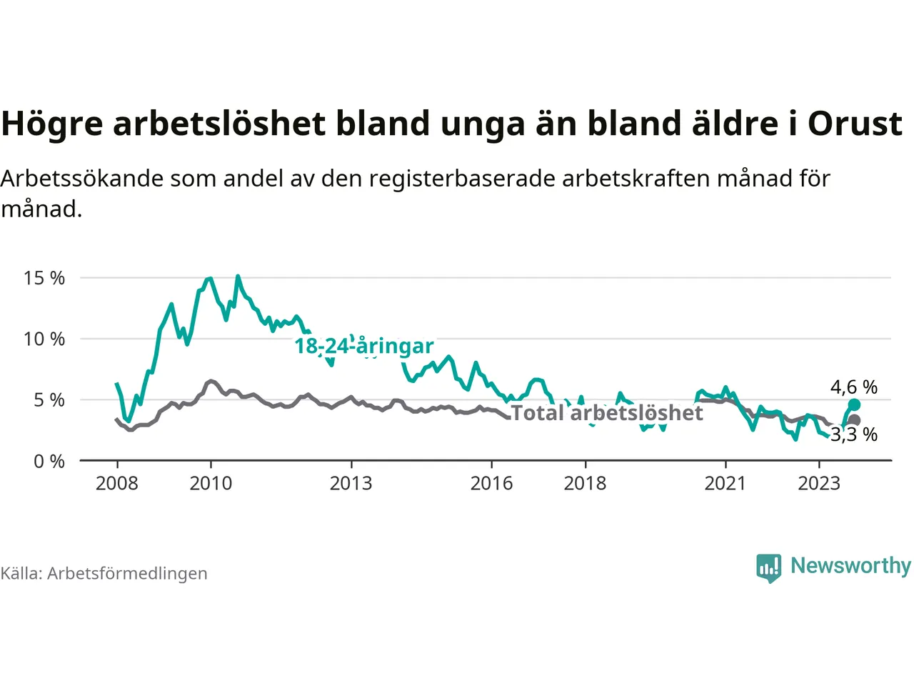 Till skillnad från den totala arbetslösheten stiger arbetslösheten bland unga (+0,9 procentenheter). I oktober var 4,6 procent av 18–24-åringarna inskrivna som arbetssökande (motsvarande 30 personer). Mäter vi antalet inskrivna ser vi en ökning med fem personer på ett års sikt.