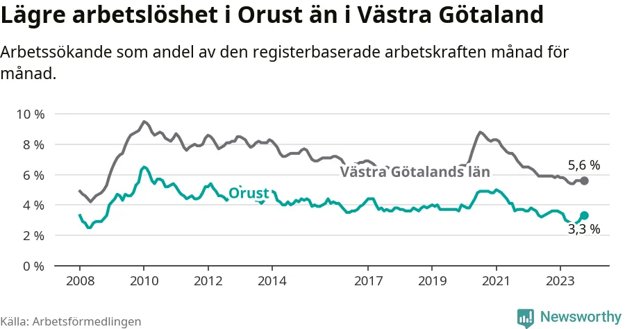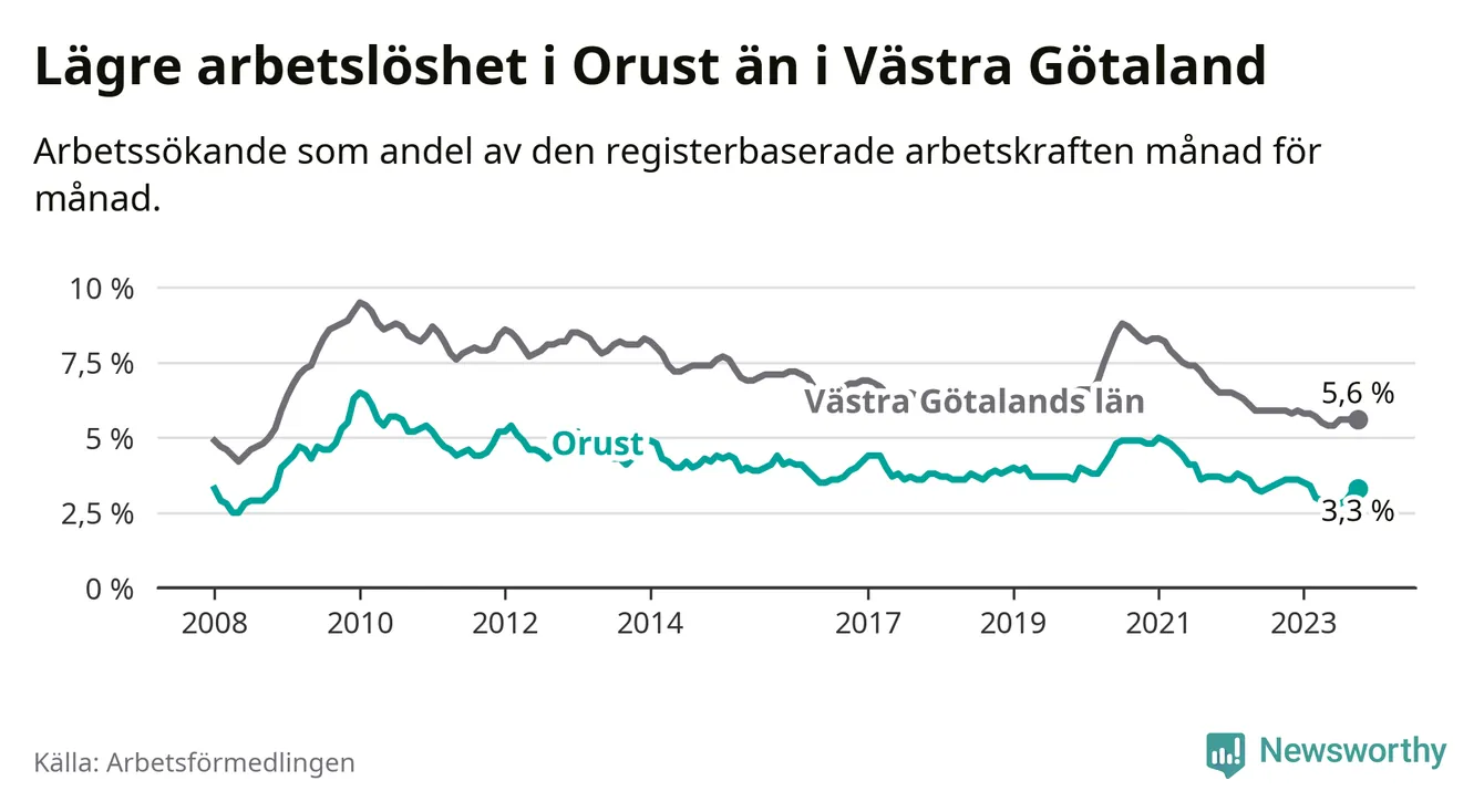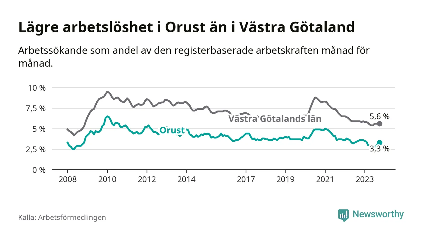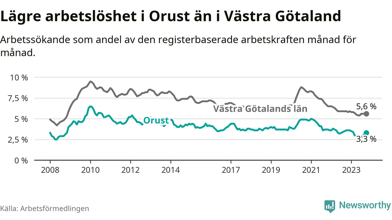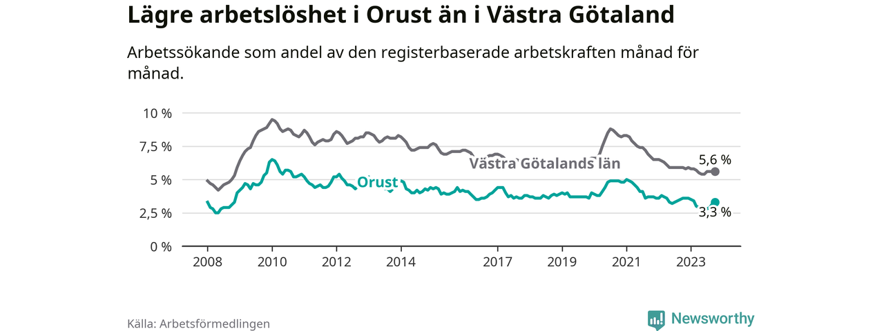 Graf: Arbetslöshet i Orusts kommun och Västra Götalands län