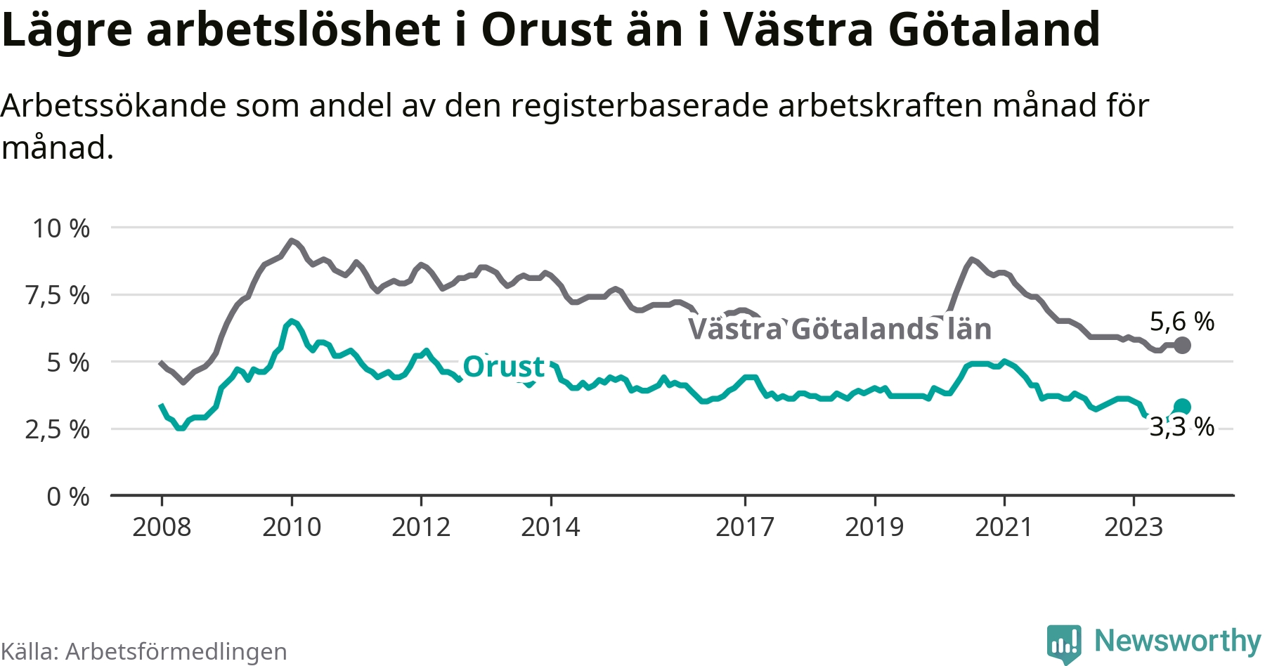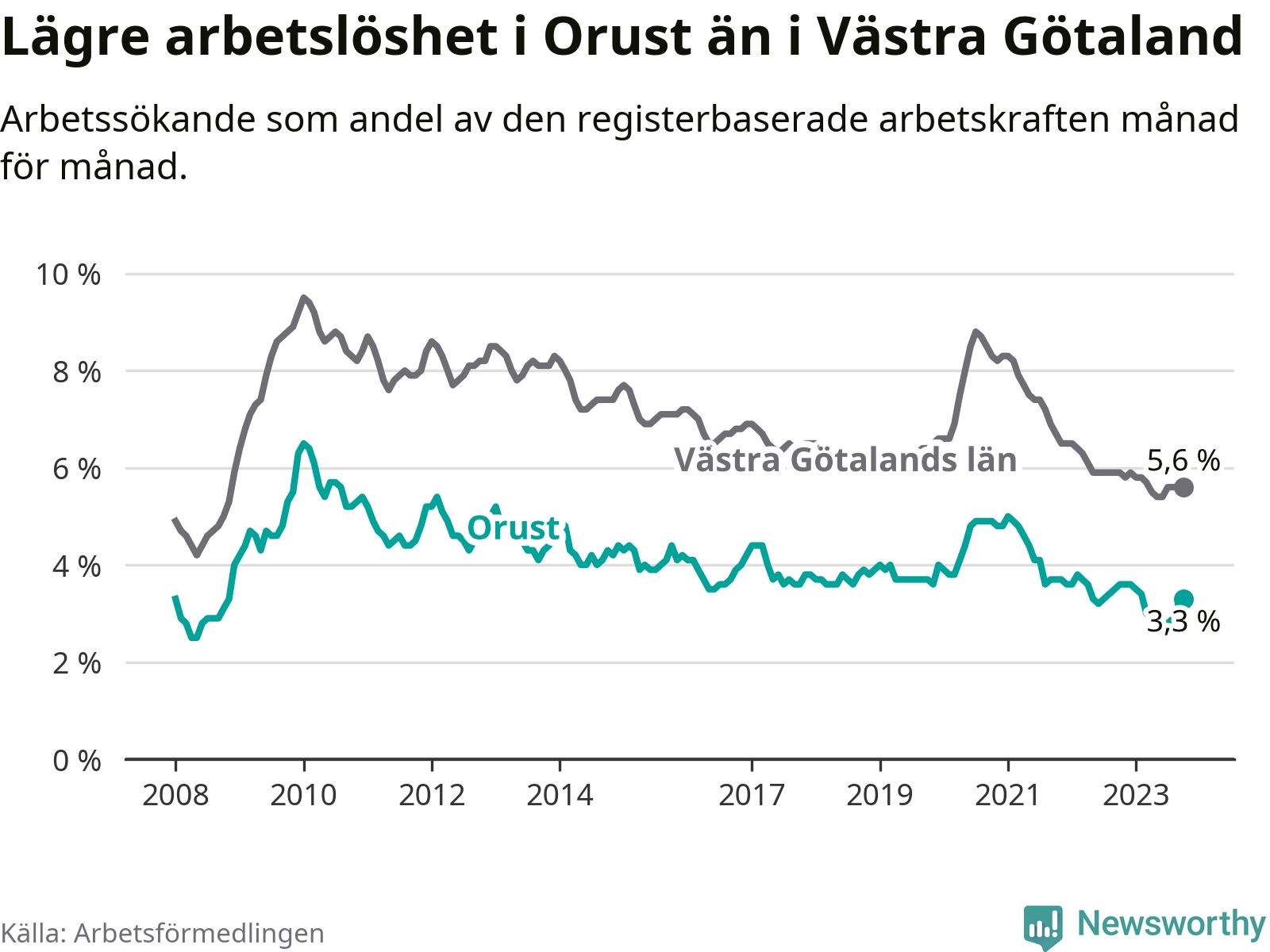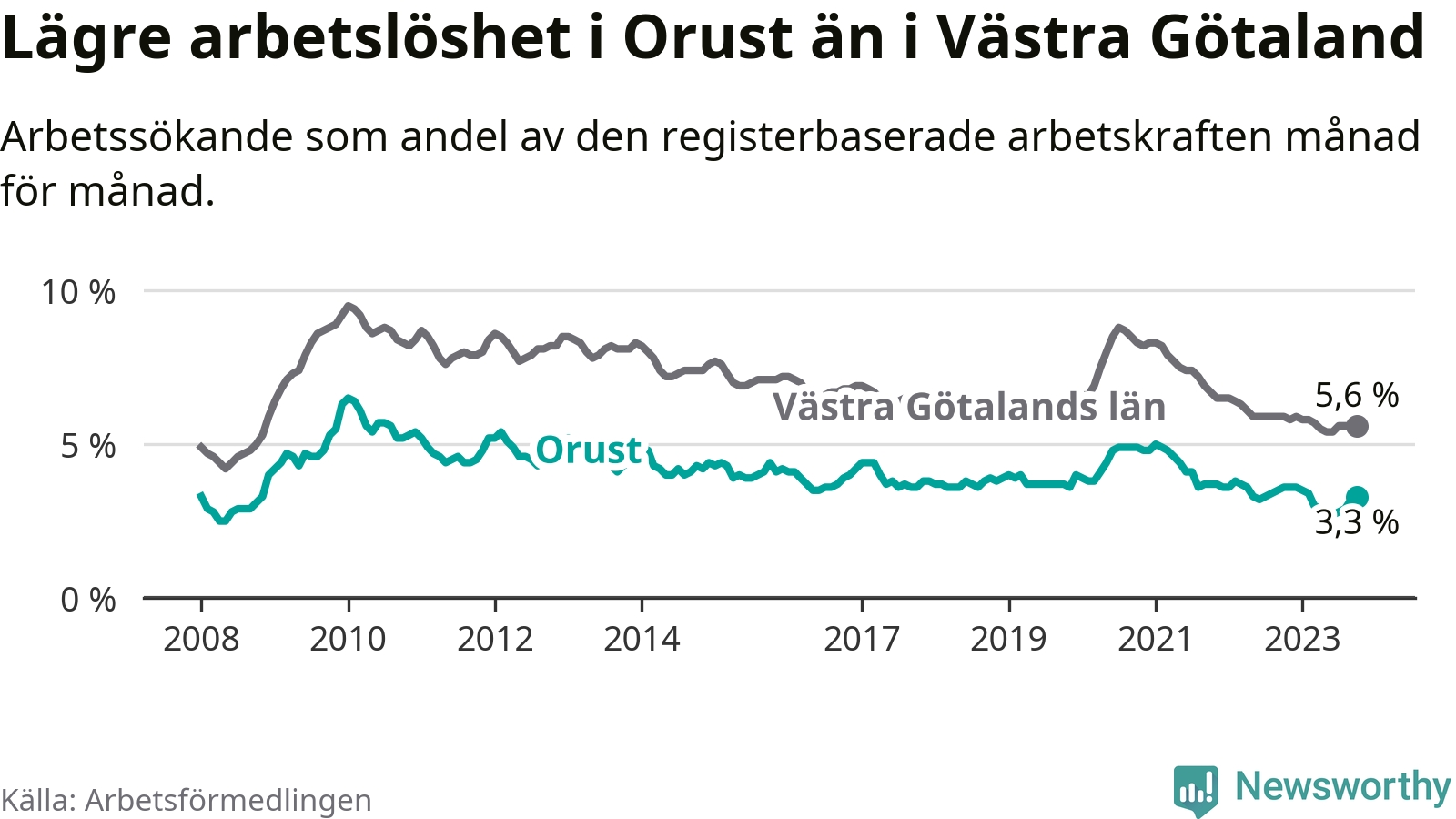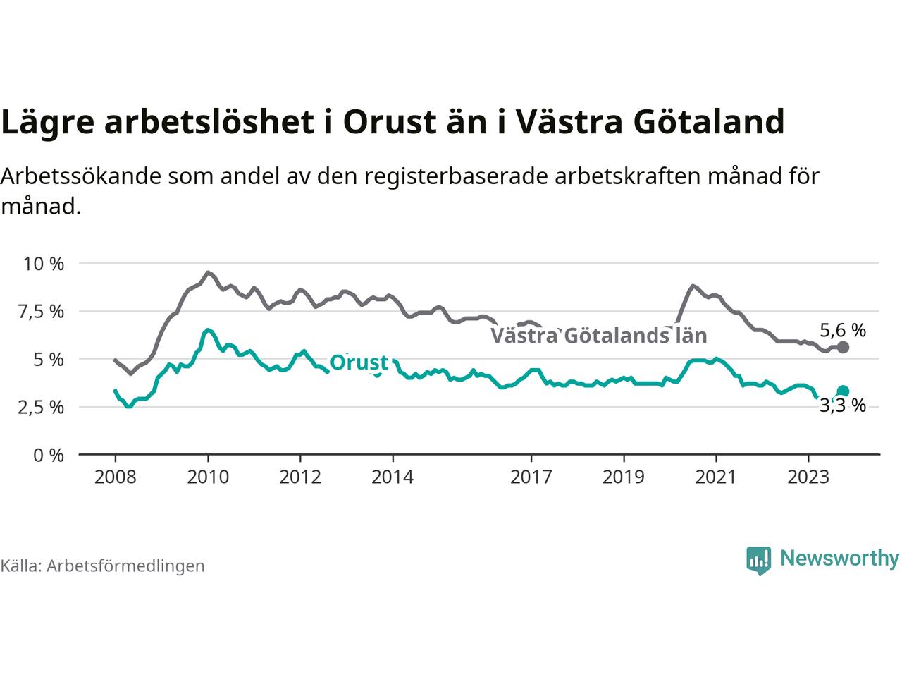Graf: Arbetslöshet i Orusts kommun och Västra Götalands län
