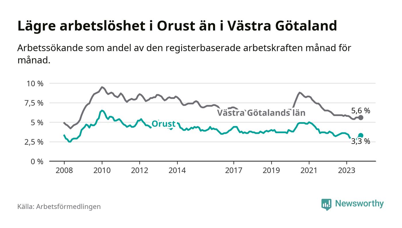 Orust hade redan tidigare lägre arbetslöshet än snittet i hela Västra Götalands län och nu växer klyftan (3,3 procent i kommunen, jämfört med 5,6 procent i hela länet). Öckerö har den lägsta arbetslösheten i länet (2,4 procent), medan Trollhättan har den högsta (8,4 procent). För att Orust skulle komma ner i samma arbetslöshetsnivå som Öckerö skulle 63 personer behöva sysselsättas.