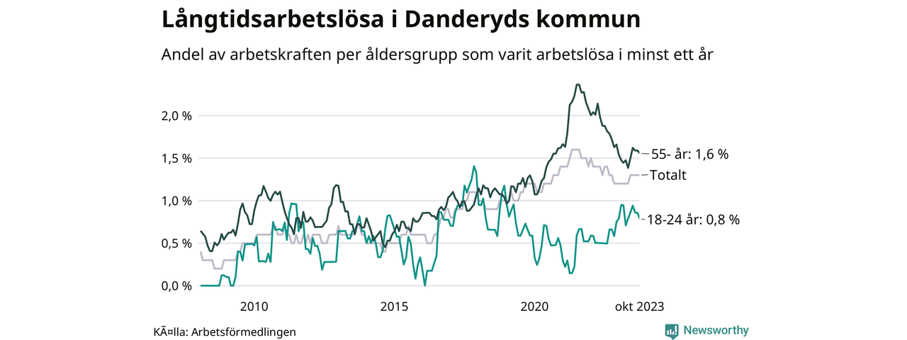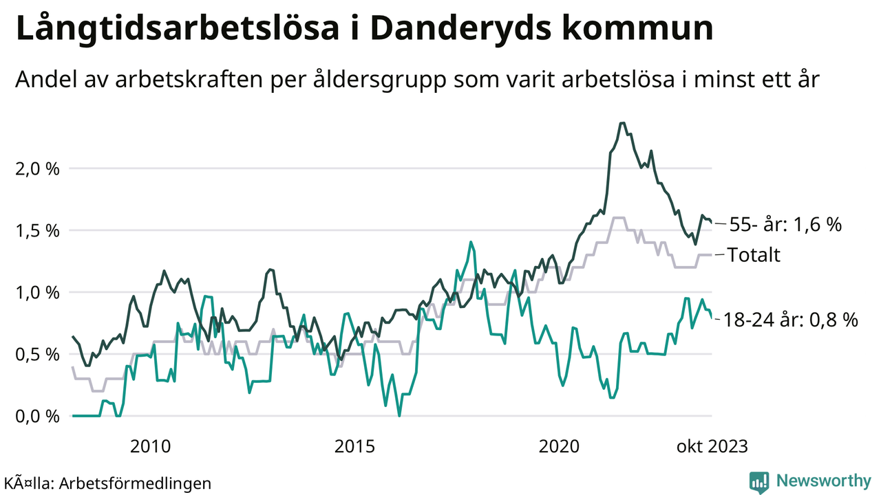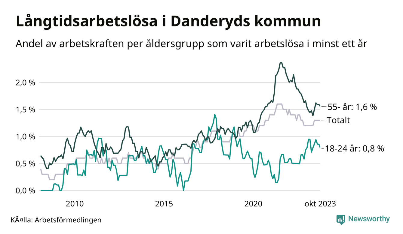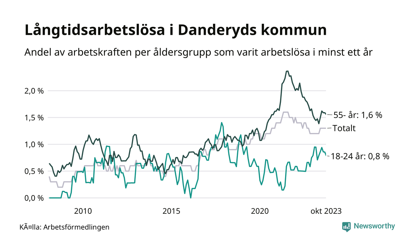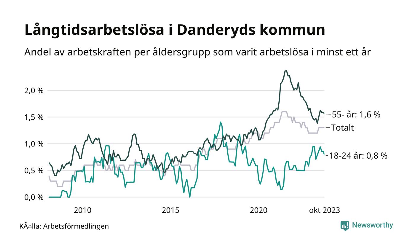 Av de 192 personerna som varit arbetslösa i mer än ett år i Danderyds kommun är 53 personer mellan 55 och 651 år och tio är mellan 18 och 24 år. För den äldre gruppen är andelen arbetslösa 1,6 procent medan den i den yngre gruppen är 0,8 procent. Även i riket som helhet är långtidsarbetslösheten högre i gruppen äldre.