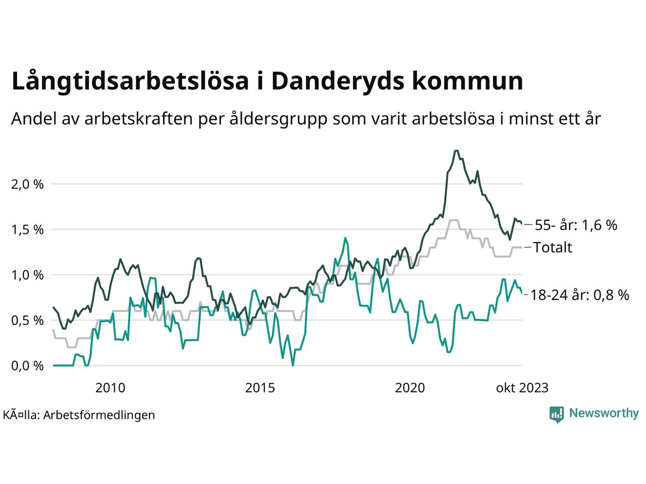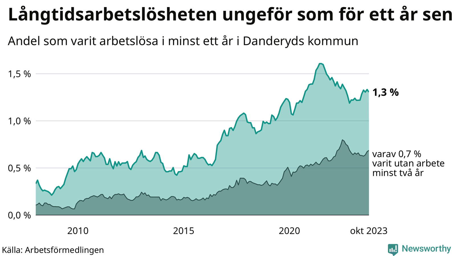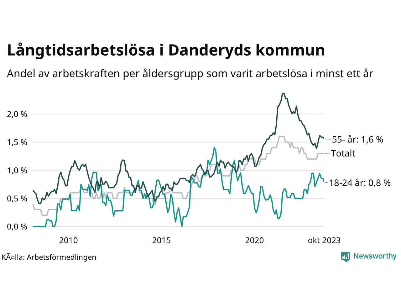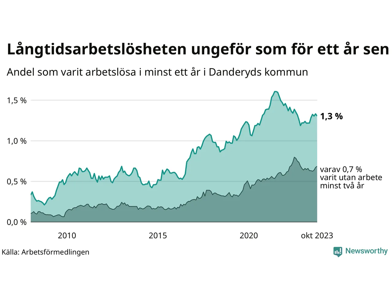 Andel arbetslösa i minst två år | 0,7 % | 1,5 % | 1,6 % |