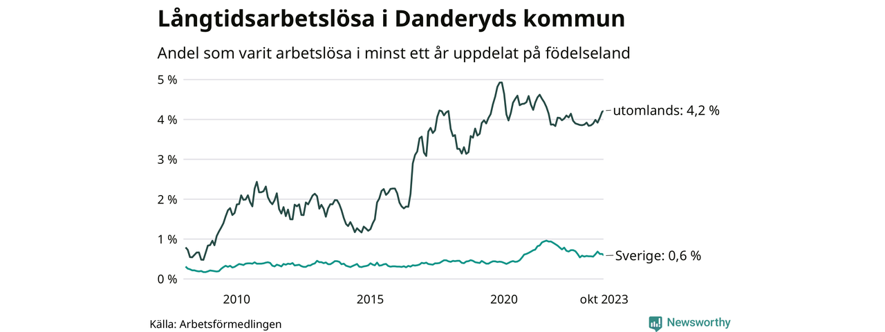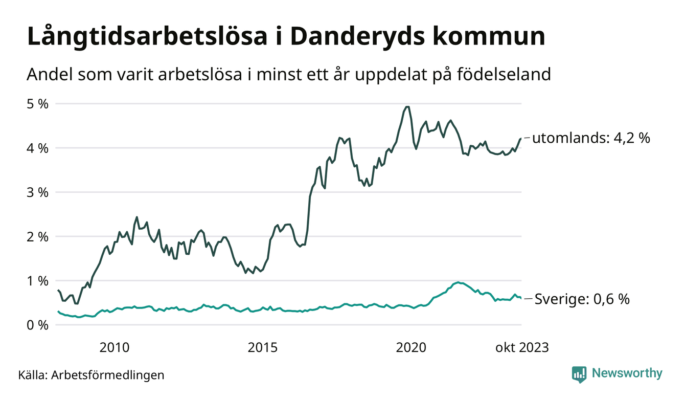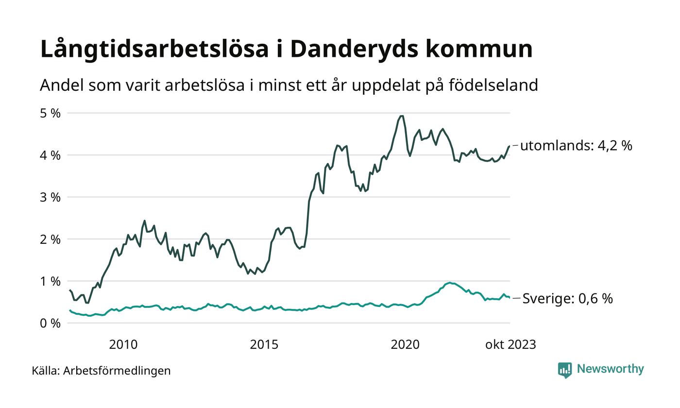 69 av de långtidsarbetslösa i Danderyd är födda i Sverige, medan 123 är födda utomlands. Det innebär att långtidsarbetslösheten bland Sverigefödda är 0,6 procent, medan den är sju gånger så hög – 4,2 procent – bland födda utomlands. Även i riket som helhet är arbetslösheten högre bland utrikesfödda.