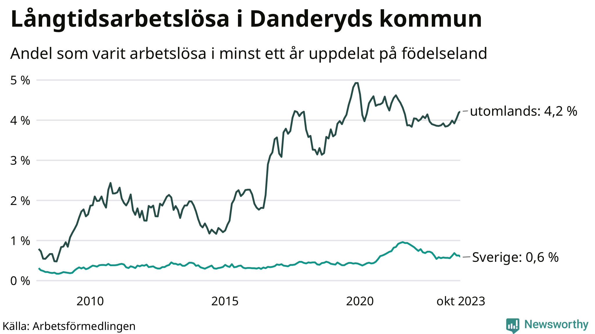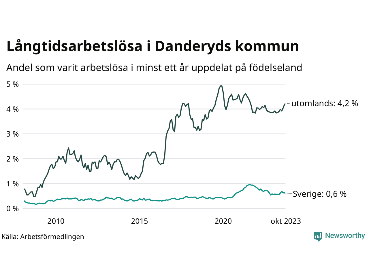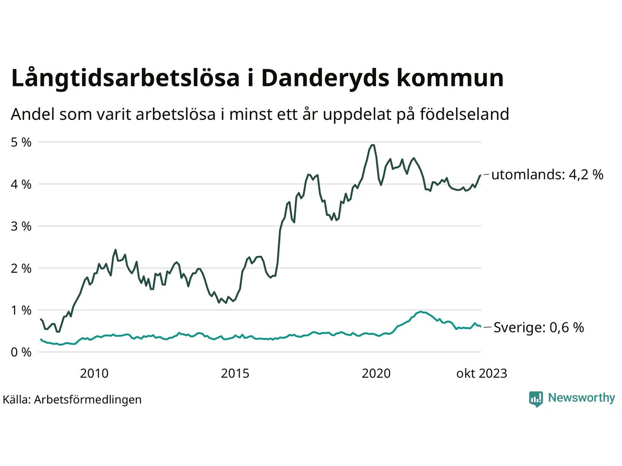 69 av de långtidsarbetslösa i Danderyd är födda i Sverige, medan 123 är födda utomlands. Det innebär att långtidsarbetslösheten bland Sverigefödda är 0,6 procent, medan den är sju gånger så hög – 4,2 procent – bland födda utomlands. Även i riket som helhet är arbetslösheten högre bland utrikesfödda.