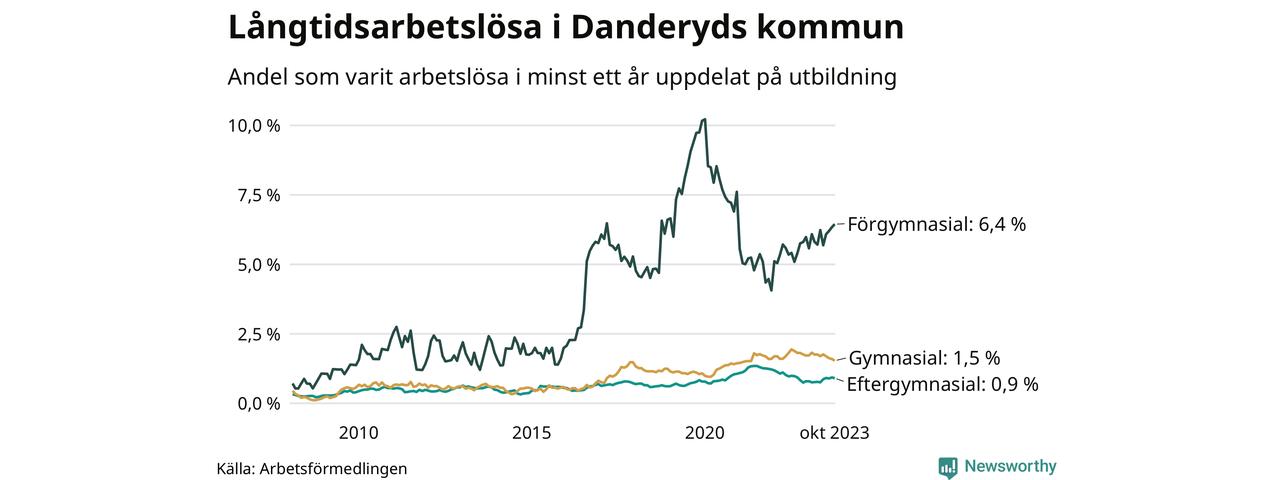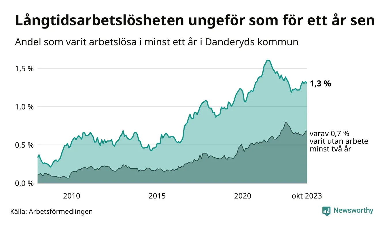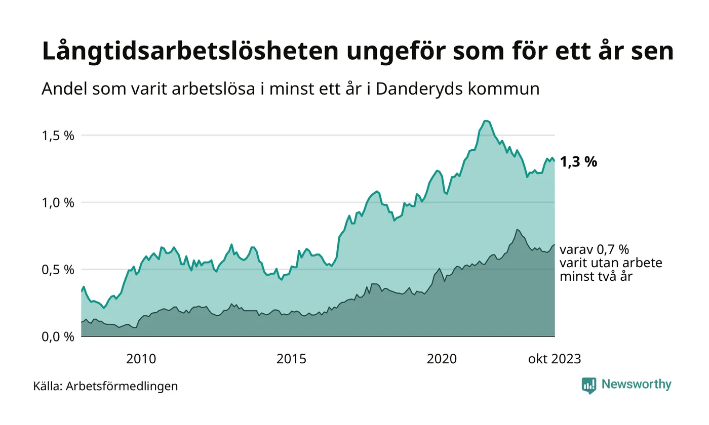 I oktober hade 192 Danderydsbor varit arbetslösa i minst ett år, vilket är fyra färre än månaden innan. 192 personer motsvarar 1,3 procent av arbetskraften i kommunen – andelen långtidsarbetslösa är ungefär på samma nivå som för ett år sedan.