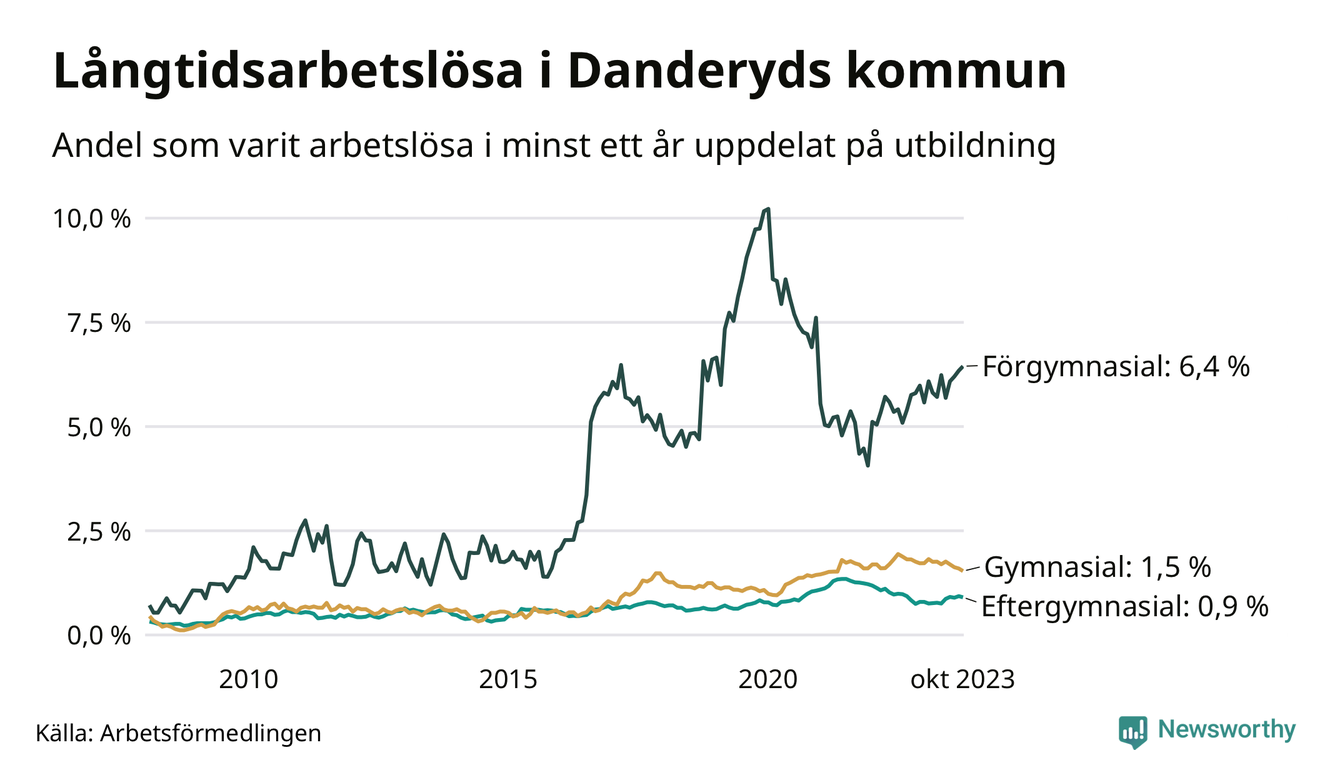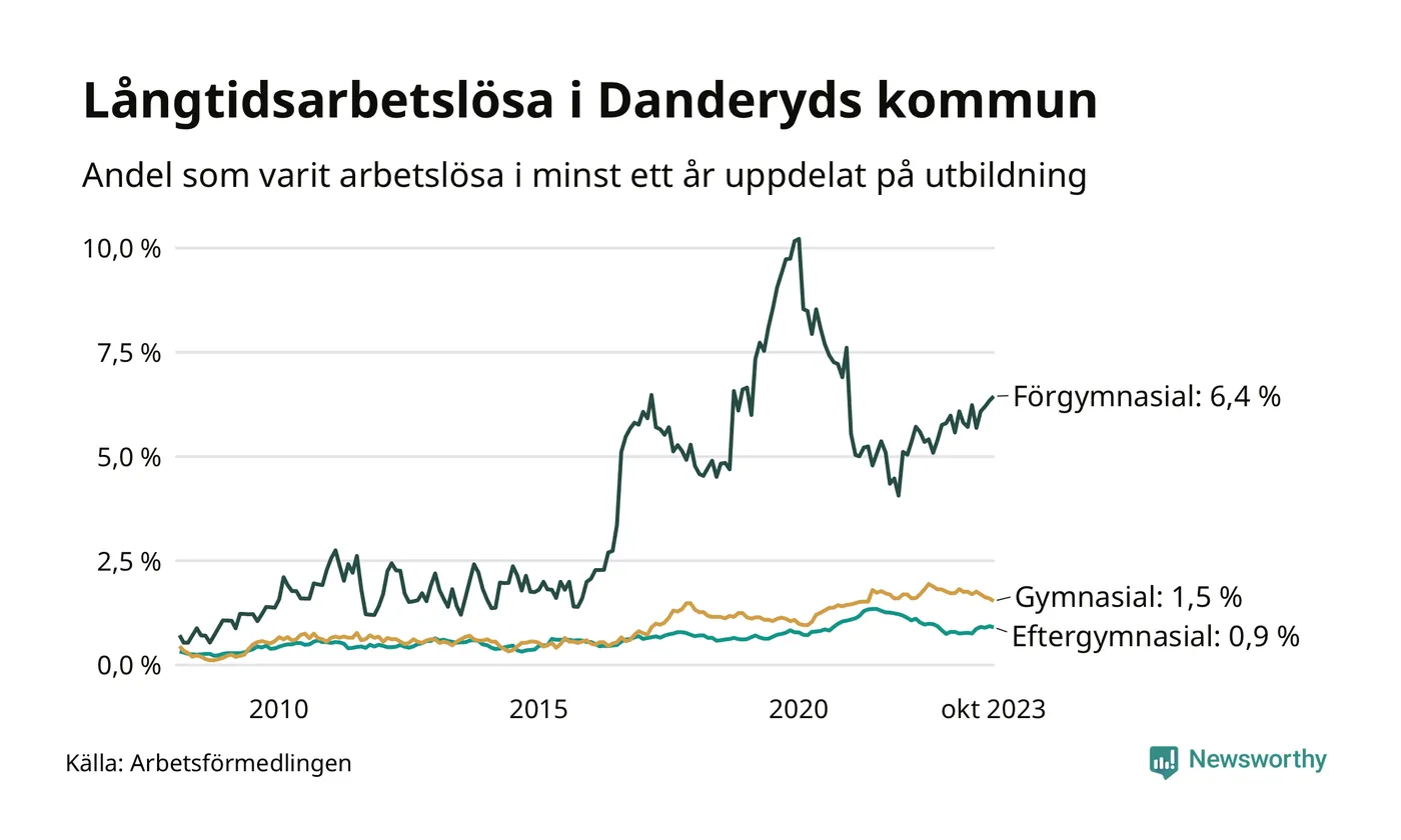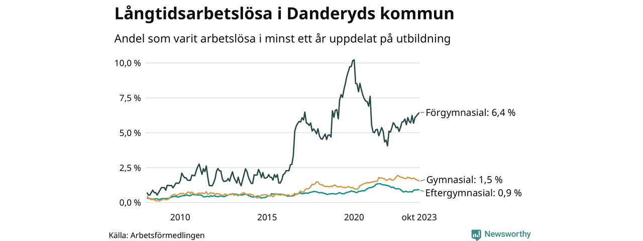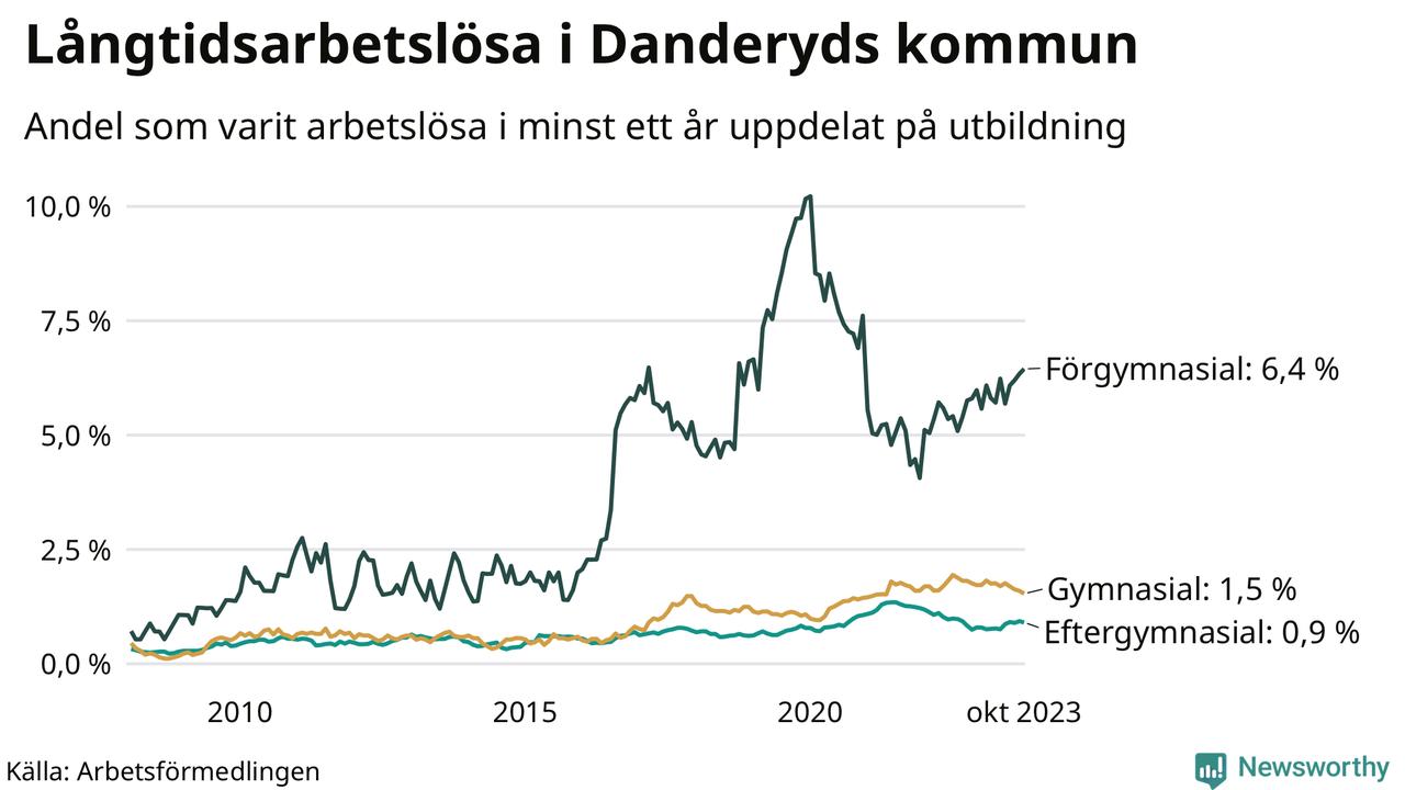 I oktober hade 192 Danderydsbor varit arbetslösa i minst ett år, vilket är fyra färre än månaden innan. 192 personer motsvarar 1,3 procent av arbetskraften i kommunen – andelen långtidsarbetslösa är ungefär på samma nivå som för ett år sedan.