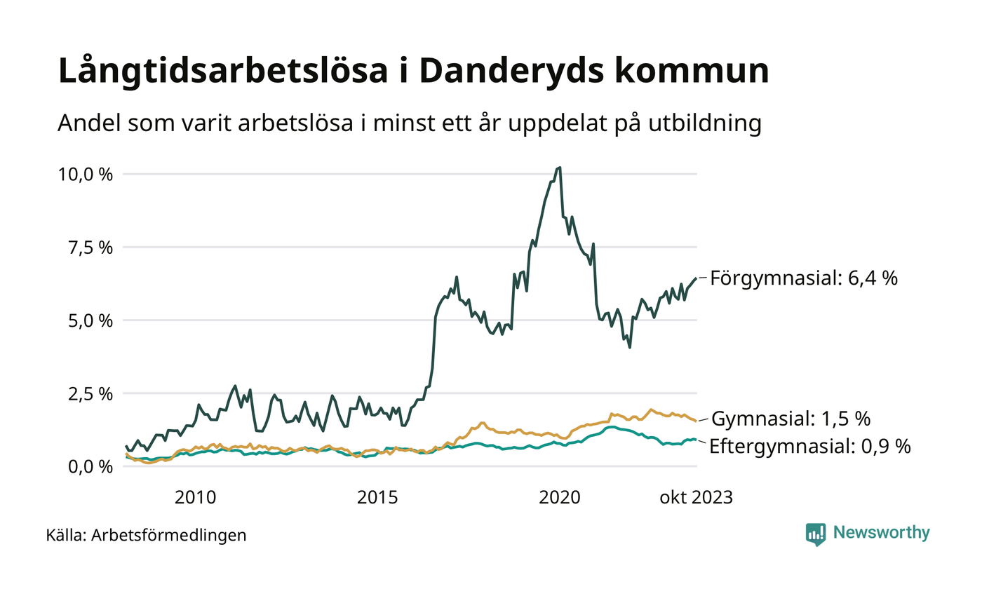 Även när det gäller utbildningsnivå är skillnaderna stora. 49 av de som varit arbetslösa i minst ett år har inte någon gymnasieutbildning, vilket motsvarar en långtidsarbetslöhet på 6,4 procent i den gruppen. Det kan jämföras med 1,5 procent bland dem som gått ut gymnasiet och 0,9 procent bland dem som studerat vidare efter gymnasiet.