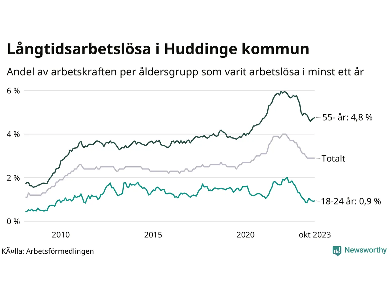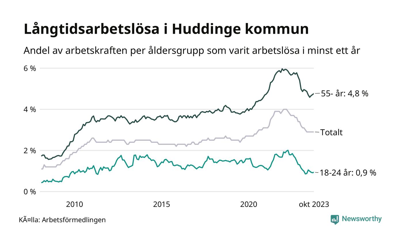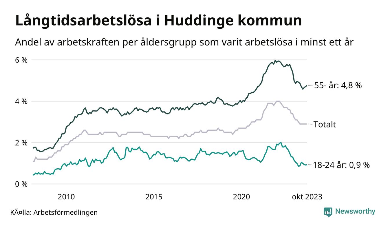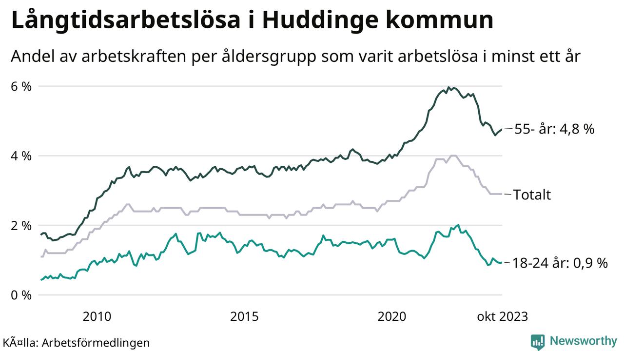 Av de 1 737 personerna som varit arbetslösa i mer än ett år i Huddinge kommun är 520 personer mellan 55 och 651 år och 52 är mellan 18 och 24 år. För den äldre gruppen är andelen arbetslösa 4,8 procent medan den i den yngre gruppen är 0,9 procent. Även i riket som helhet är långtidsarbetslösheten högre i gruppen äldre.