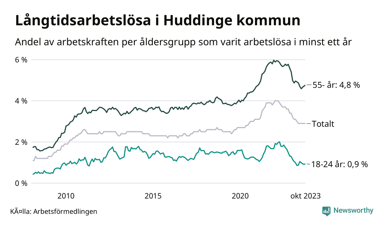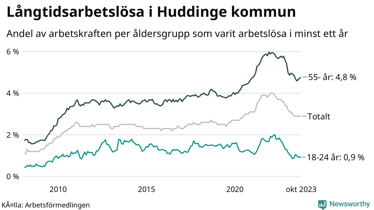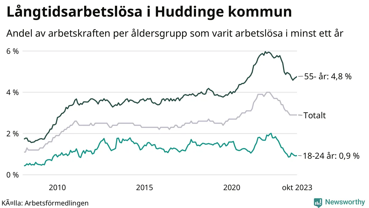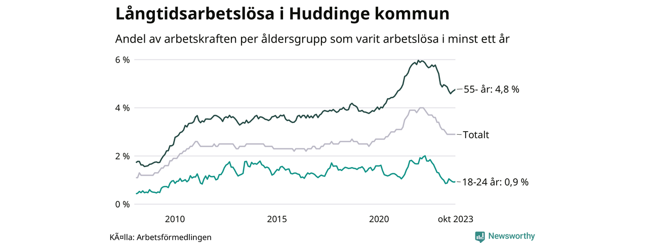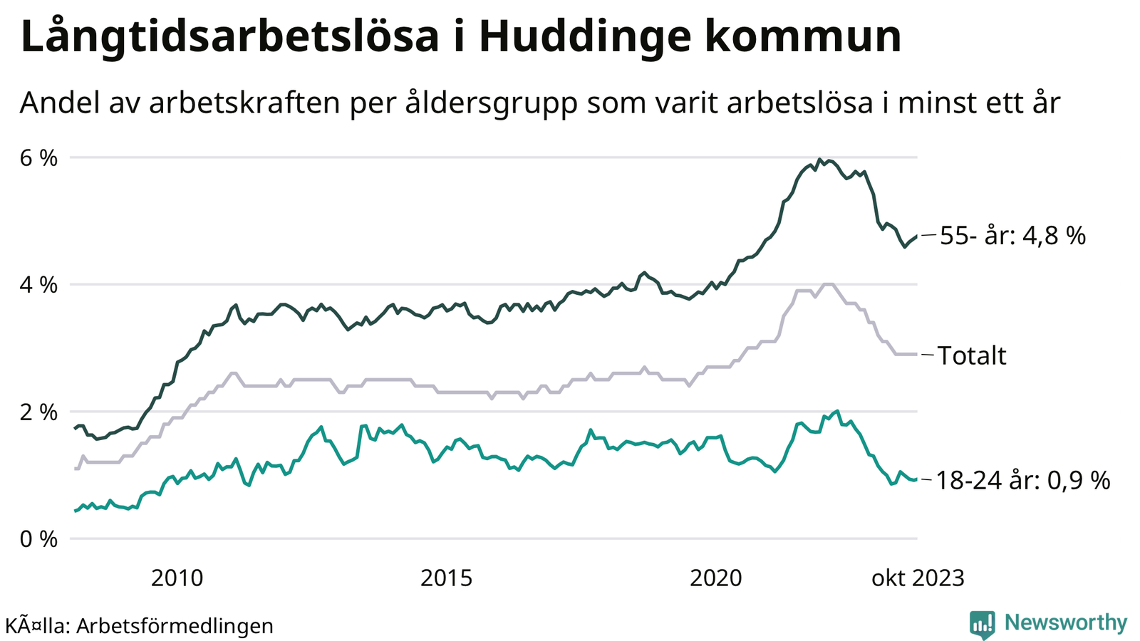 Av de 1 737 personerna som varit arbetslösa i mer än ett år i Huddinge kommun är 520 personer mellan 55 och 651 år och 52 är mellan 18 och 24 år. För den äldre gruppen är andelen arbetslösa 4,8 procent medan den i den yngre gruppen är 0,9 procent. Även i riket som helhet är långtidsarbetslösheten högre i gruppen äldre.