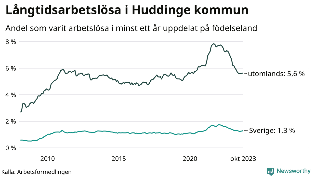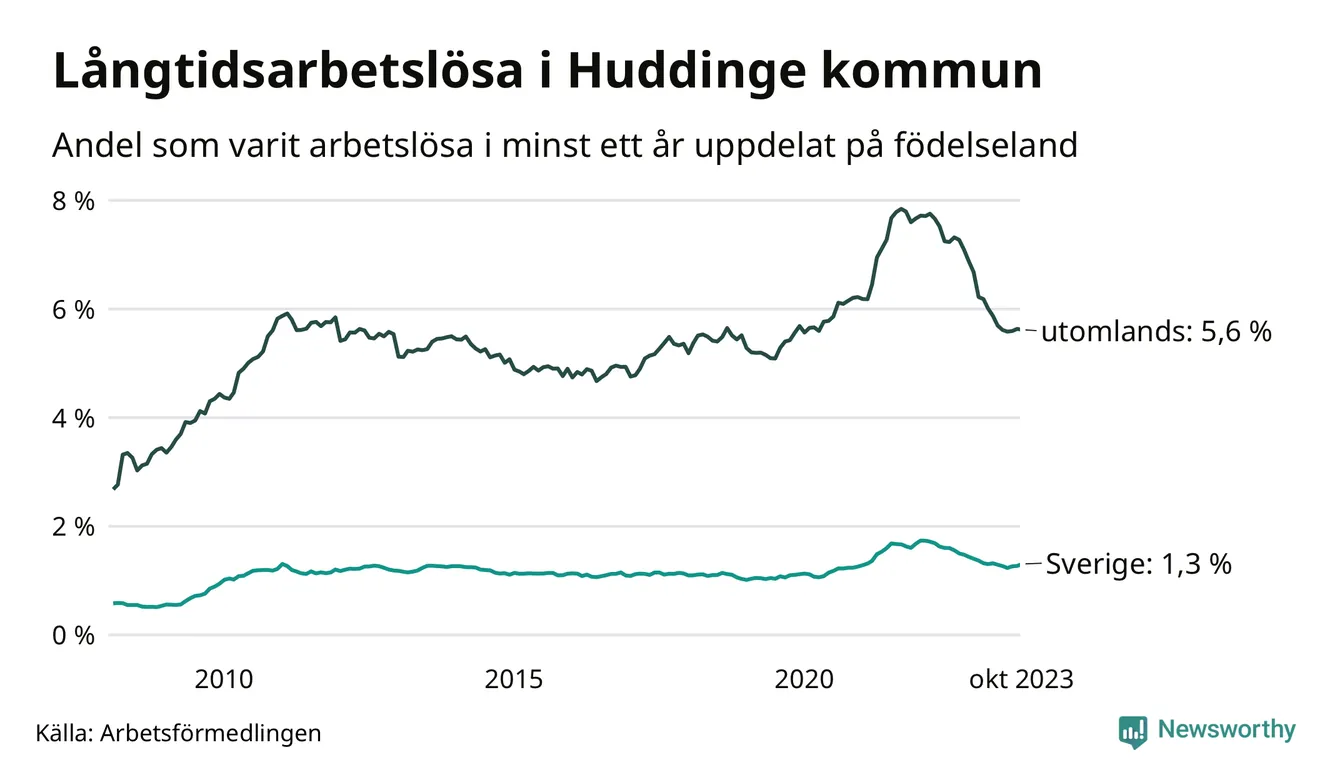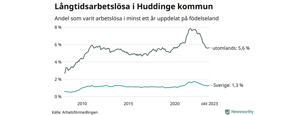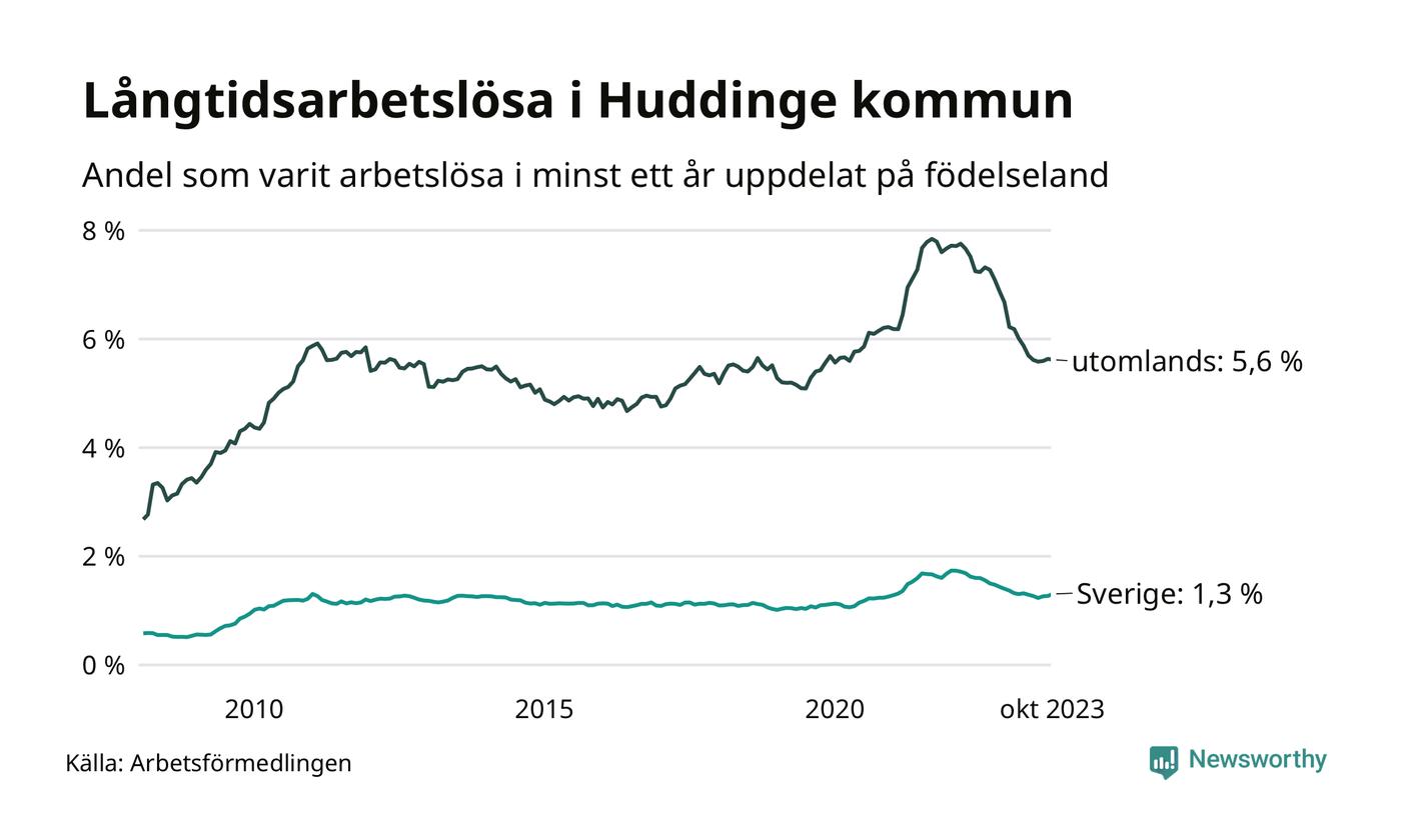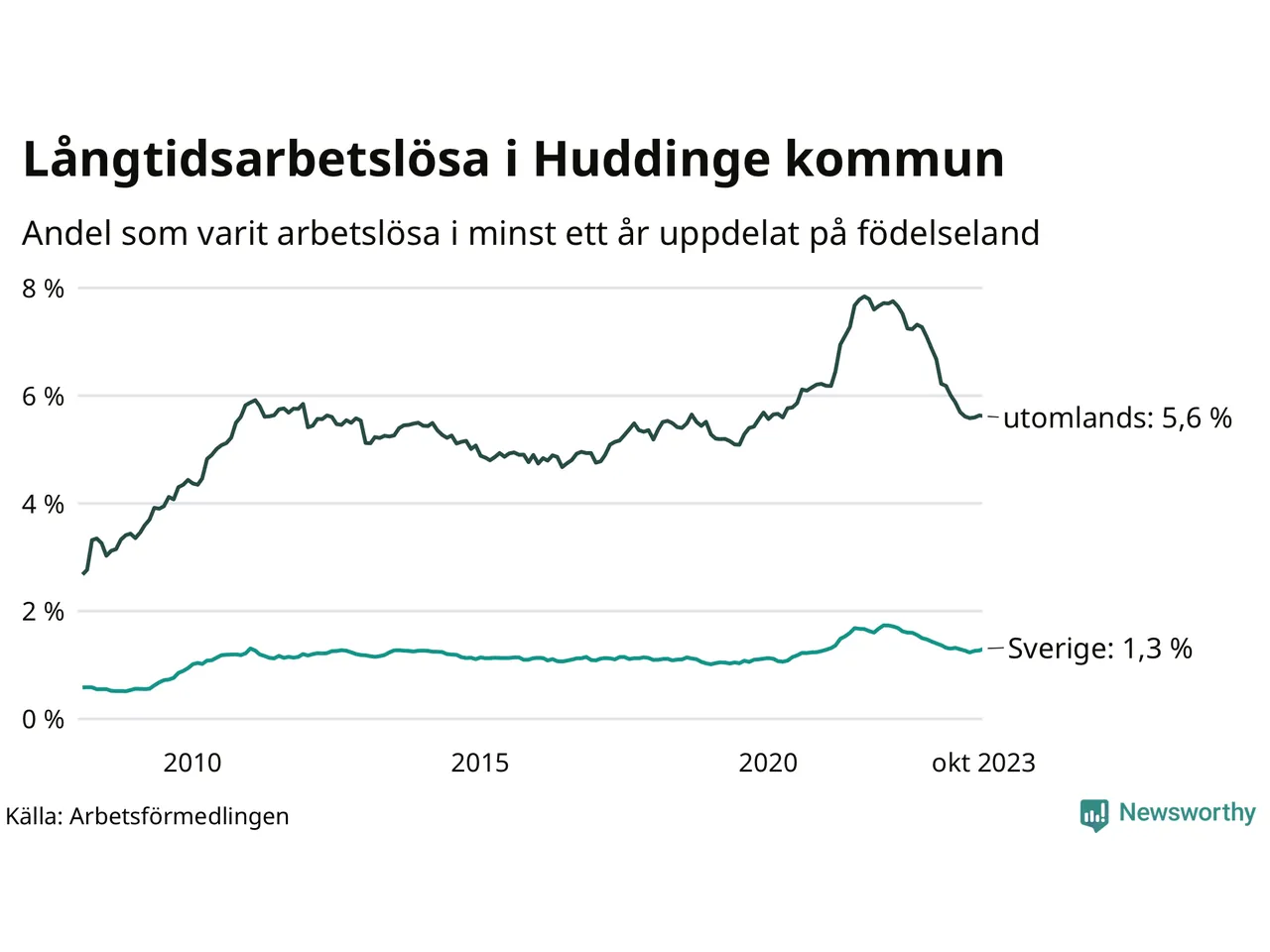486 av de långtidsarbetslösa i Huddinge är födda i Sverige, medan 1 251 är födda utomlands. Det innebär att långtidsarbetslösheten bland Sverigefödda är 1,3 procent, medan den är fyra gånger så hög – 5,6 procent – bland födda utomlands. Även i riket som helhet är arbetslösheten högre bland utrikesfödda.