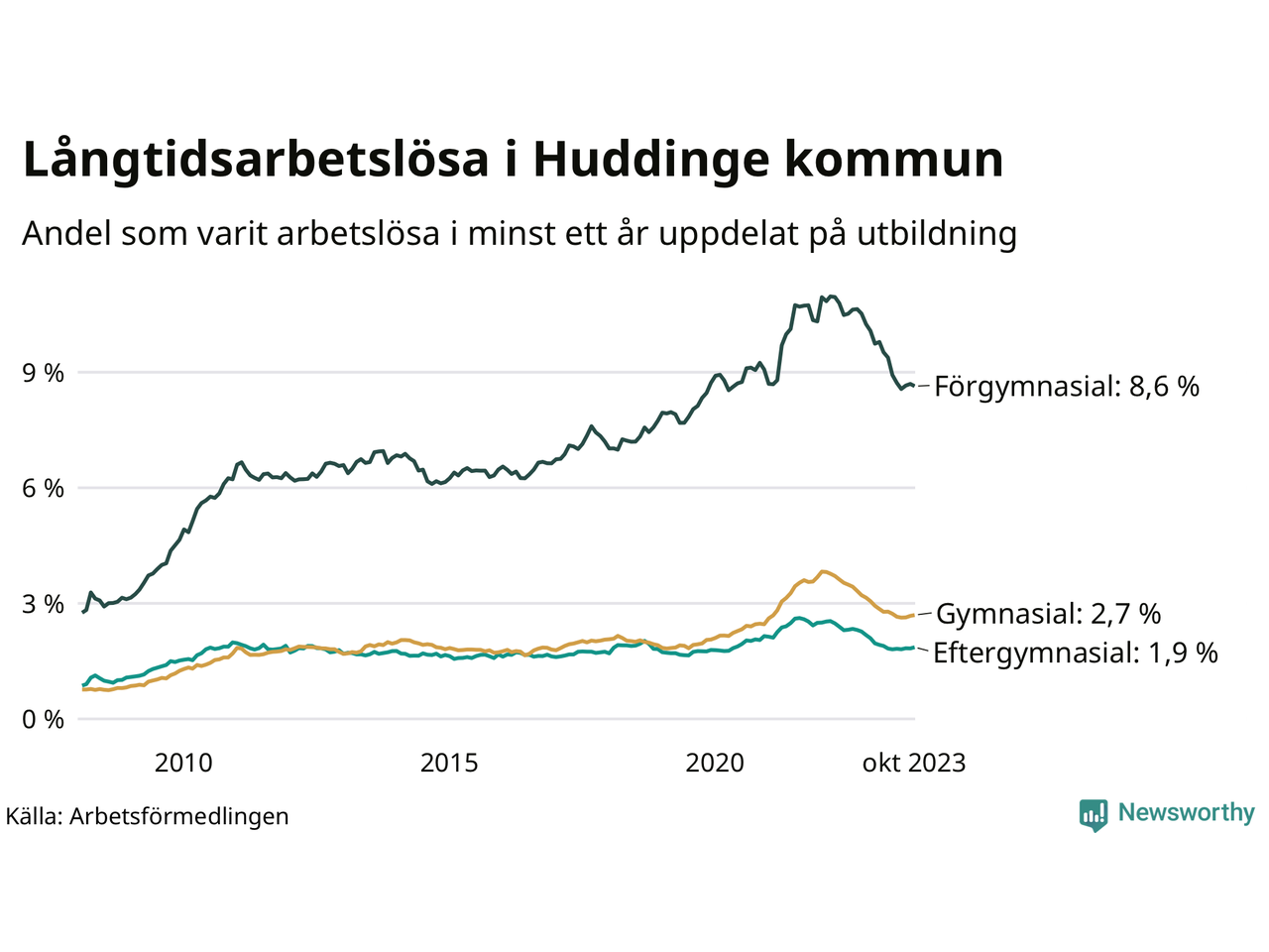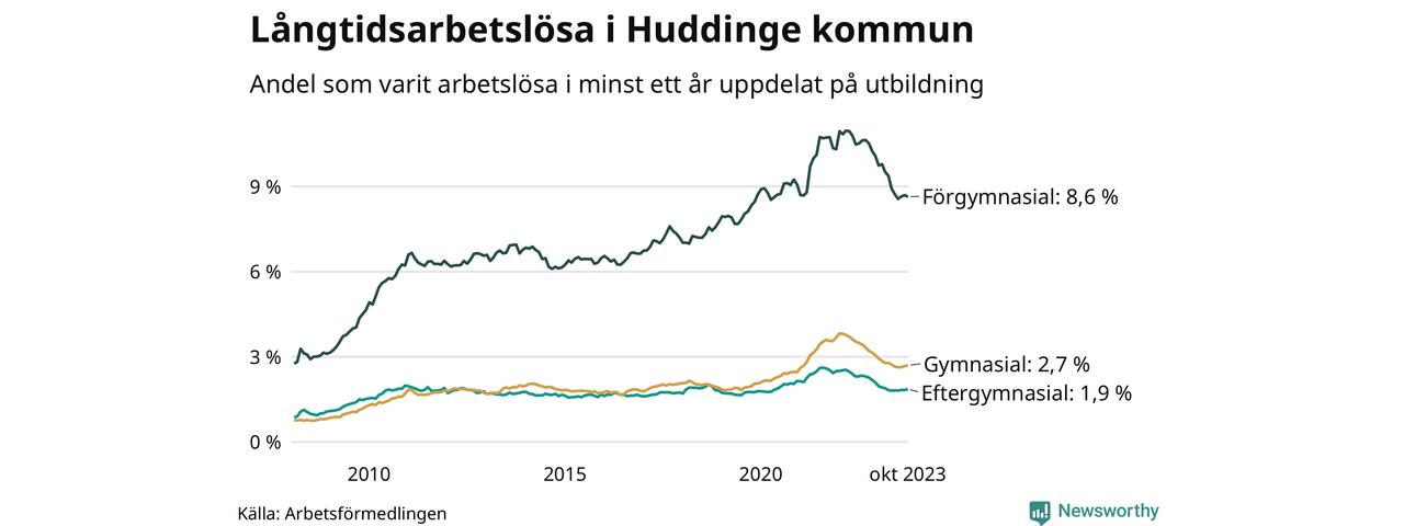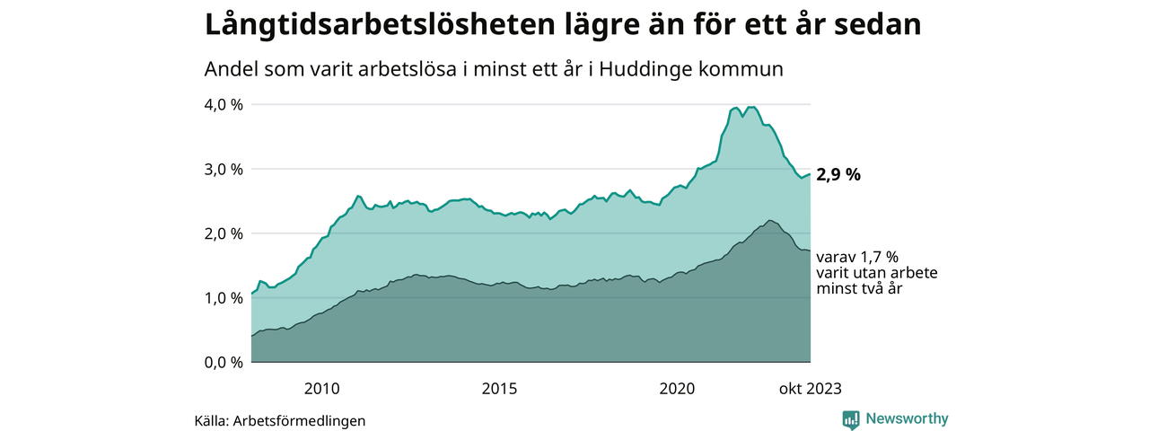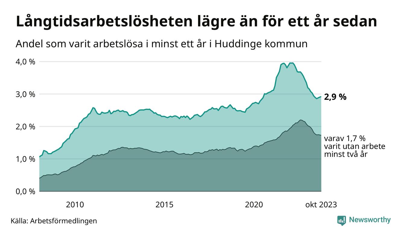 I oktober hade 1 737 Huddingebor varit arbetslösa i minst ett år, vilket är tio fler än månaden innan. 1 737 personer motsvarar 2,9 procent av arbetskraften i kommunen – andelen långtidsarbetslösa är 0,7 procentenheter lägre än samma månad för ett år sedan.