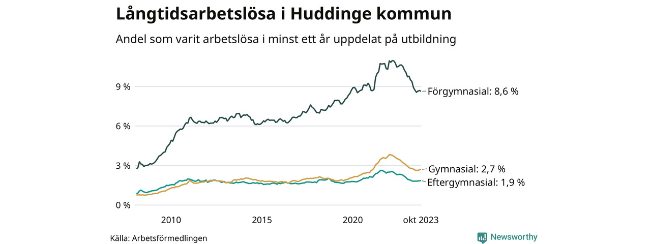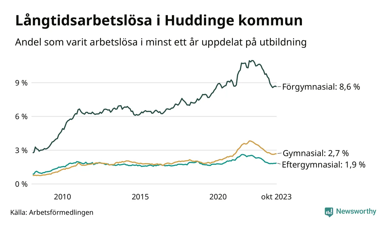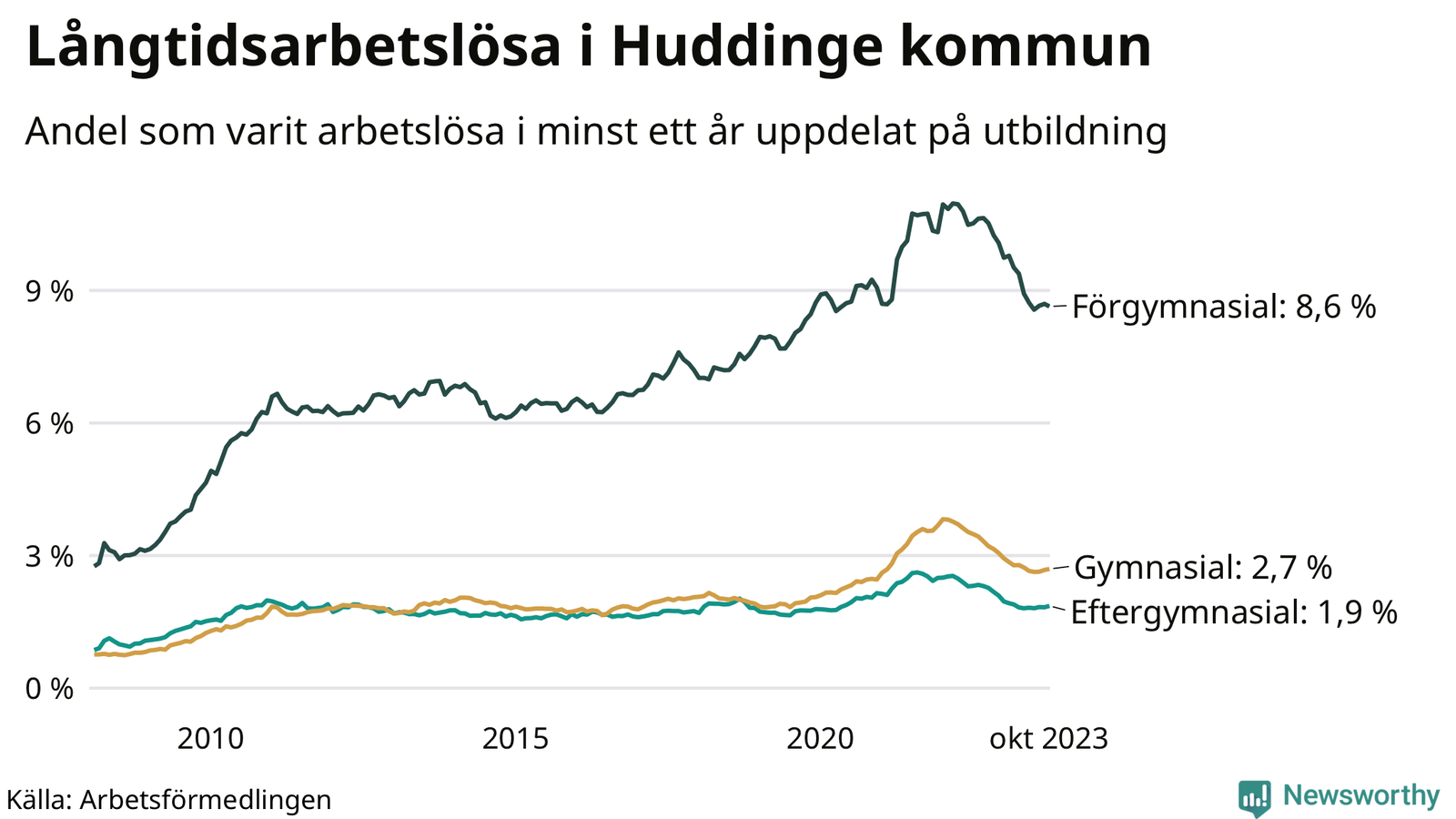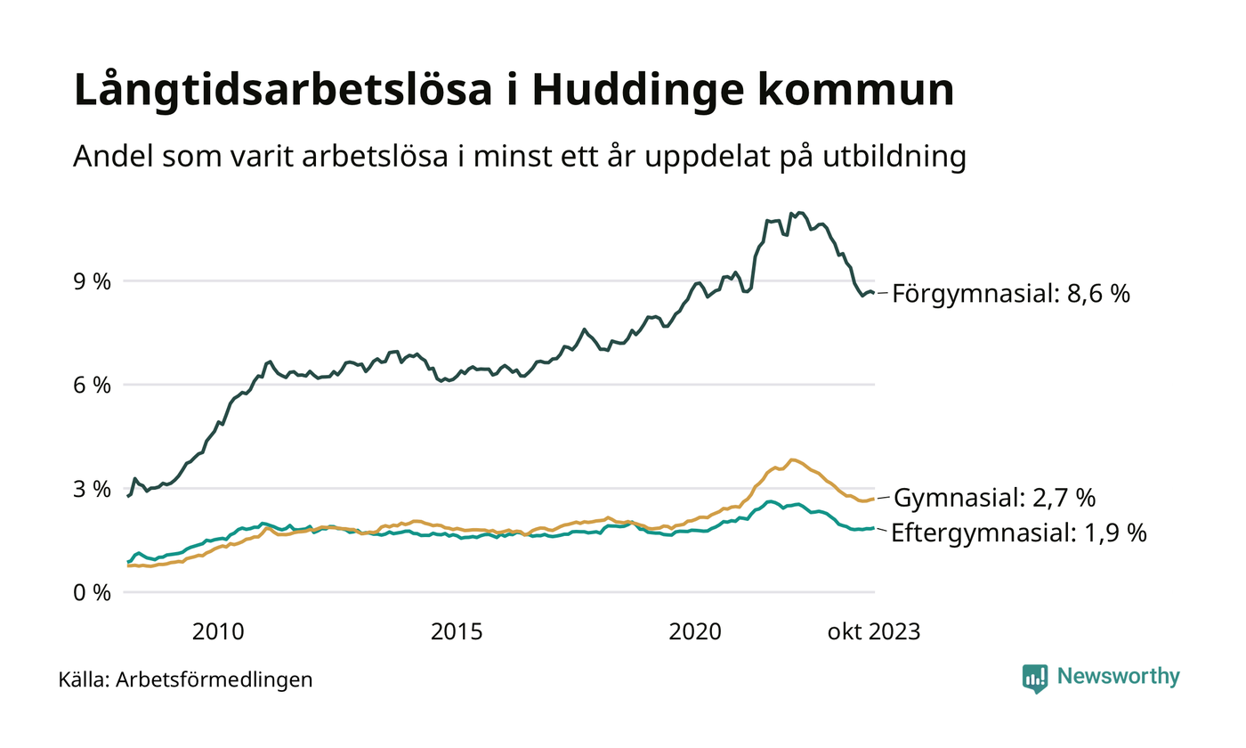 I oktober hade 1 737 Huddingebor varit arbetslösa i minst ett år, vilket är tio fler än månaden innan. 1 737 personer motsvarar 2,9 procent av arbetskraften i kommunen – andelen långtidsarbetslösa är 0,7 procentenheter lägre än samma månad för ett år sedan.
