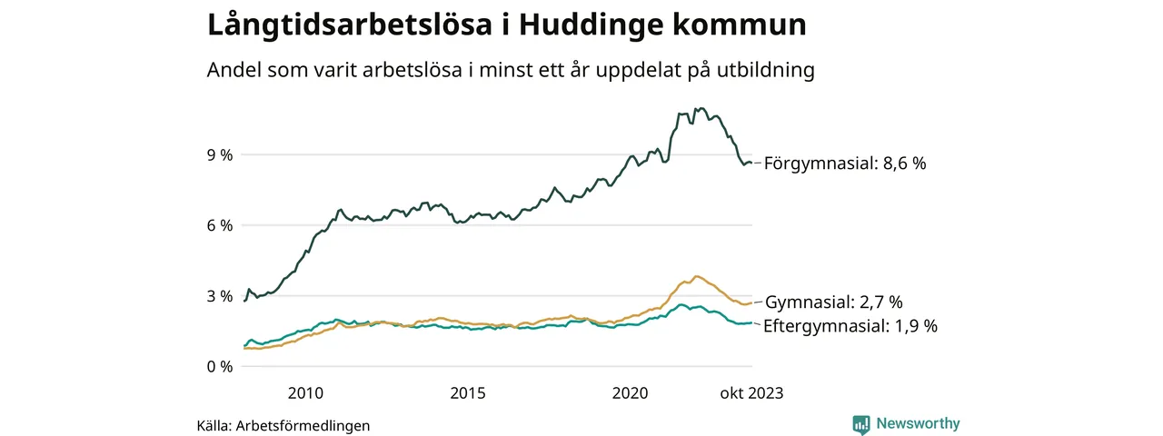 Andelen som varit utan arbete i minst ett år i Huddinge i oktober var lägre än för ett år sedan. Men jämfört med i september har antalet långtidsarbetslösa ökat.