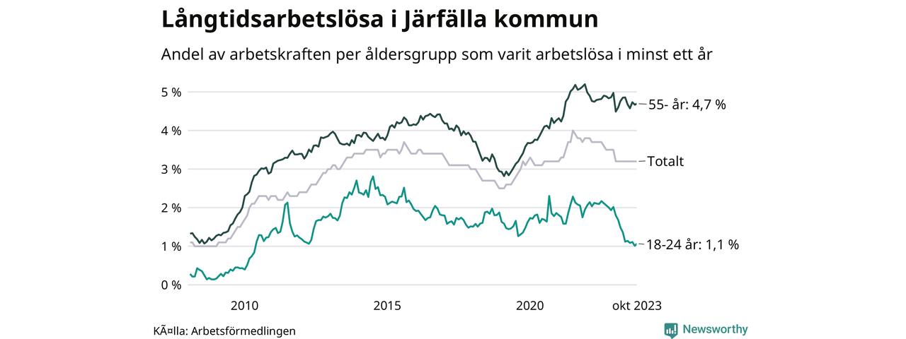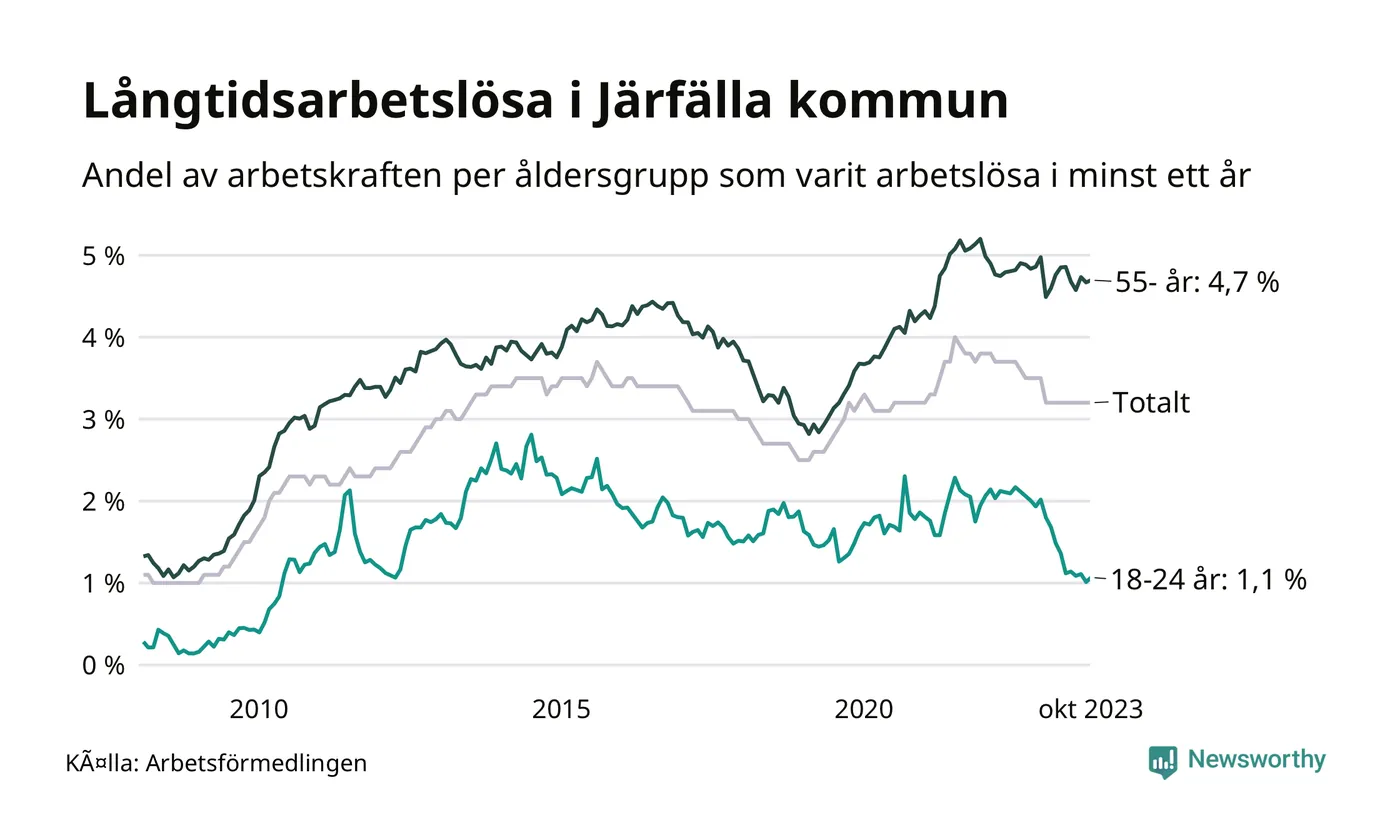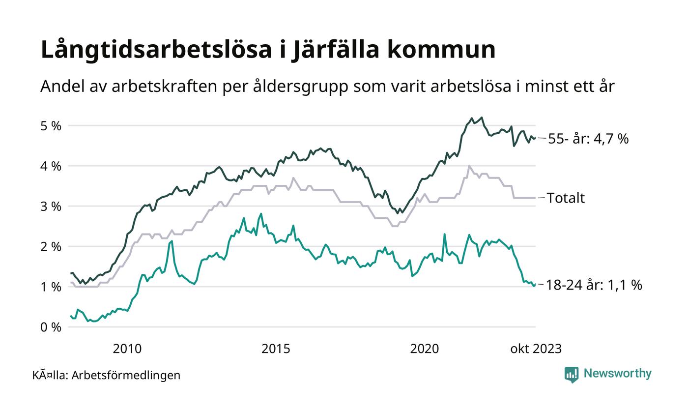 Av de 1 381 personerna som varit arbetslösa i mer än ett år i Järfälla kommun är 360 personer mellan 55 och 651 år och 43 är mellan 18 och 24 år. För den äldre gruppen är andelen arbetslösa 4,7 procent medan den i den yngre gruppen är 1,1 procent. Även i riket som helhet är långtidsarbetslösheten högre i gruppen äldre.