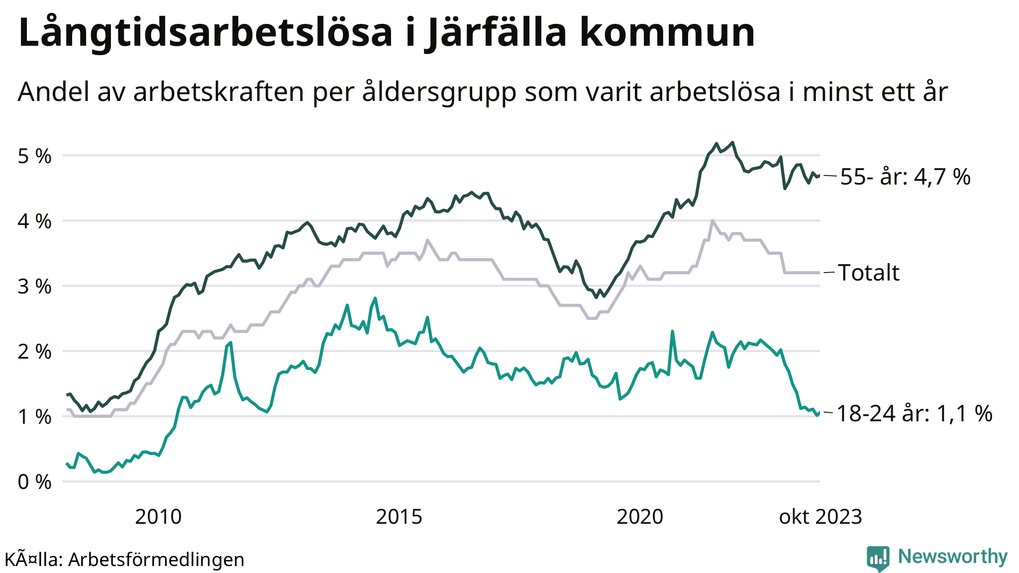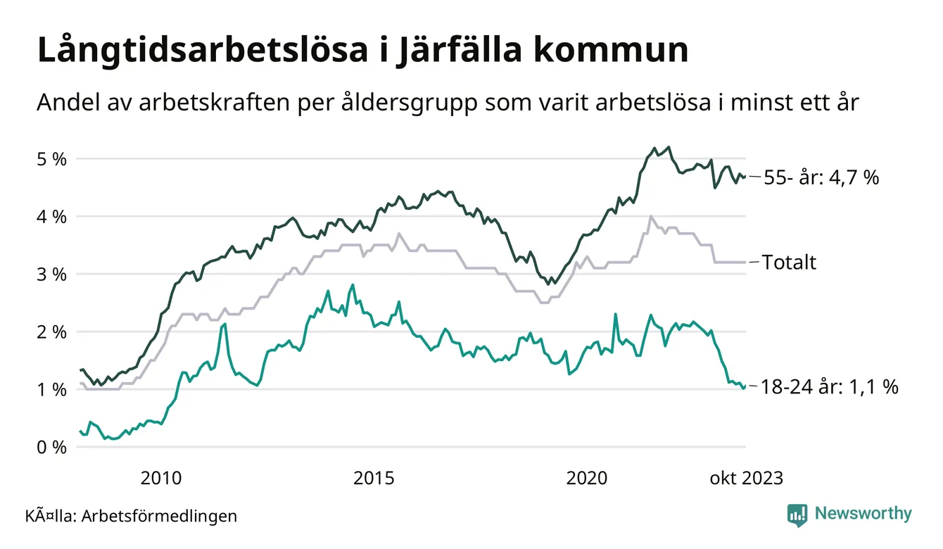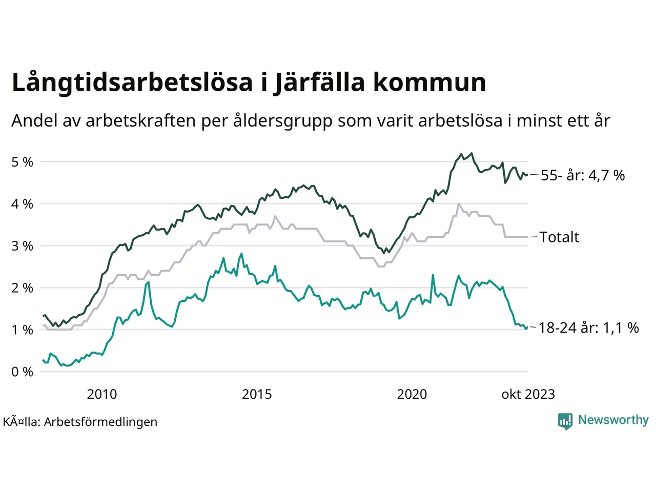 Av de 1 381 personerna som varit arbetslösa i mer än ett år i Järfälla kommun är 360 personer mellan 55 och 651 år och 43 är mellan 18 och 24 år. För den äldre gruppen är andelen arbetslösa 4,7 procent medan den i den yngre gruppen är 1,1 procent. Även i riket som helhet är långtidsarbetslösheten högre i gruppen äldre.