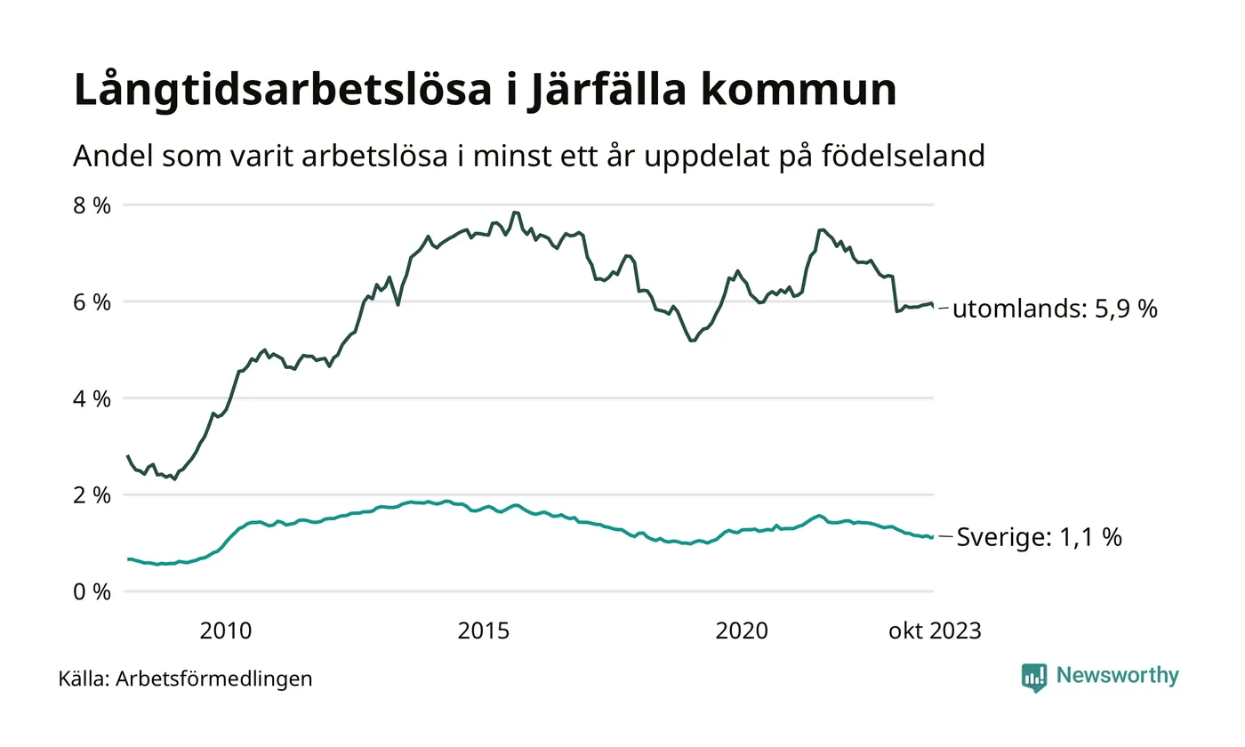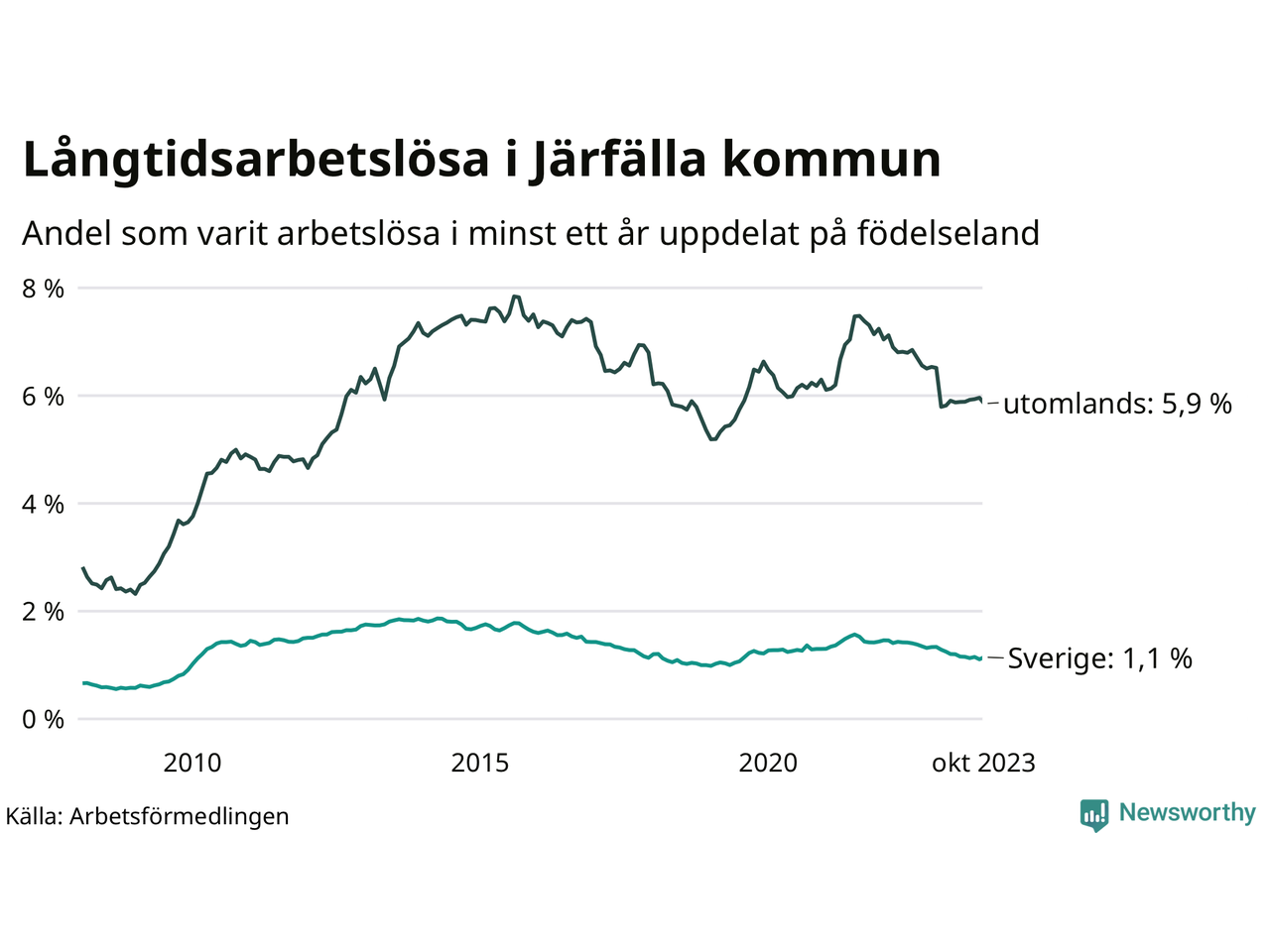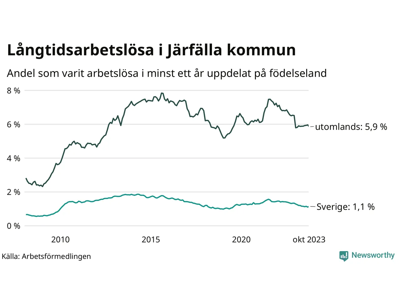 284 av de långtidsarbetslösa i Järfälla är födda i Sverige, medan 1 097 är födda utomlands. Det innebär att långtidsarbetslösheten bland Sverigefödda är 1,1 procent, medan den är fem gånger så hög – 5,9 procent – bland födda utomlands. Även i riket som helhet är arbetslösheten högre bland utrikesfödda.