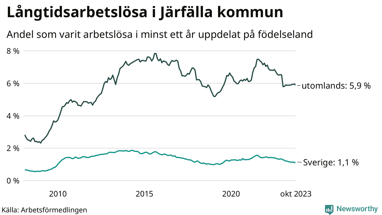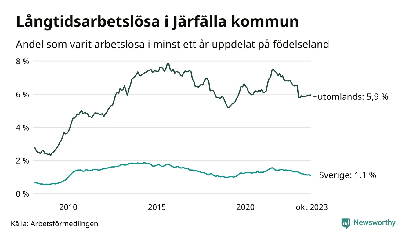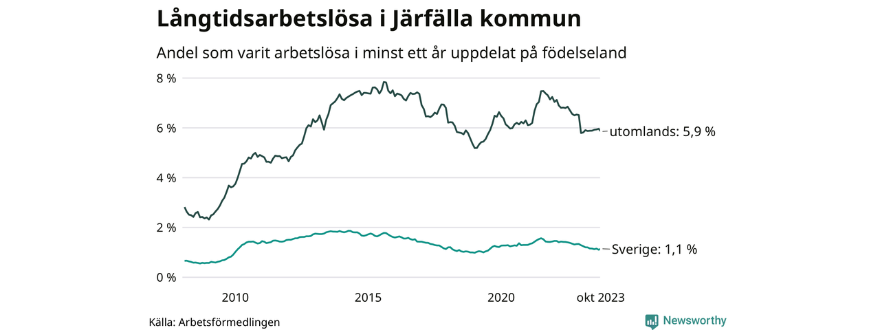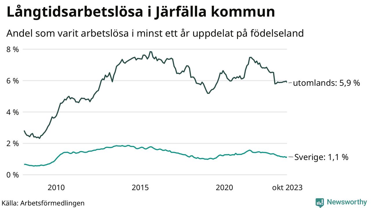 284 av de långtidsarbetslösa i Järfälla är födda i Sverige, medan 1 097 är födda utomlands. Det innebär att långtidsarbetslösheten bland Sverigefödda är 1,1 procent, medan den är fem gånger så hög – 5,9 procent – bland födda utomlands. Även i riket som helhet är arbetslösheten högre bland utrikesfödda.
