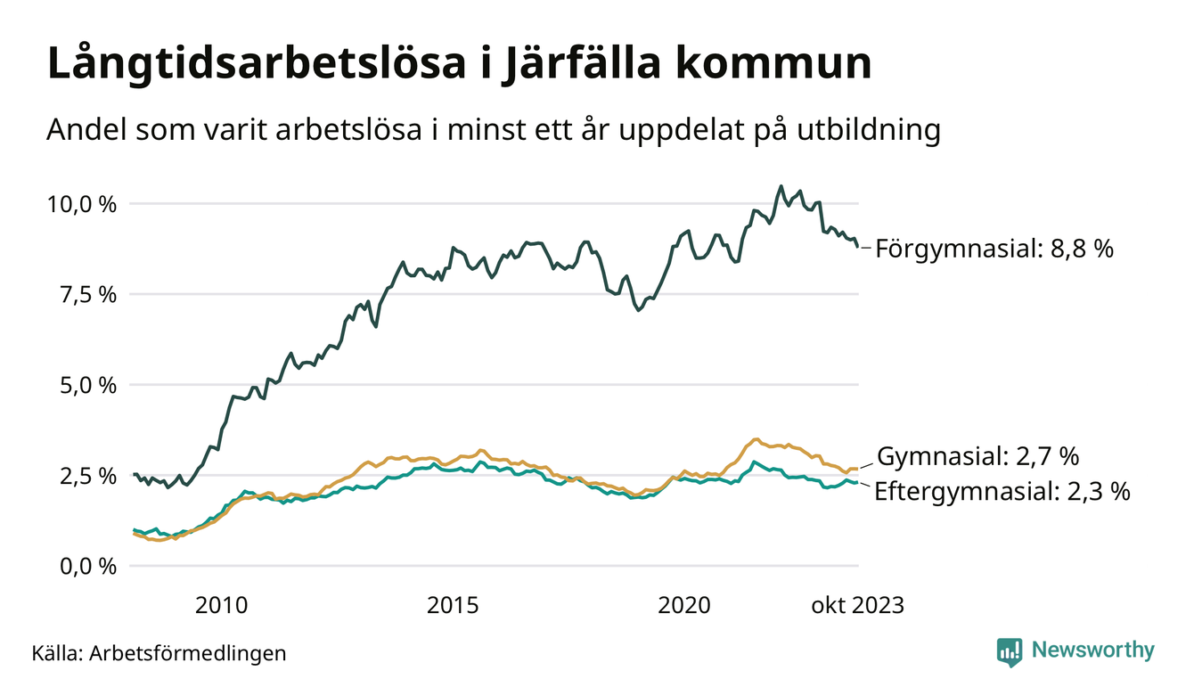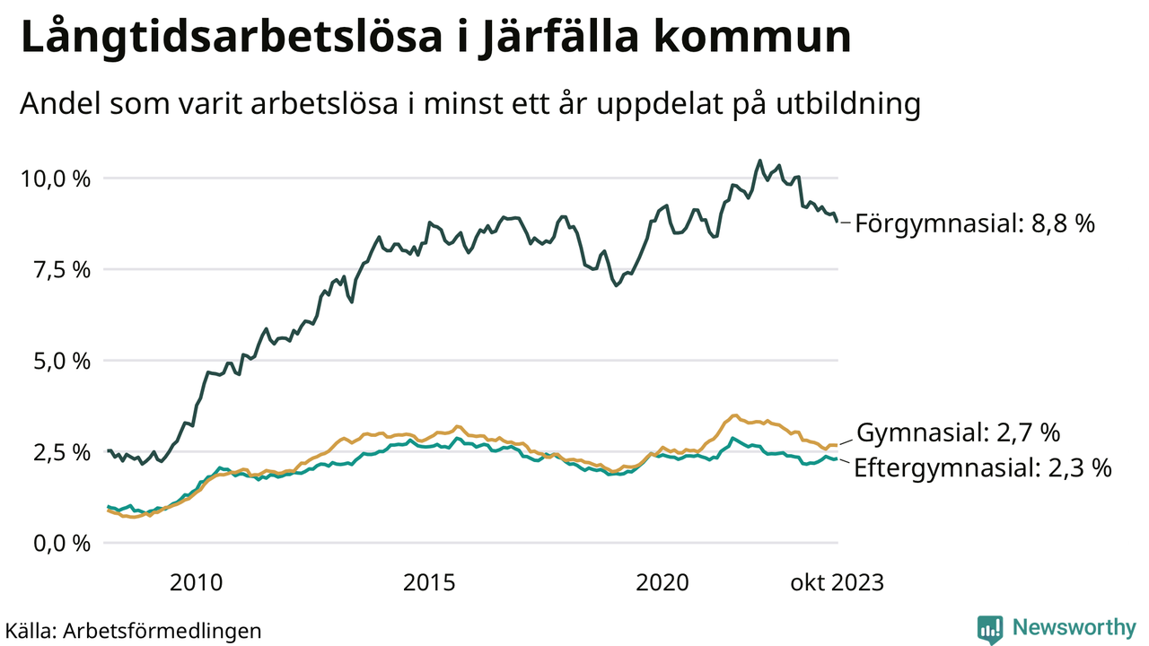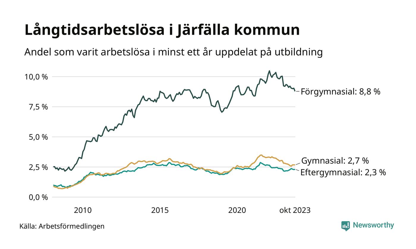 Graf över andel långtidsarbetslösa i Järfälla uppdelat på utbildningsnivå