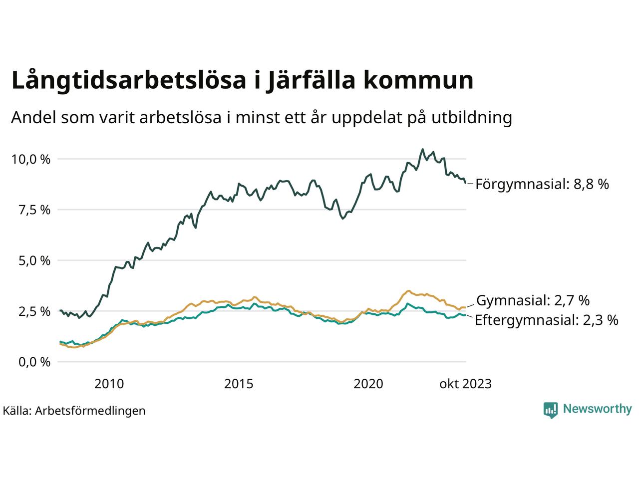 Graf: Andel arbetslösa i Järfälla som varit utan arbete i minst 12 månader
