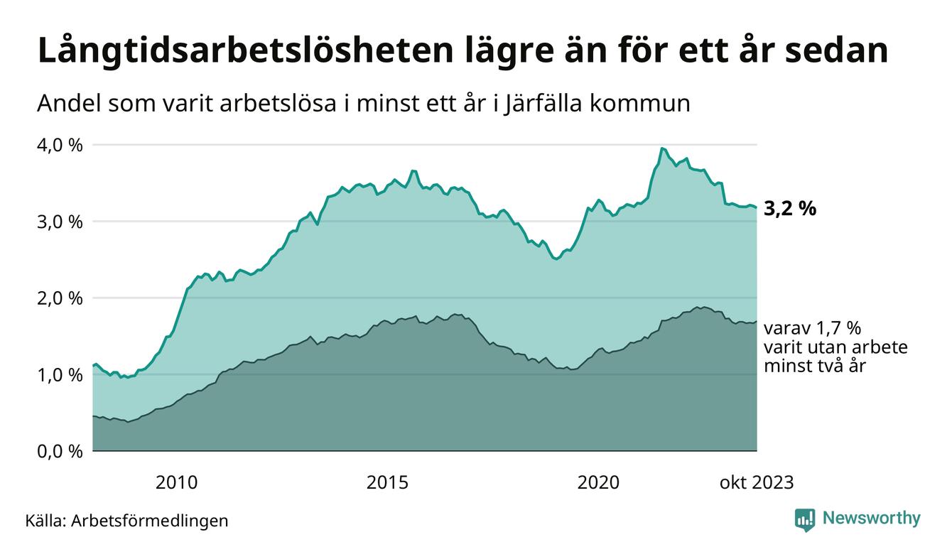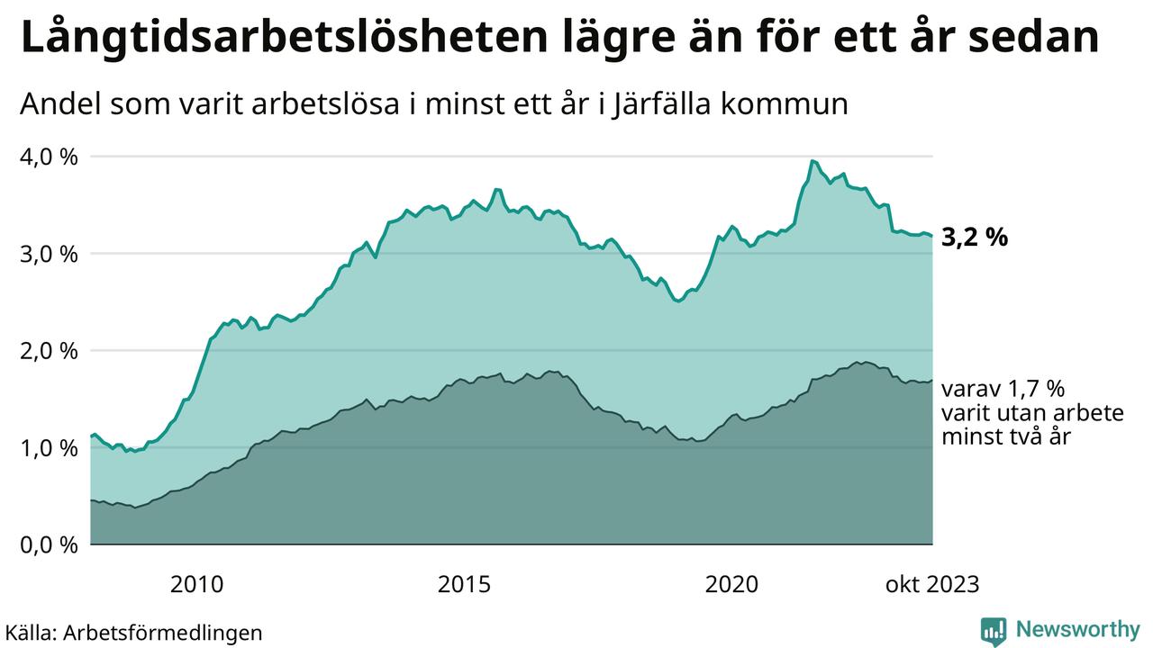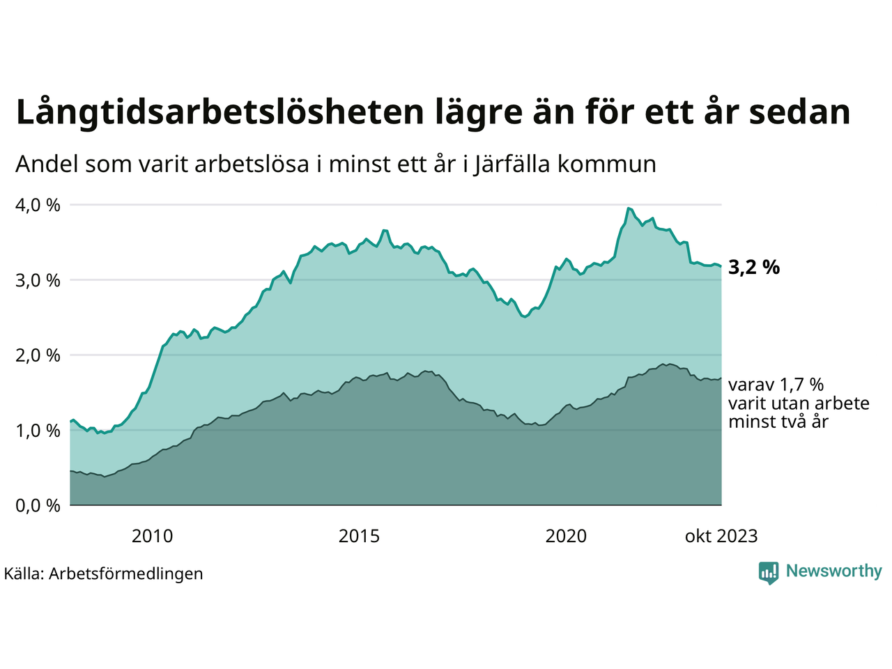 I oktober hade 1 381 Järfällabor varit arbetslösa i minst ett år, vilket är elva färre än månaden innan. 1 381 personer motsvarar 3,2 procent av arbetskraften i kommunen – andelen långtidsarbetslösa är 0,3 procentenheter lägre än samma månad för ett år sedan.