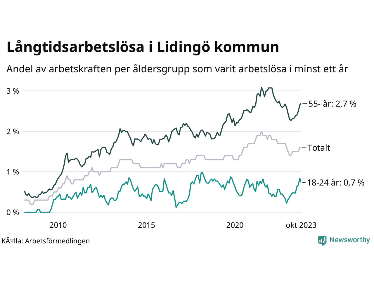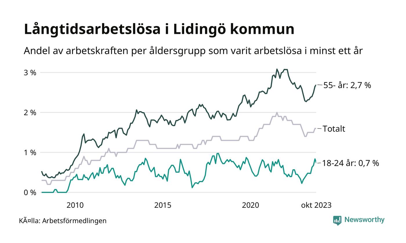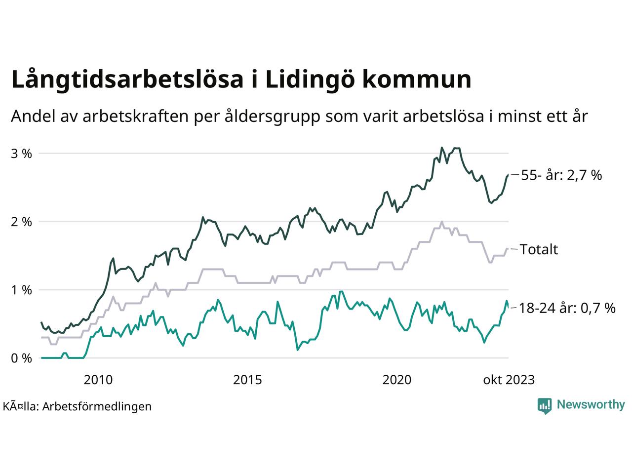 Av de 363 personerna som varit arbetslösa i mer än ett år i Lidingö kommun är 131 personer mellan 55 och 651 år och 14 är mellan 18 och 24 år. För den äldre gruppen är andelen arbetslösa 2,7 procent medan den i den yngre gruppen är 0,7 procent. Även i riket som helhet är långtidsarbetslösheten högre i gruppen äldre.