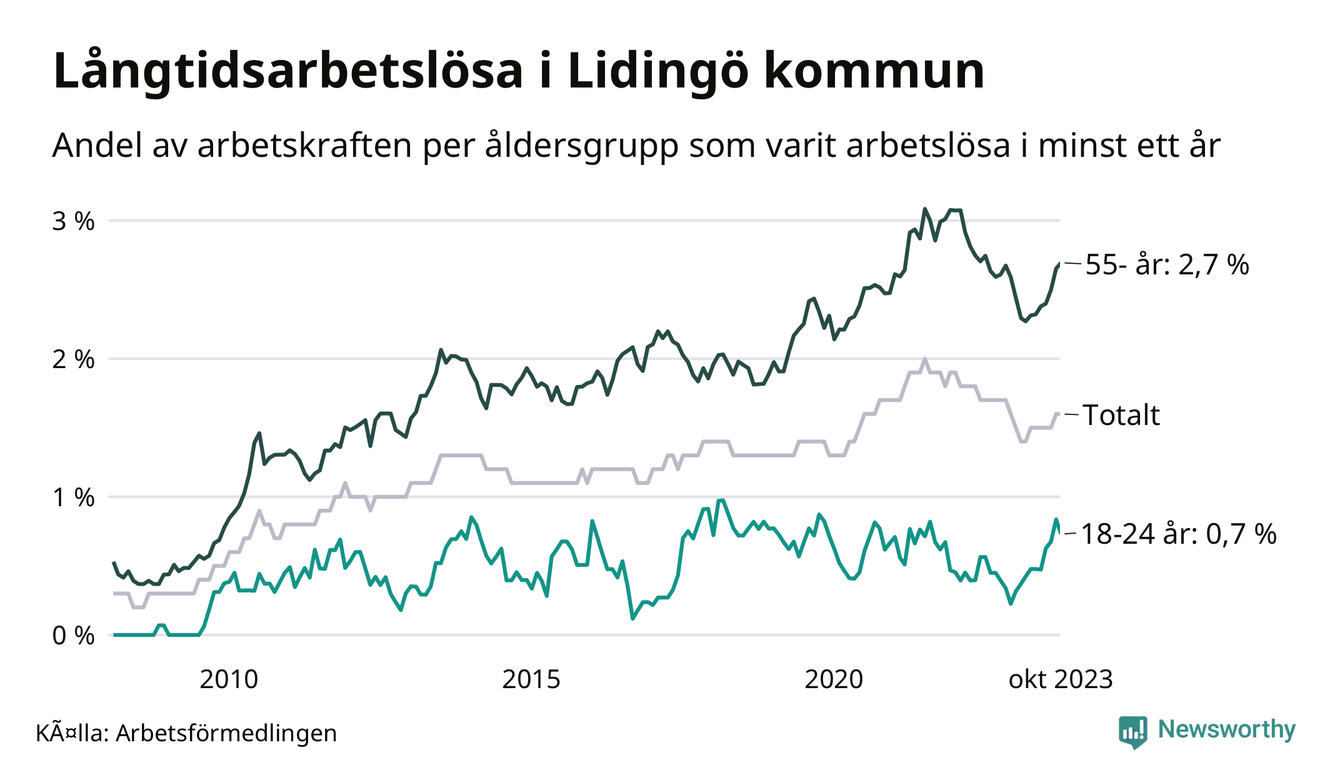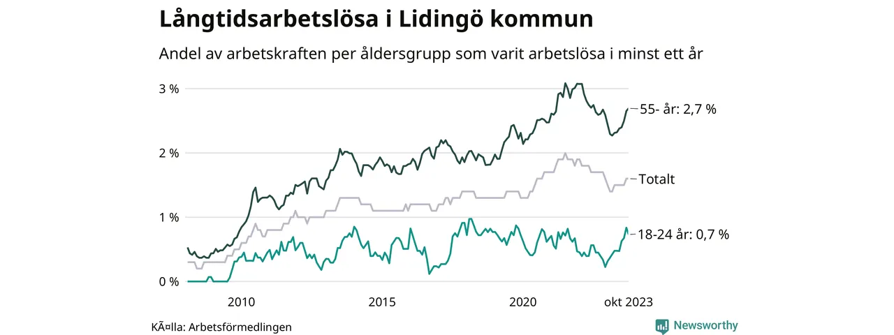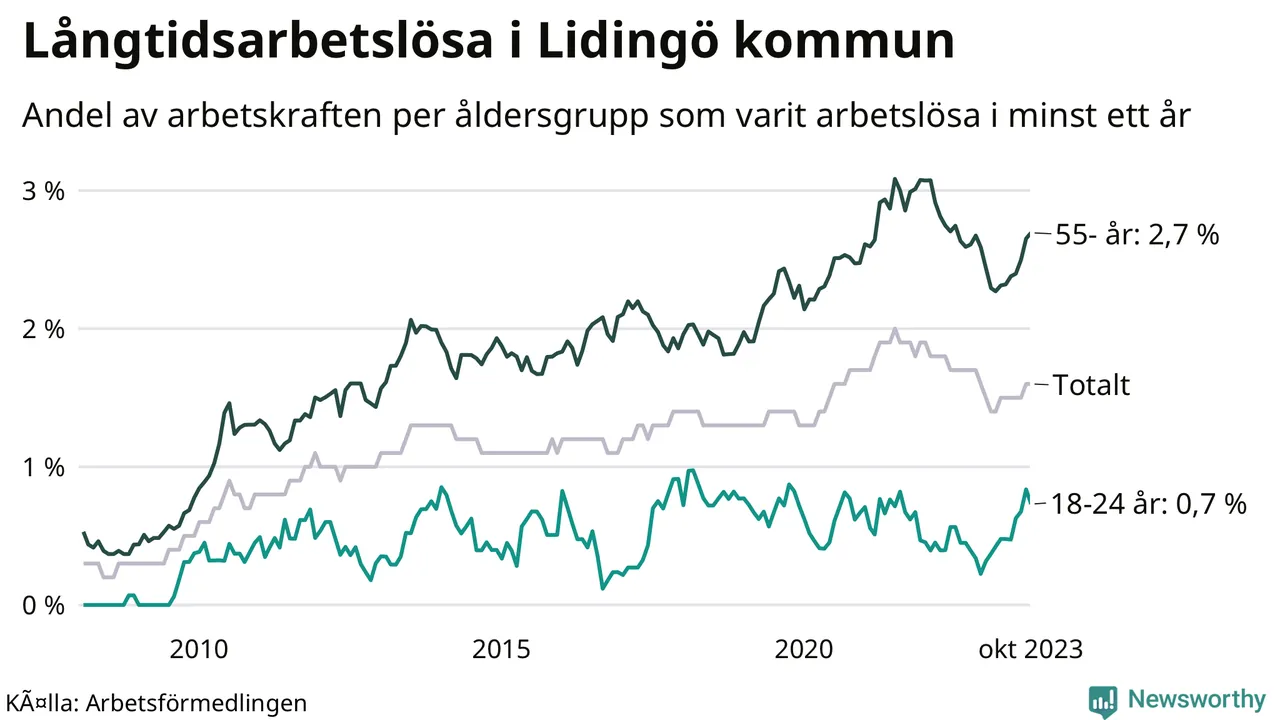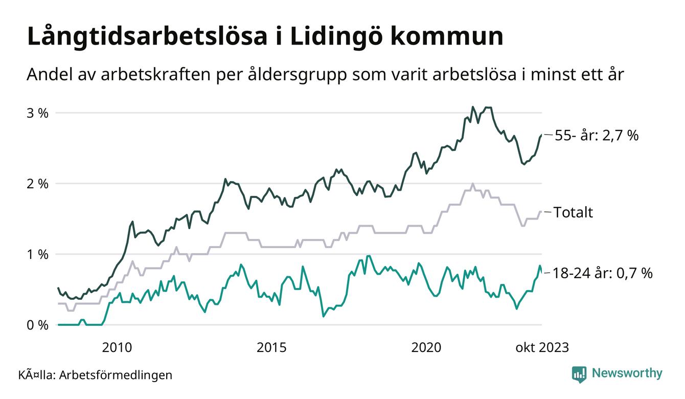 Av de 363 personerna som varit arbetslösa i mer än ett år i Lidingö kommun är 131 personer mellan 55 och 651 år och 14 är mellan 18 och 24 år. För den äldre gruppen är andelen arbetslösa 2,7 procent medan den i den yngre gruppen är 0,7 procent. Även i riket som helhet är långtidsarbetslösheten högre i gruppen äldre.