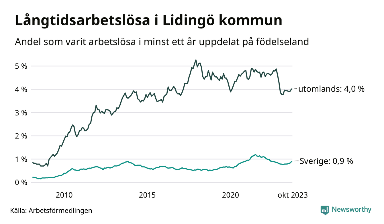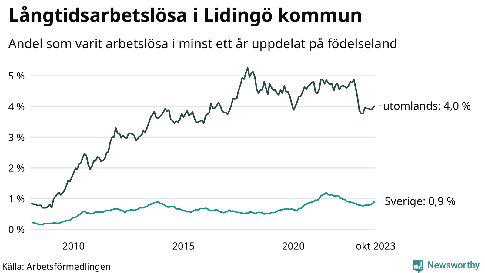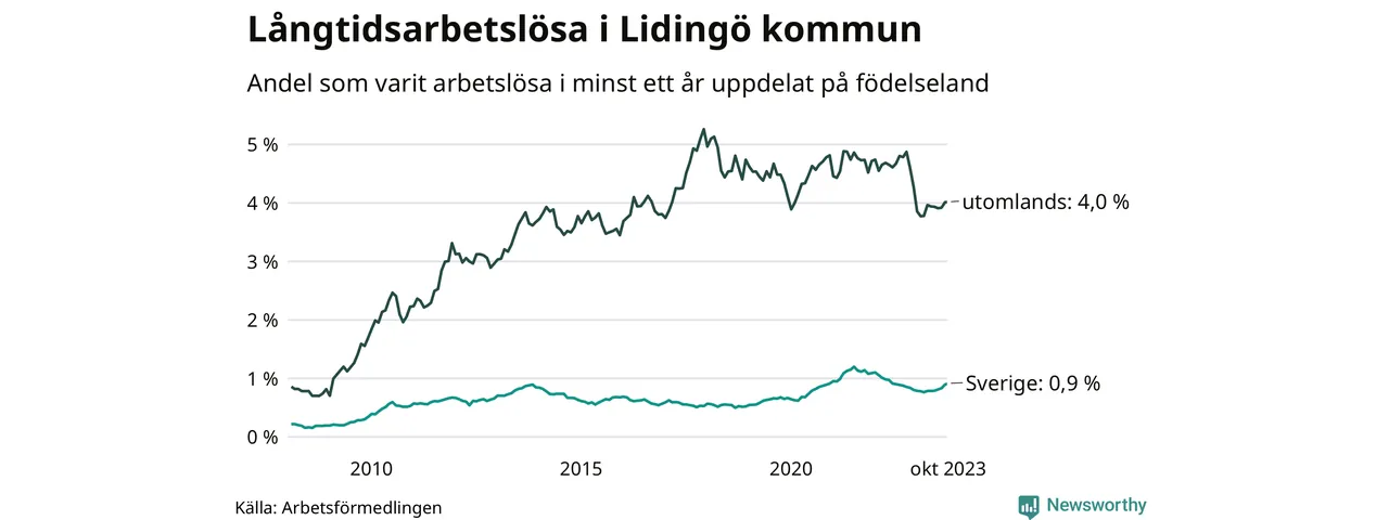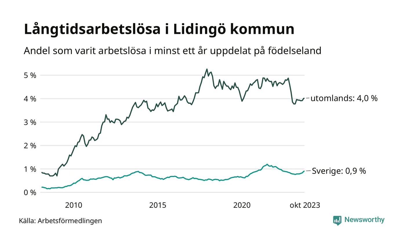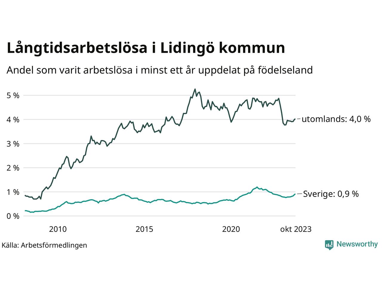 164 av de långtidsarbetslösa på Lidingö är födda i Sverige, medan 199 är födda utomlands. Det innebär att långtidsarbetslösheten bland Sverigefödda är 0,9 procent, medan den är fyra gånger så hög – 4,0 procent – bland födda utomlands. Även i riket som helhet är arbetslösheten högre bland utrikesfödda.