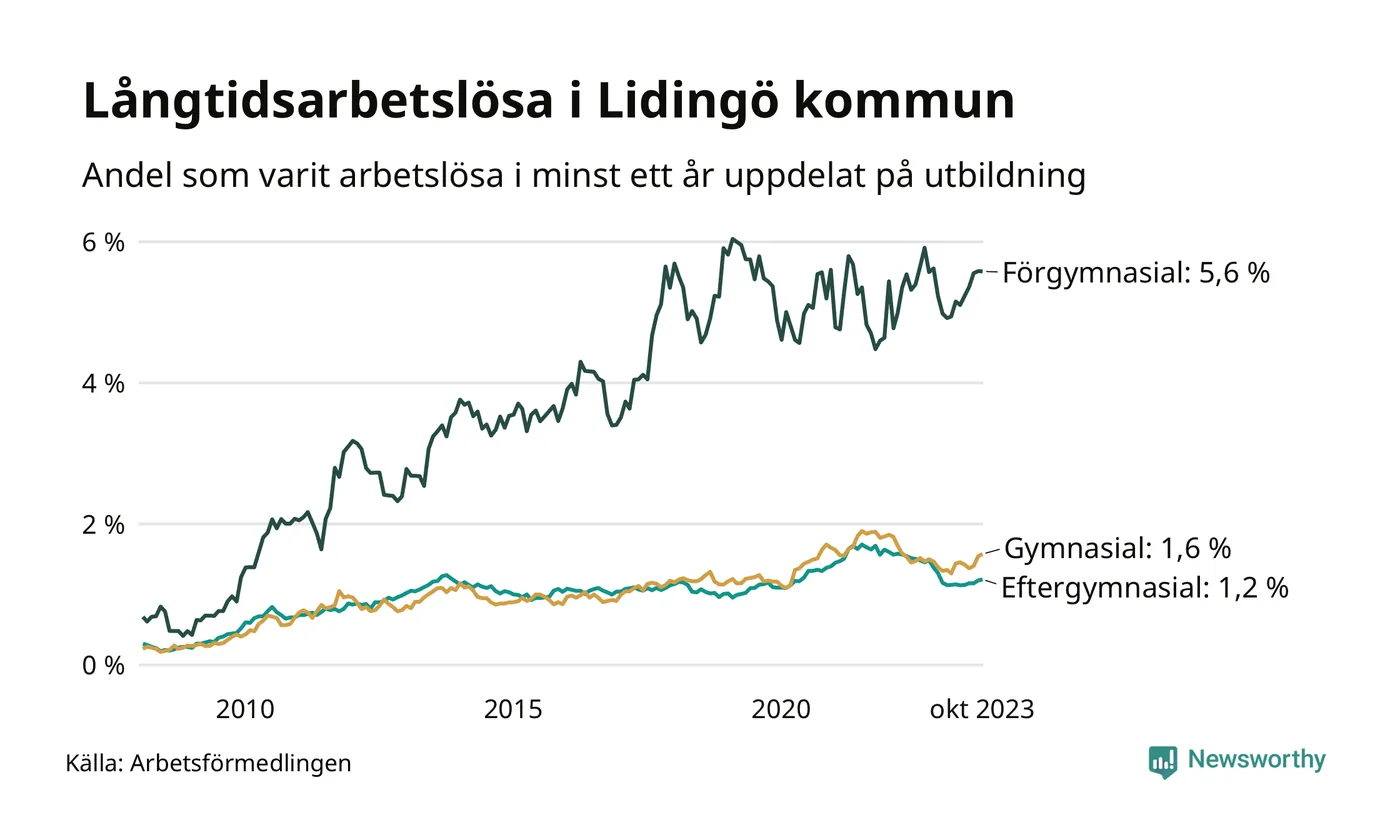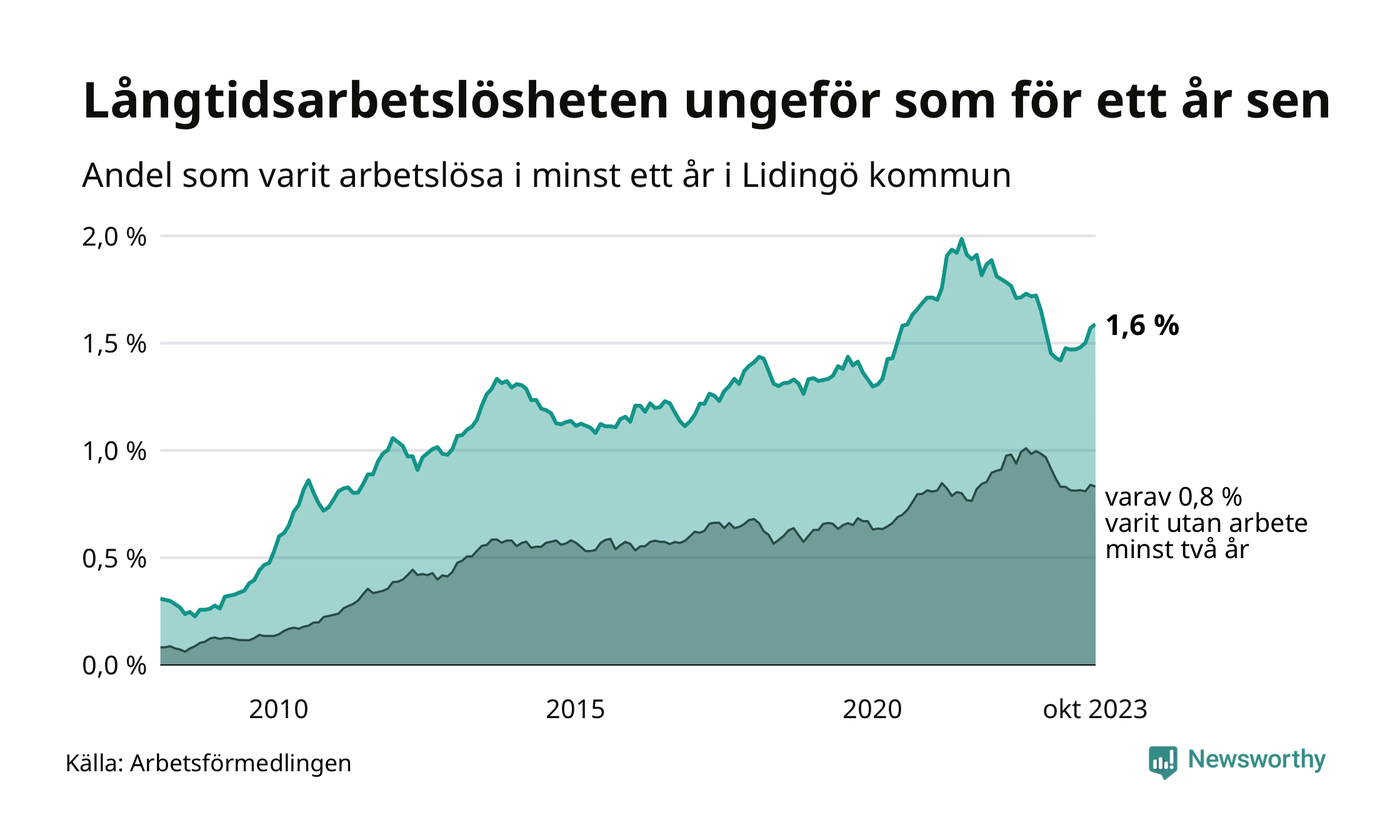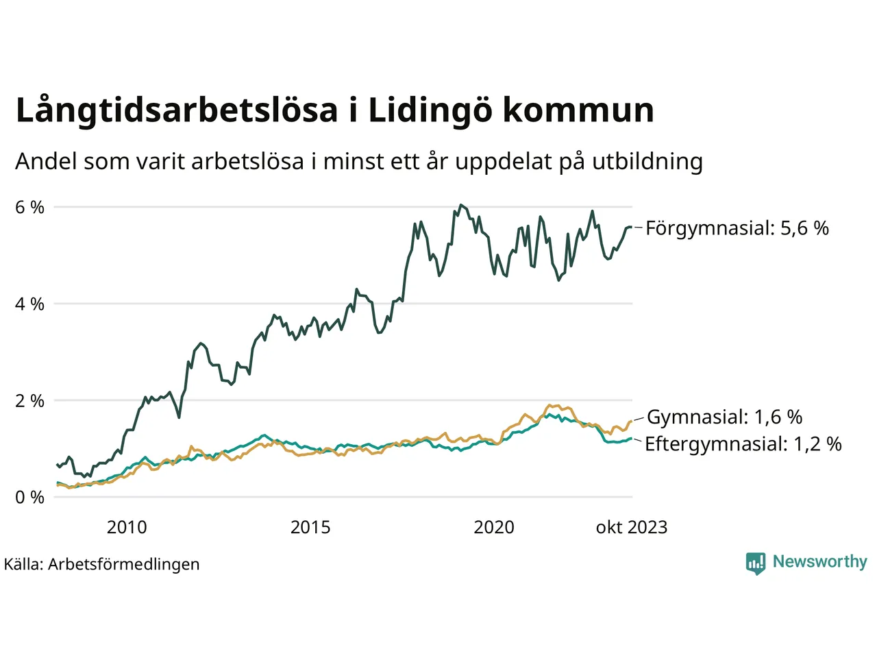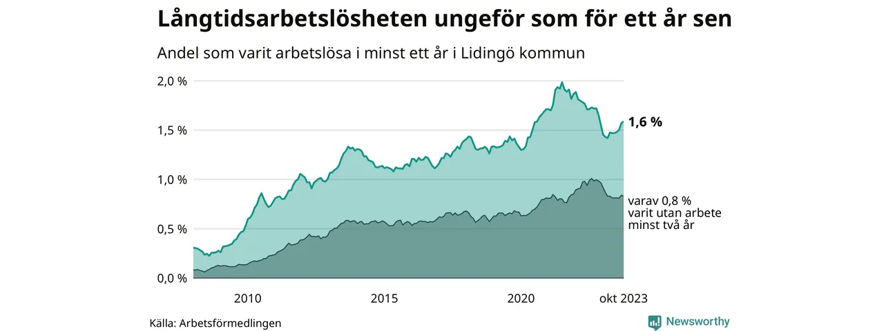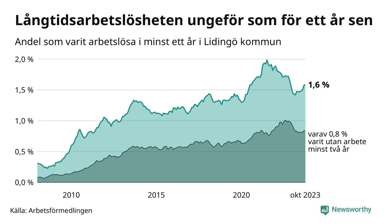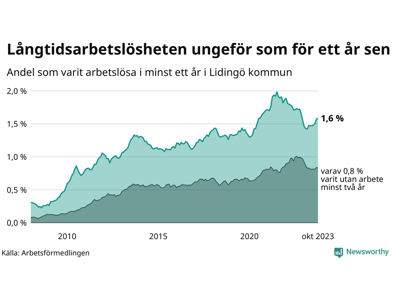 I oktober hade 363 Lidingöbor varit arbetslösa i minst ett år, vilket är fyra fler än månaden innan. Det är den femte månaden i rad med ökande antal långtidsarbetslösa. 363 personer motsvarar 1,6 procent av arbetskraften i kommunen – andelen långtidsarbetslösa är ungefär på samma nivå som för ett år sedan.
