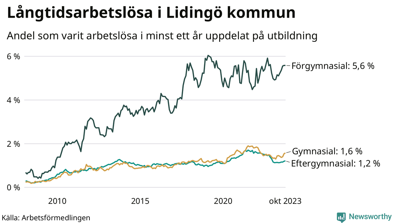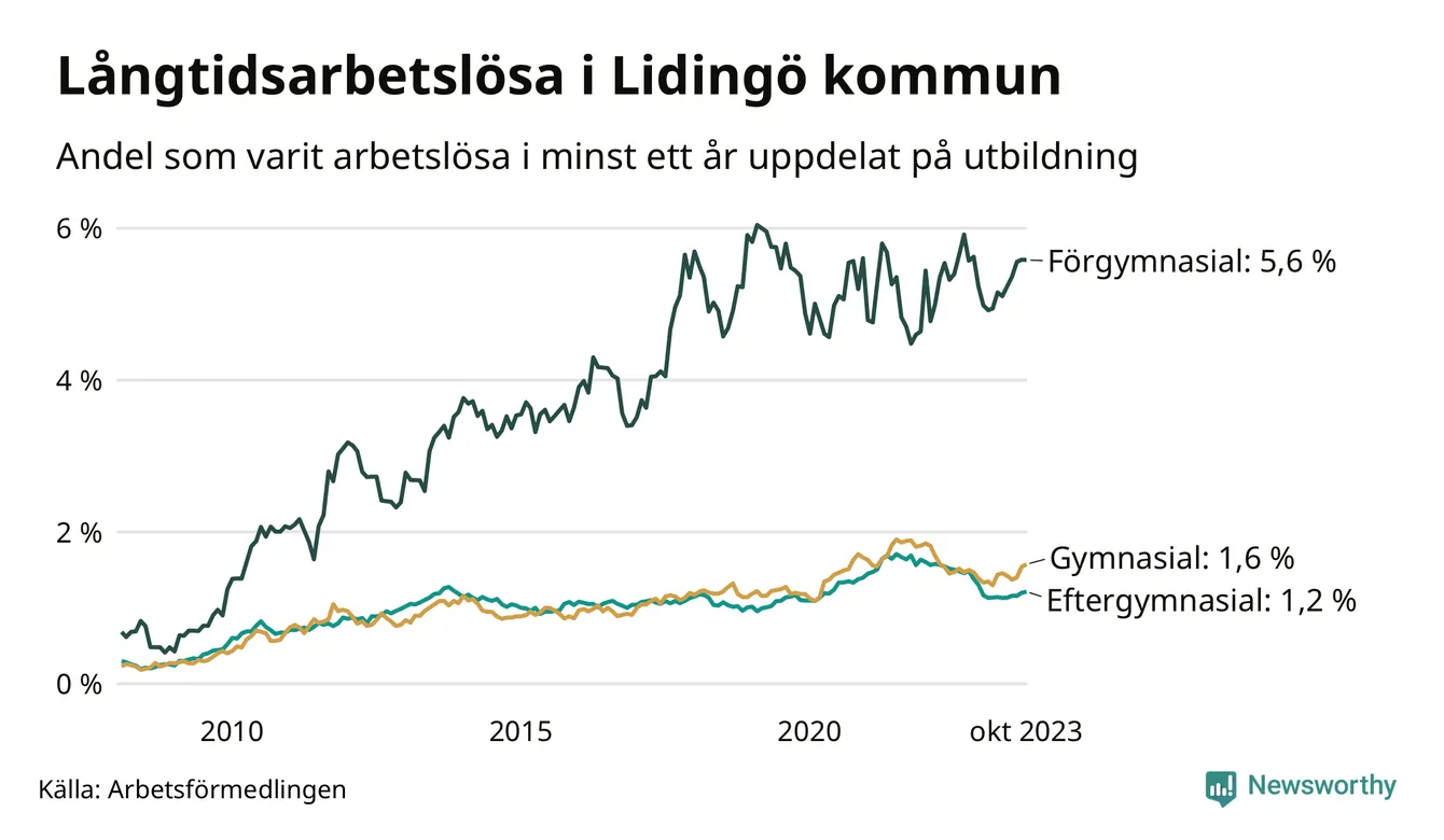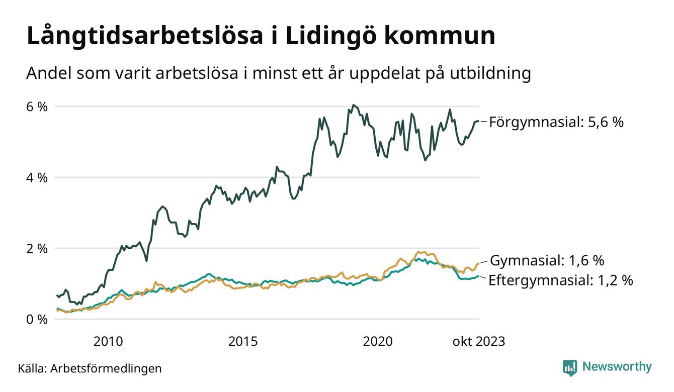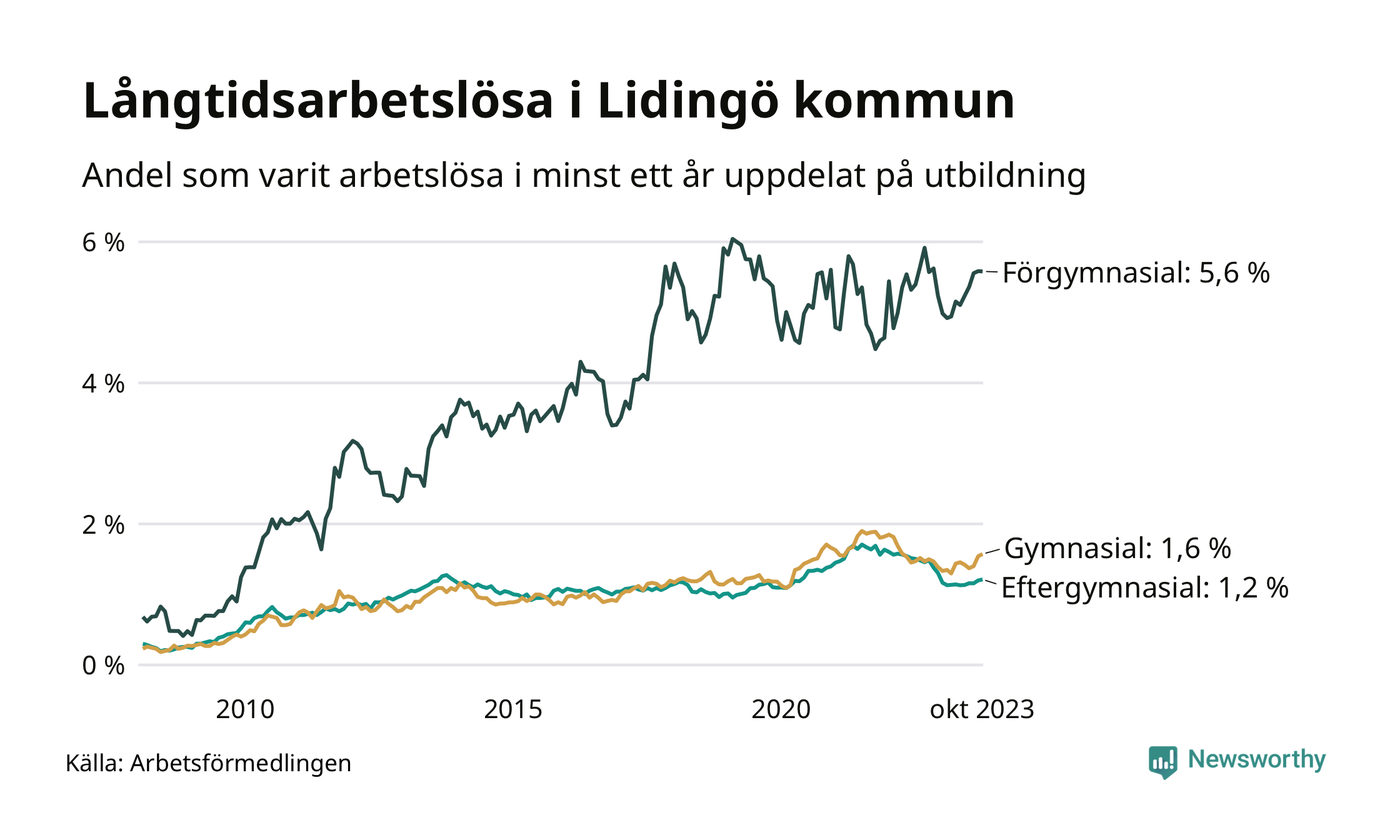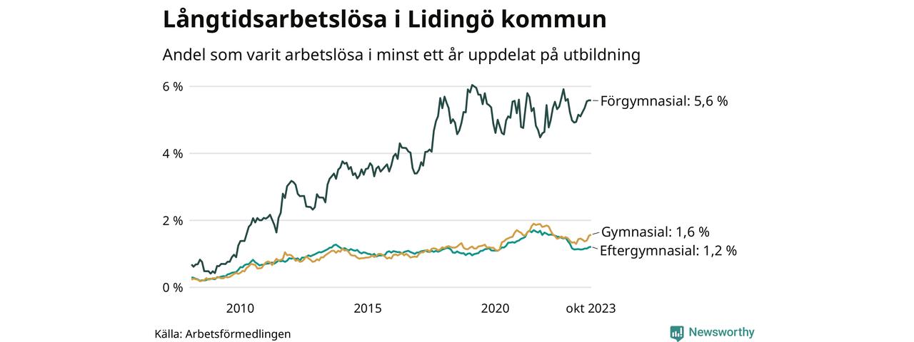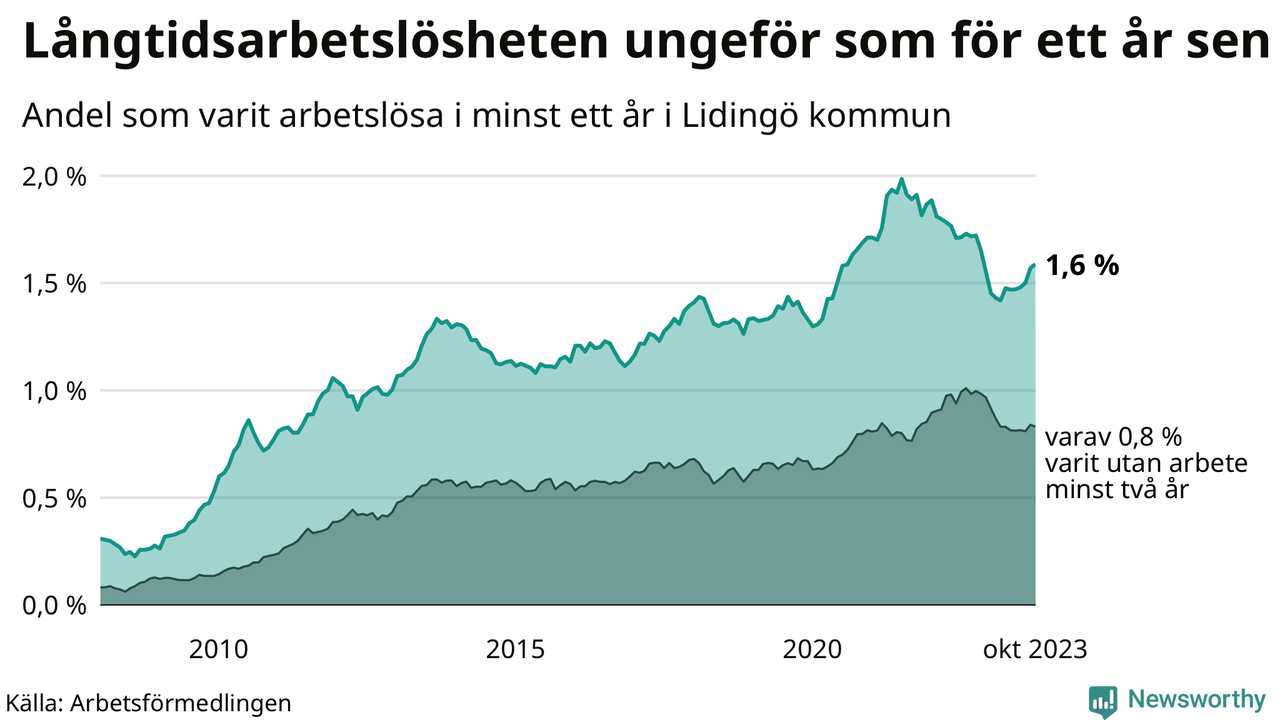 I oktober hade 363 Lidingöbor varit arbetslösa i minst ett år, vilket är fyra fler än månaden innan. Det är den femte månaden i rad med ökande antal långtidsarbetslösa. 363 personer motsvarar 1,6 procent av arbetskraften i kommunen – andelen långtidsarbetslösa är ungefär på samma nivå som för ett år sedan.