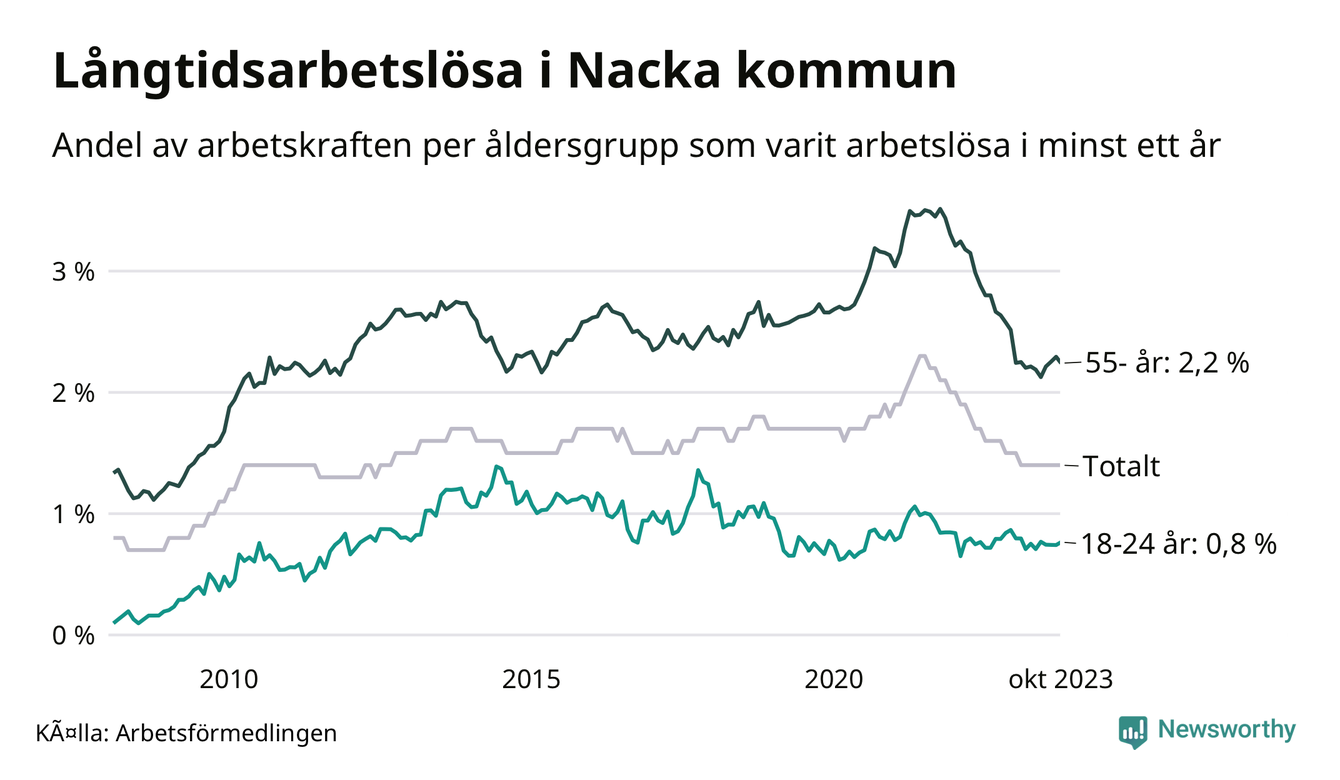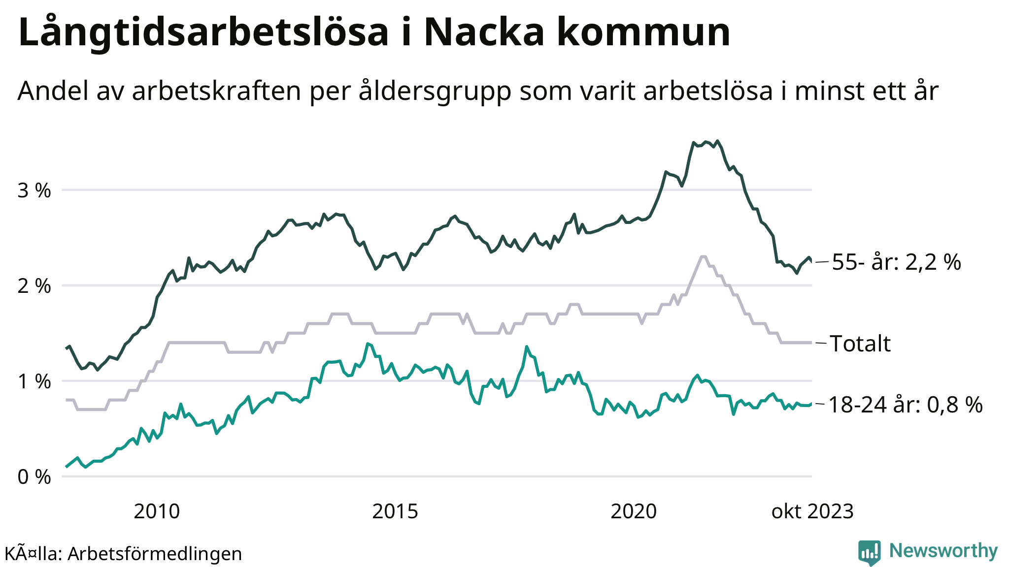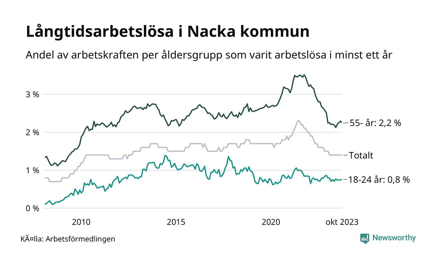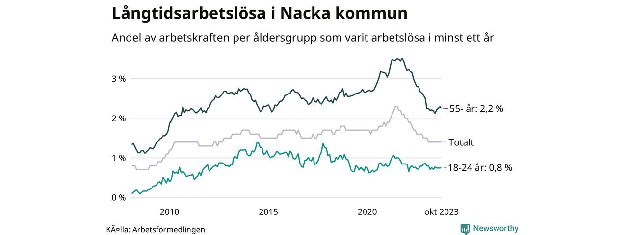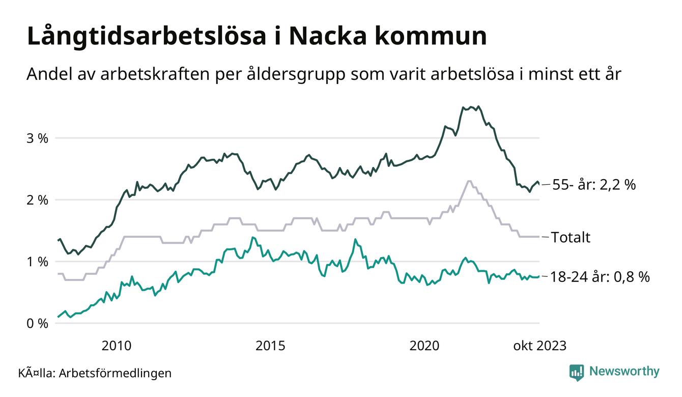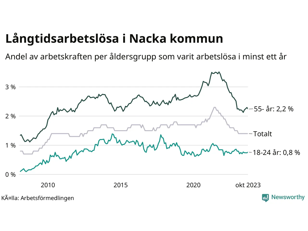 Av de 767 personerna som varit arbetslösa i mer än ett år i Nacka kommun är 242 personer mellan 55 och 651 år och 35 är mellan 18 och 24 år. För den äldre gruppen är andelen arbetslösa 2,2 procent medan den i den yngre gruppen är 0,8 procent. Även i riket som helhet är långtidsarbetslösheten högre i gruppen äldre.