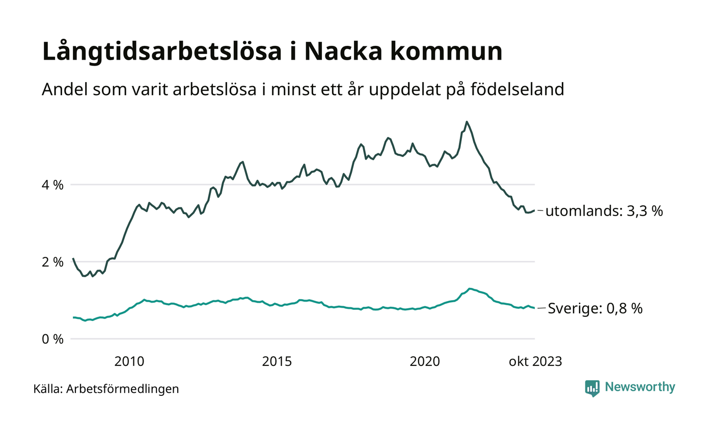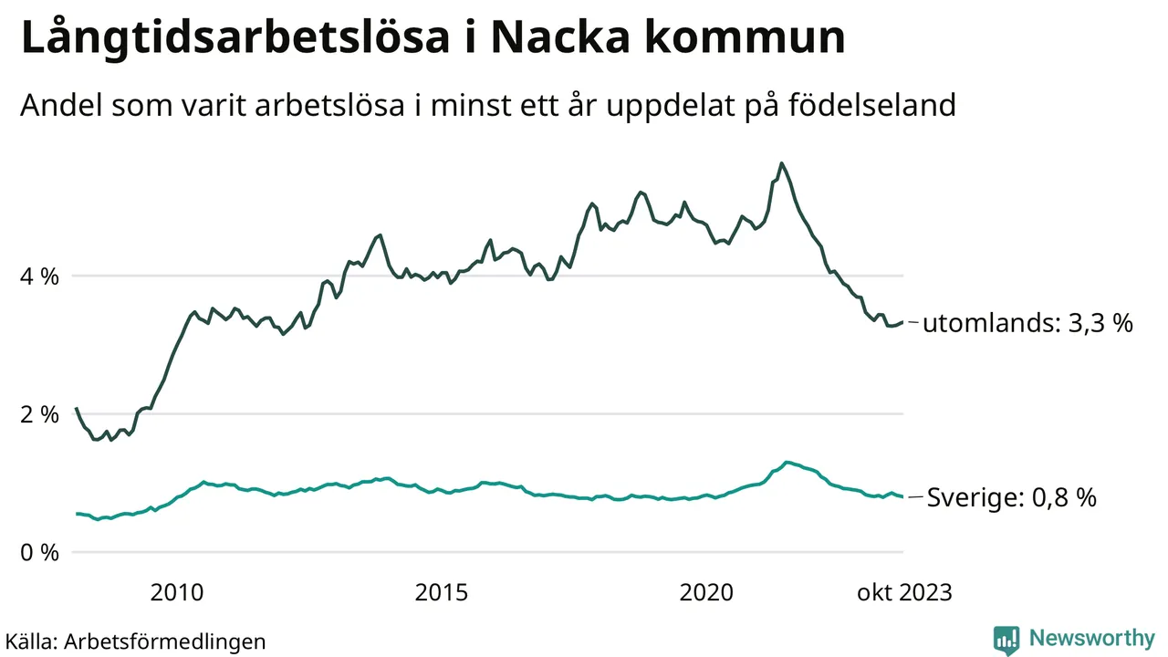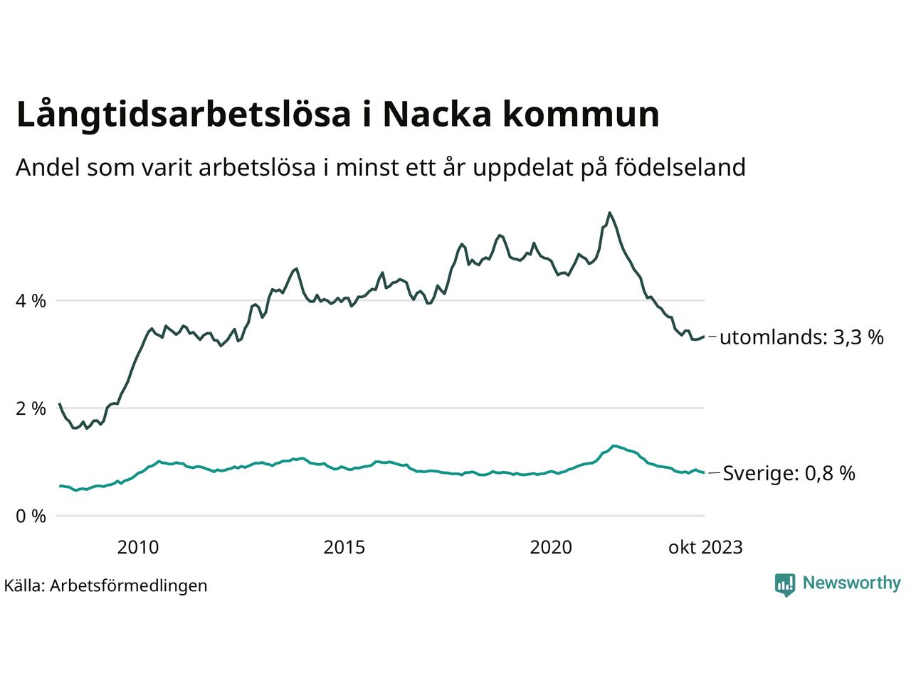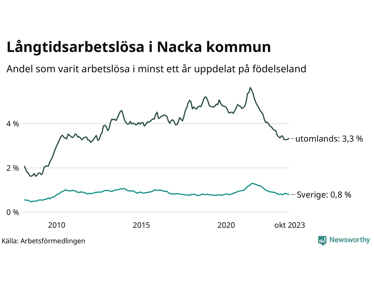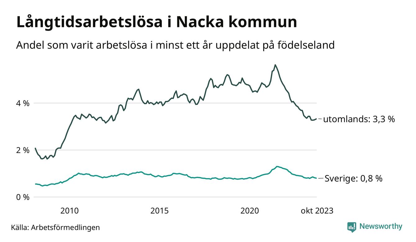 333 av de långtidsarbetslösa i Nacka är födda i Sverige, medan 434 är födda utomlands. Det innebär att långtidsarbetslösheten bland Sverigefödda är 0,8 procent, medan den är fyra gånger så hög – 3,3 procent – bland födda utomlands. Även i riket som helhet är arbetslösheten högre bland utrikesfödda.
