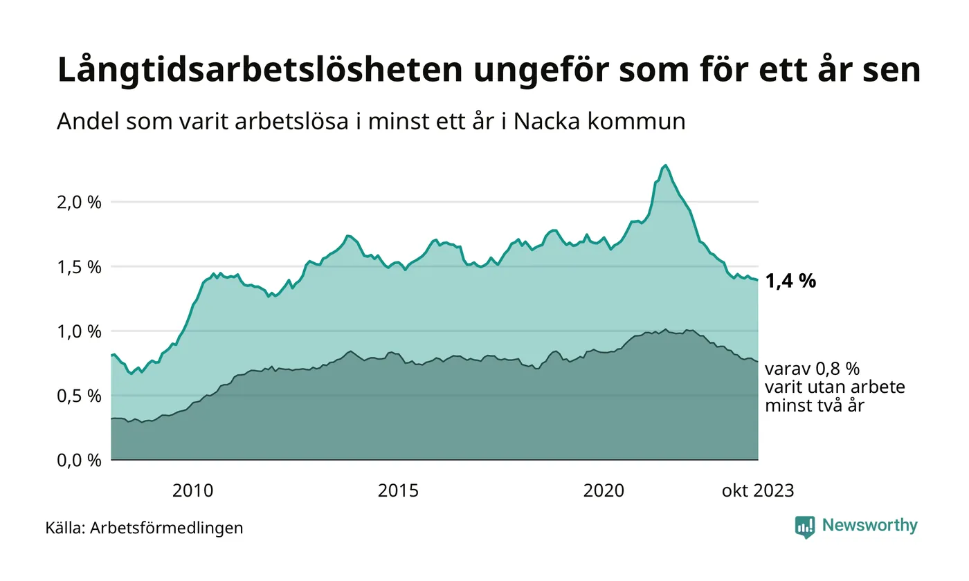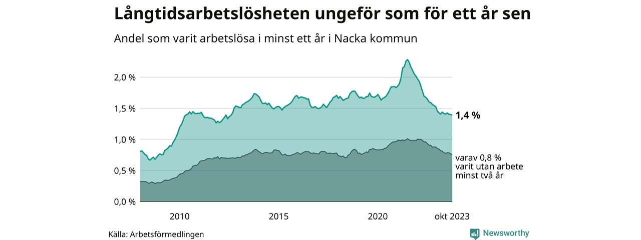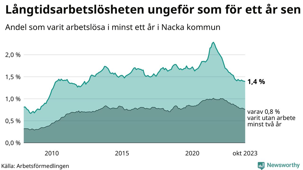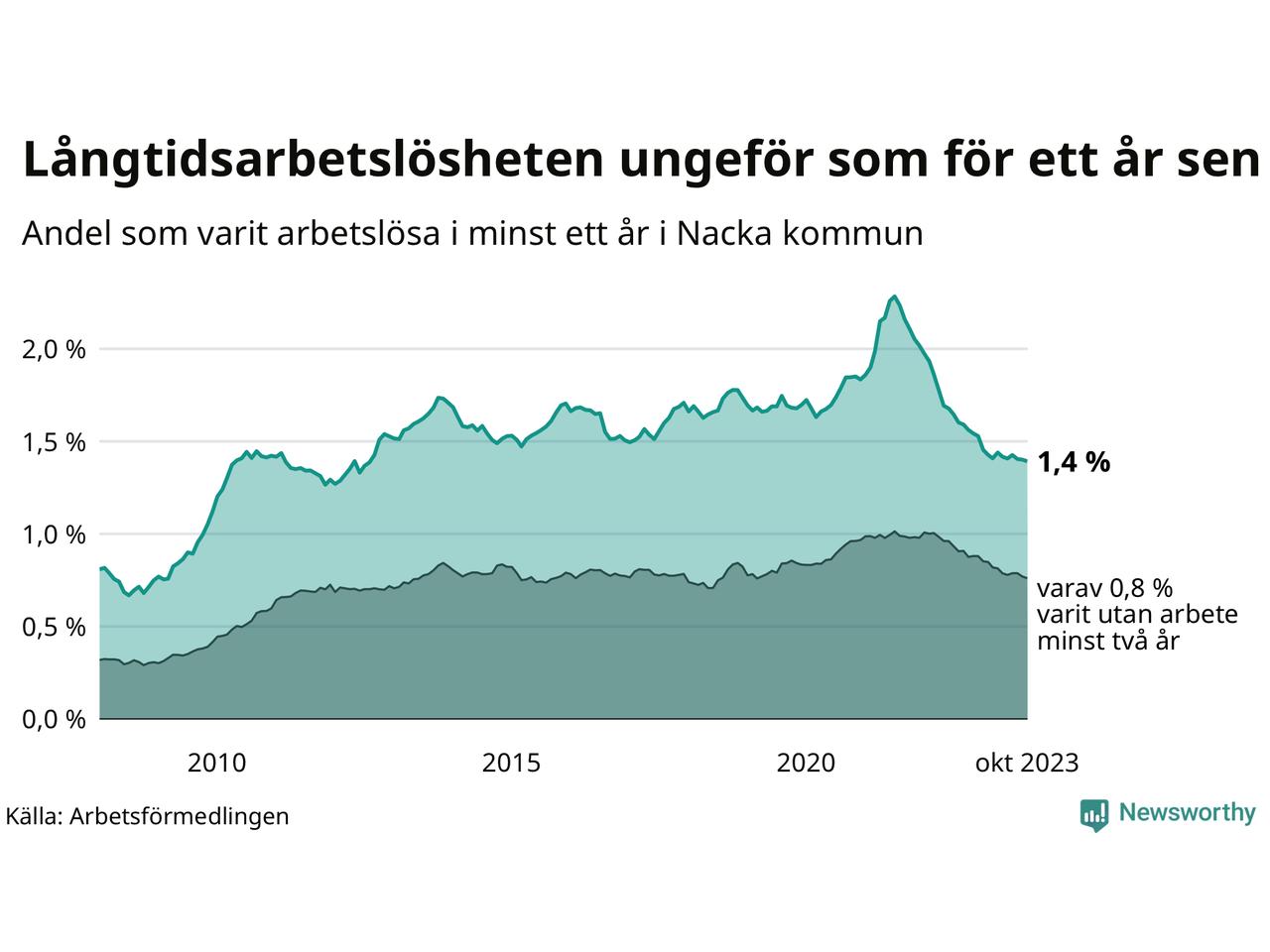 I oktober hade 767 Nackabor varit arbetslösa i minst ett år, vilket är fem färre än månaden innan. 767 personer motsvarar 1,4 procent av arbetskraften i kommunen – andelen långtidsarbetslösa är ungefär på samma nivå som för ett år sedan.