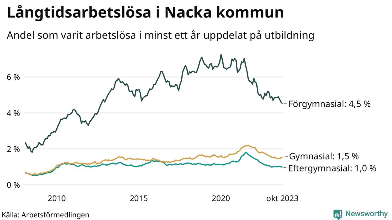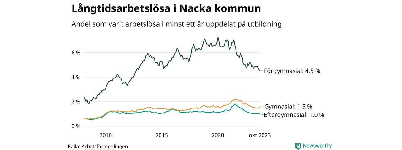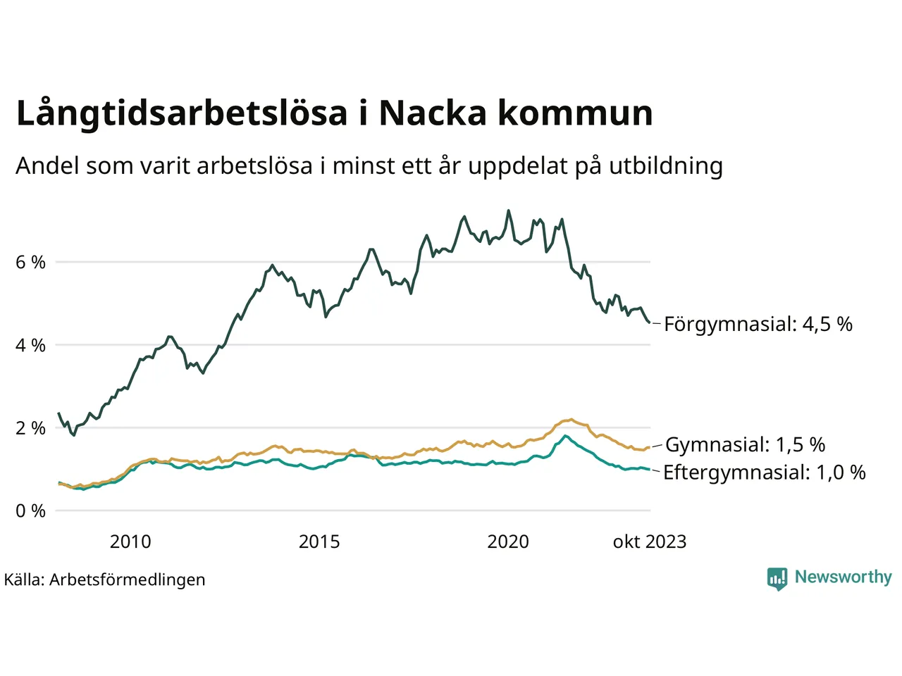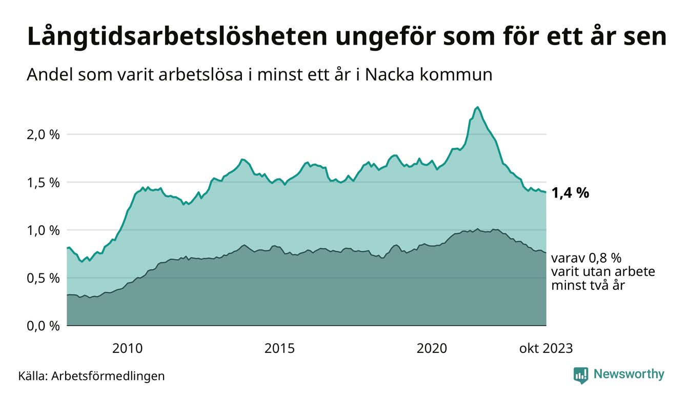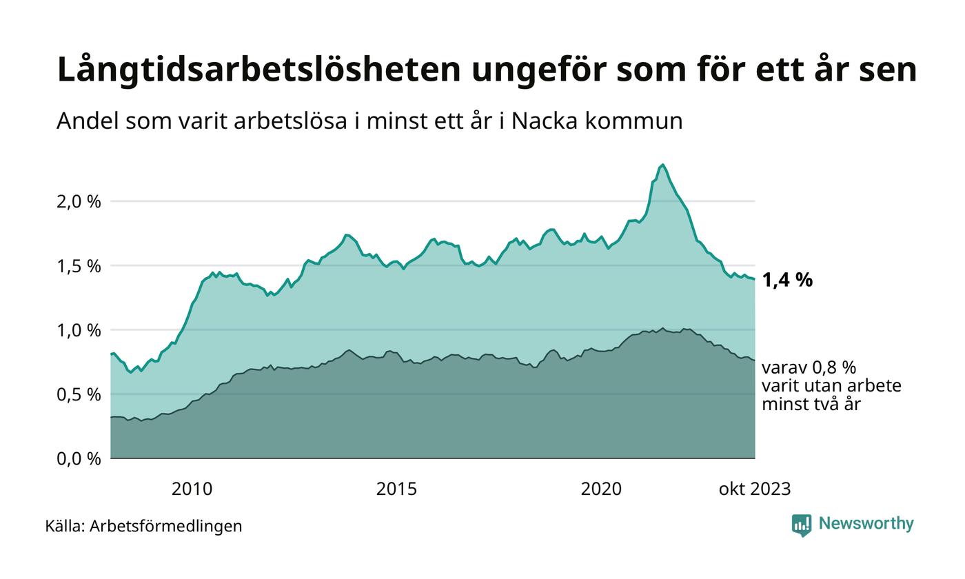 I oktober hade 767 Nackabor varit arbetslösa i minst ett år, vilket är fem färre än månaden innan. 767 personer motsvarar 1,4 procent av arbetskraften i kommunen – andelen långtidsarbetslösa är ungefär på samma nivå som för ett år sedan.