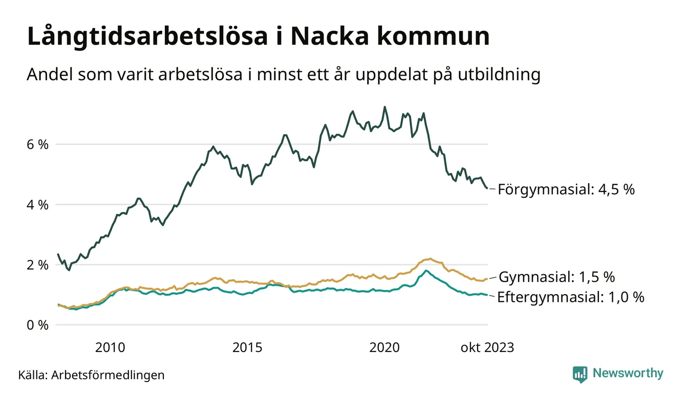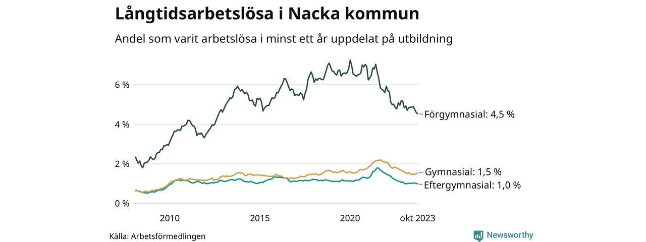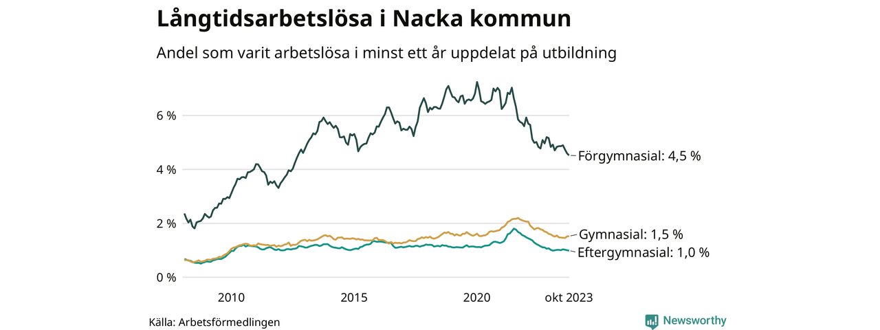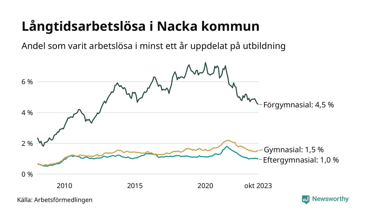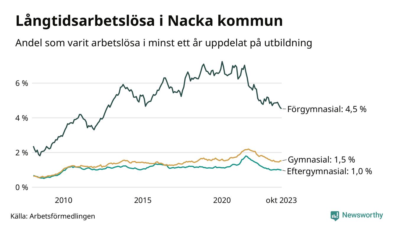 I oktober hade 767 Nackabor varit arbetslösa i minst ett år, vilket är fem färre än månaden innan. 767 personer motsvarar 1,4 procent av arbetskraften i kommunen – andelen långtidsarbetslösa är ungefär på samma nivå som för ett år sedan.