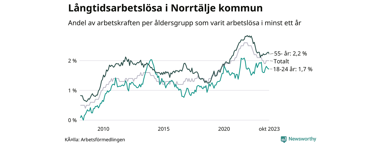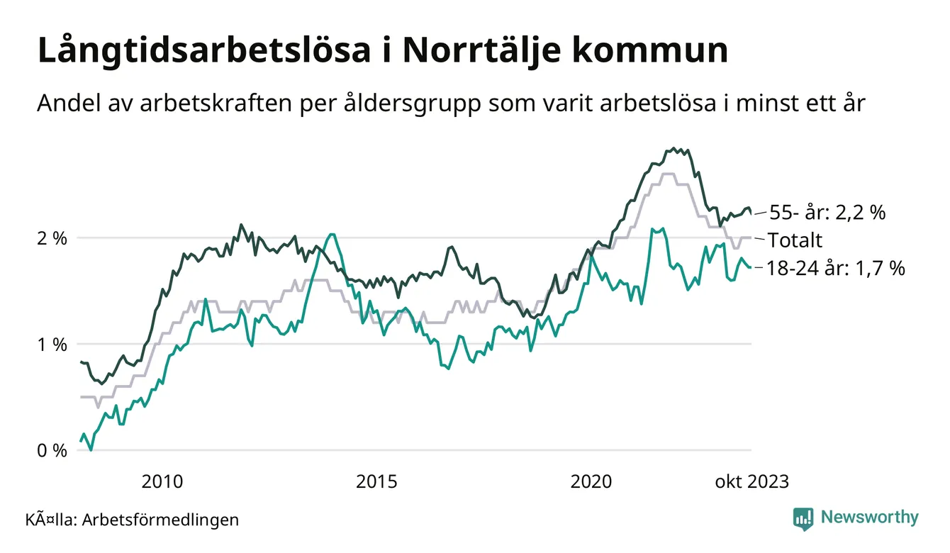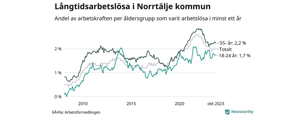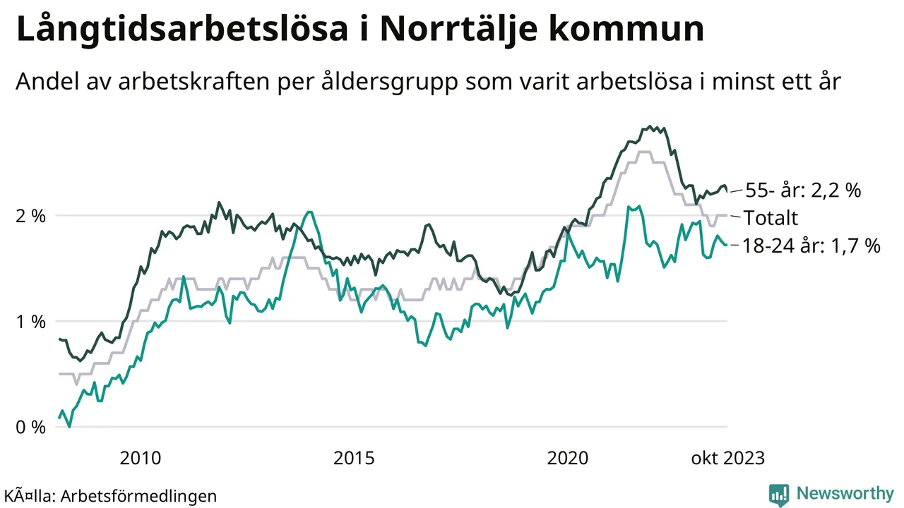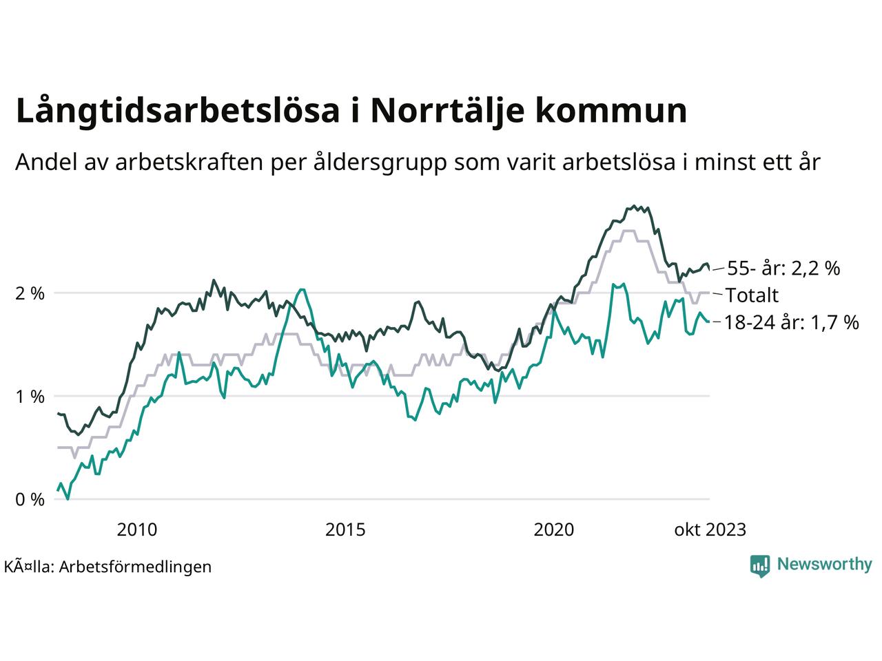 Av de 602 personerna som varit arbetslösa i mer än ett år i Norrtälje kommun är 172 personer mellan 55 och 651 år och 48 är mellan 18 och 24 år. För den äldre gruppen är andelen arbetslösa 2,2 procent medan den i den yngre gruppen är 1,7 procent. Även i riket som helhet är långtidsarbetslösheten högre i gruppen äldre.