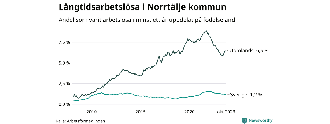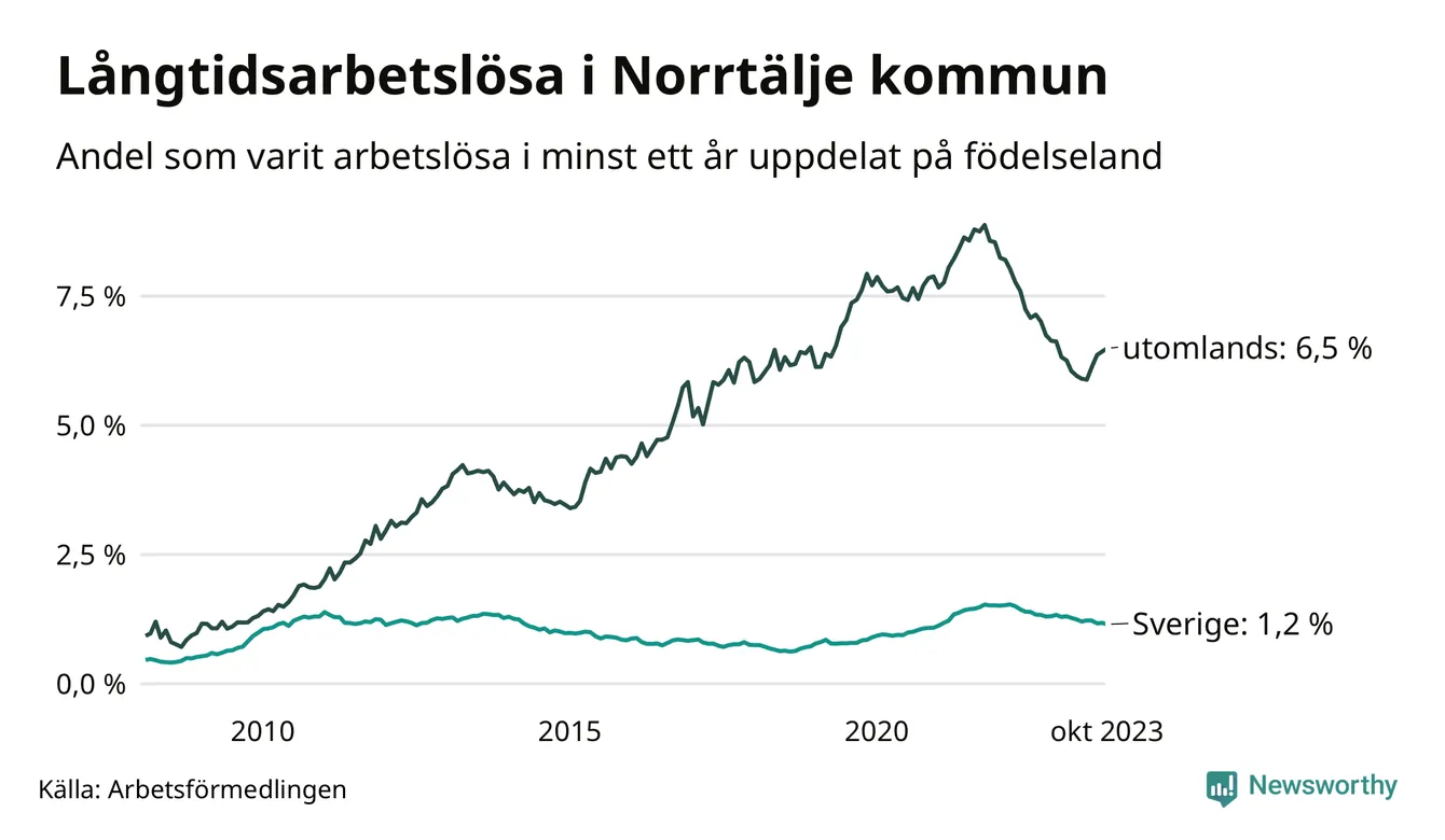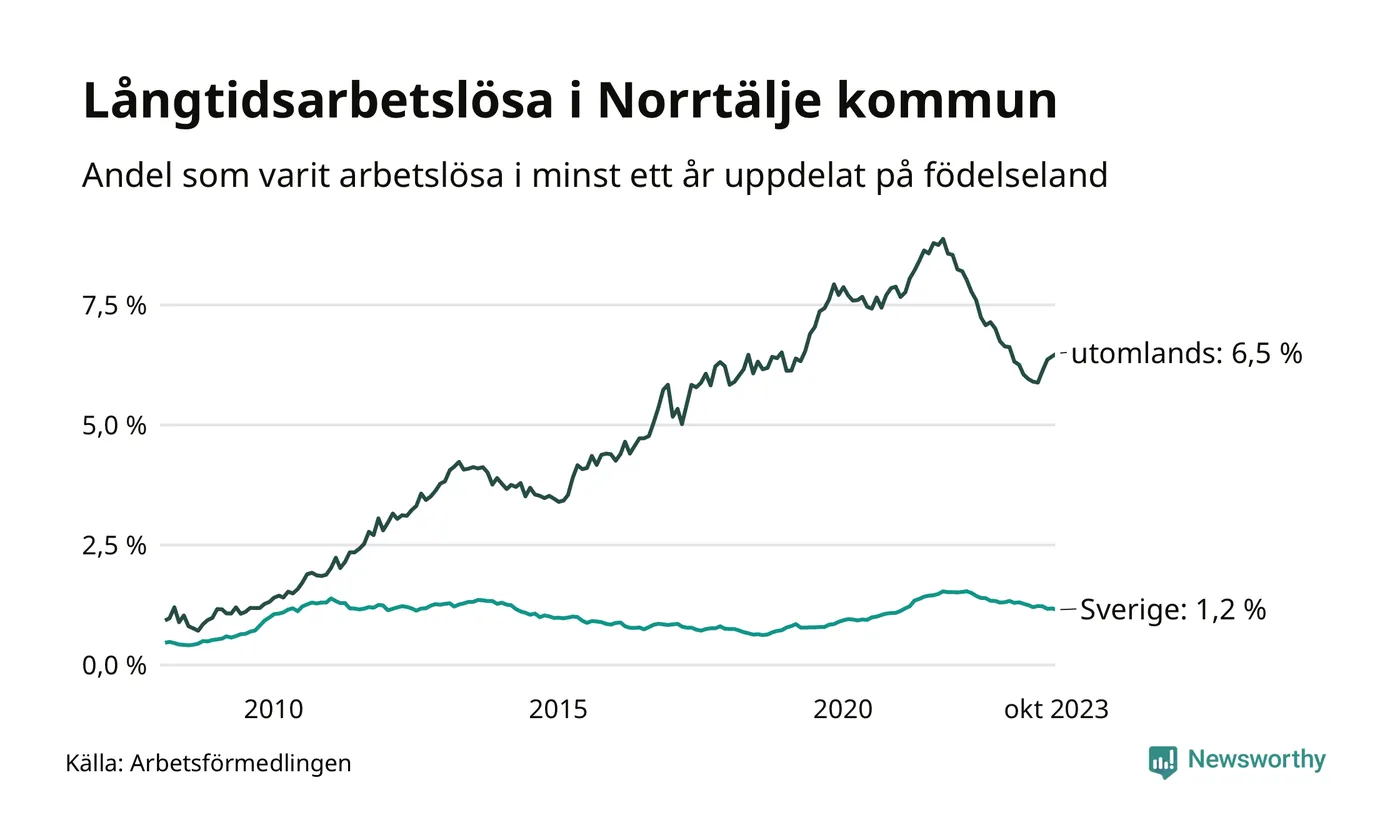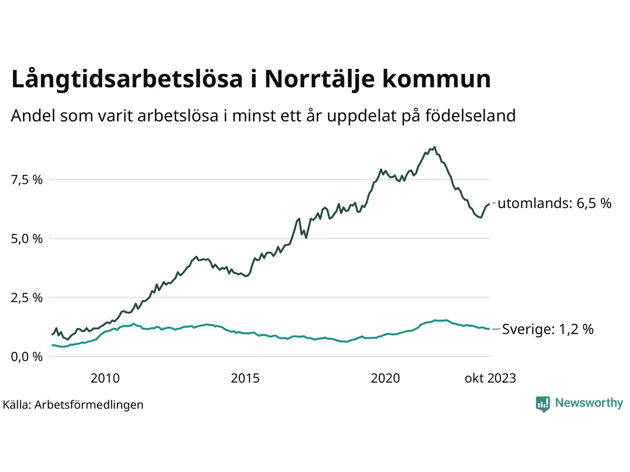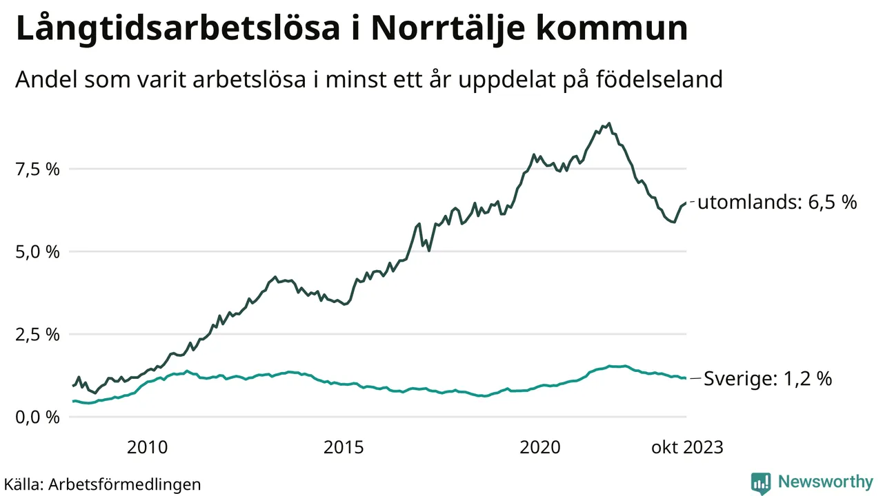 295 av de långtidsarbetslösa i Norrtälje är födda i Sverige, medan 307 är födda utomlands. Det innebär att långtidsarbetslösheten bland Sverigefödda är 1,2 procent, medan den är fem gånger så hög – 6,5 procent – bland födda utomlands. Även i riket som helhet är arbetslösheten högre bland utrikesfödda.
