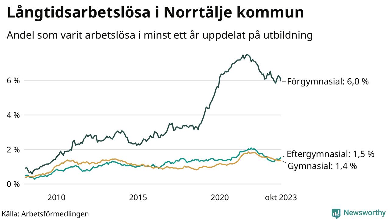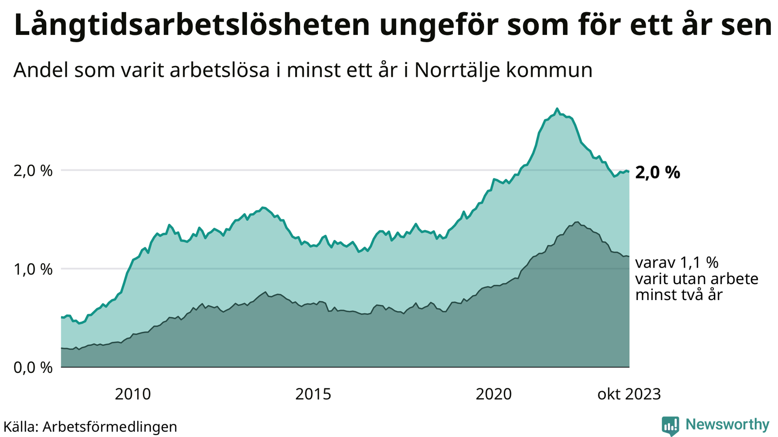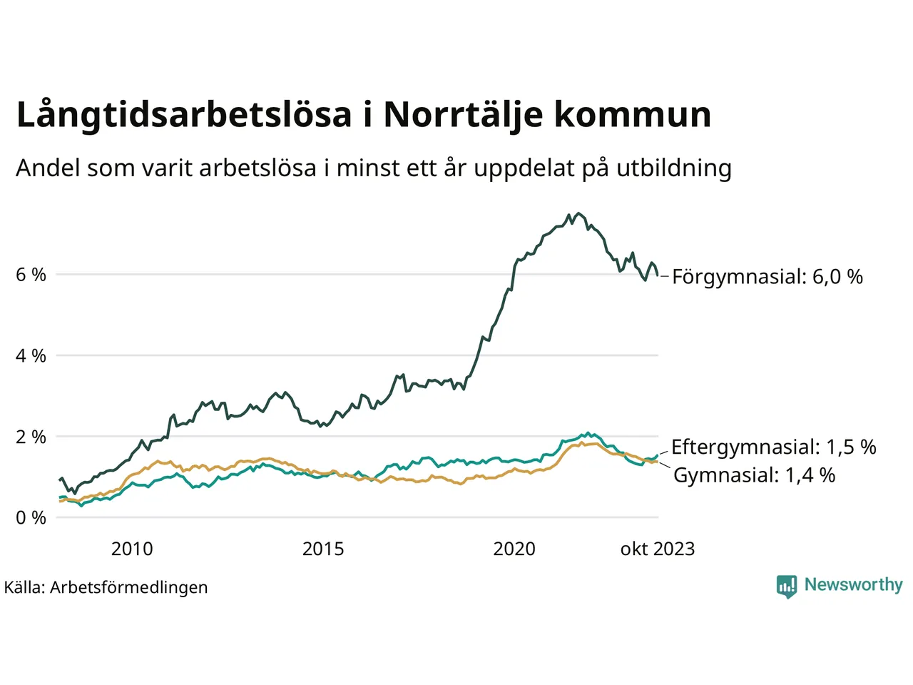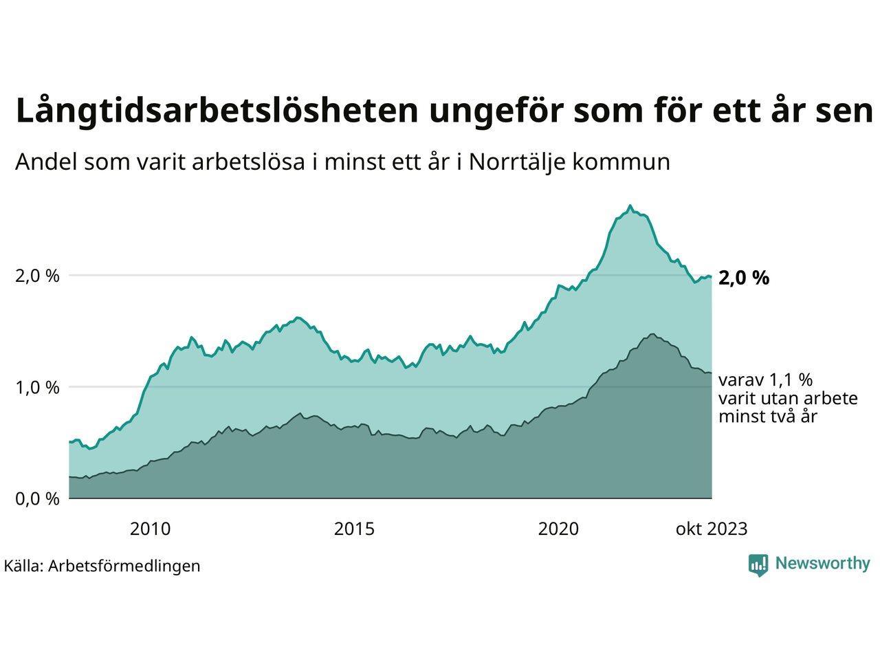 I oktober hade 602 Norrtäljebor varit arbetslösa i minst ett år, vilket är tre färre än månaden innan. 602 personer motsvarar 2,0 procent av arbetskraften i kommunen – andelen långtidsarbetslösa är ungefär på samma nivå som för ett år sedan.