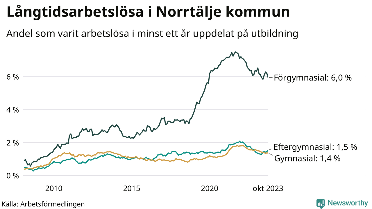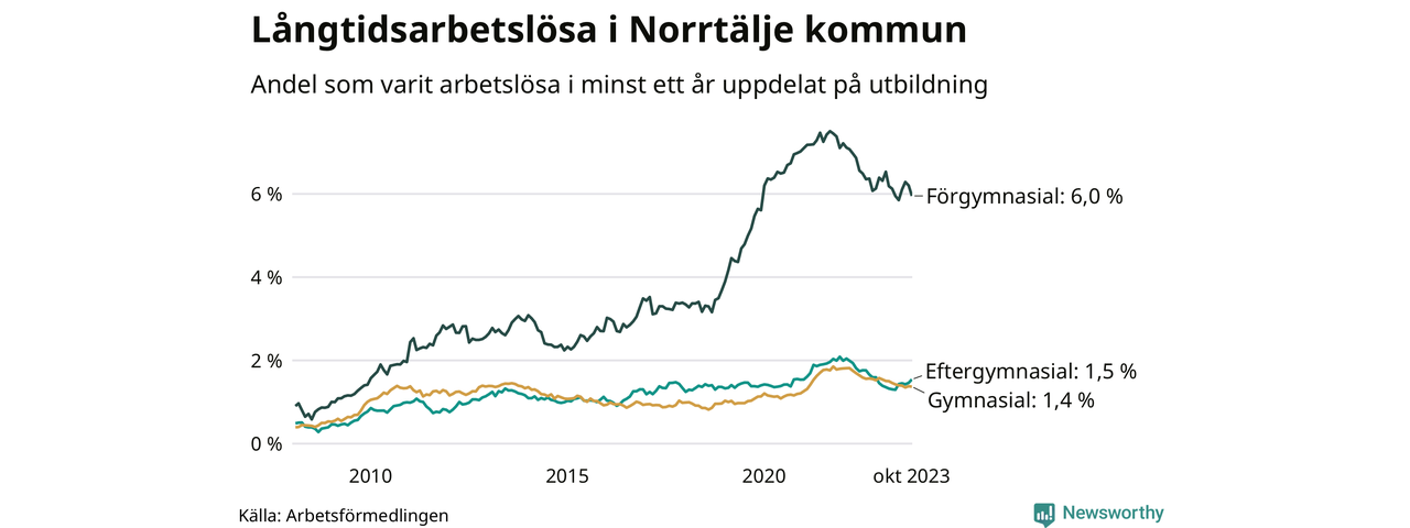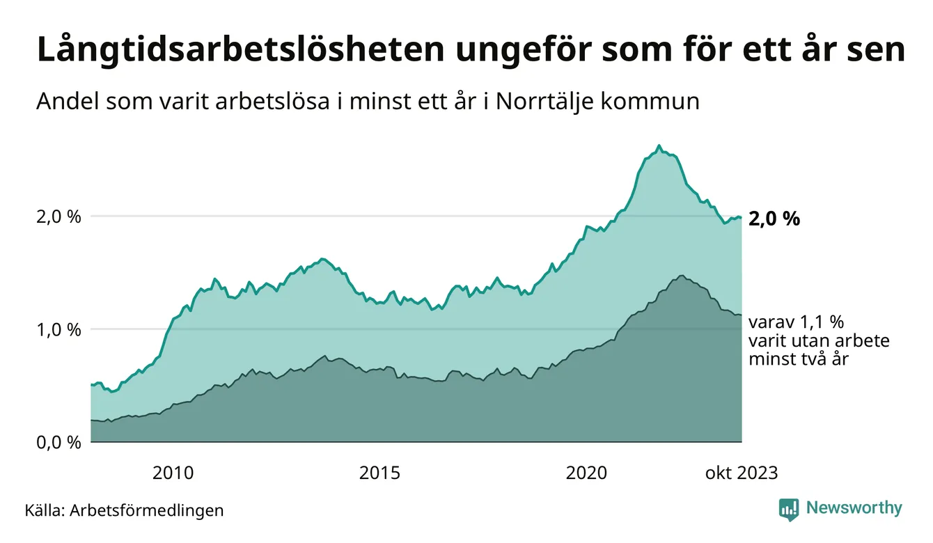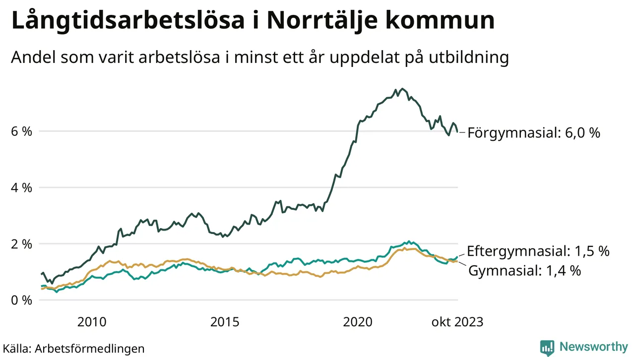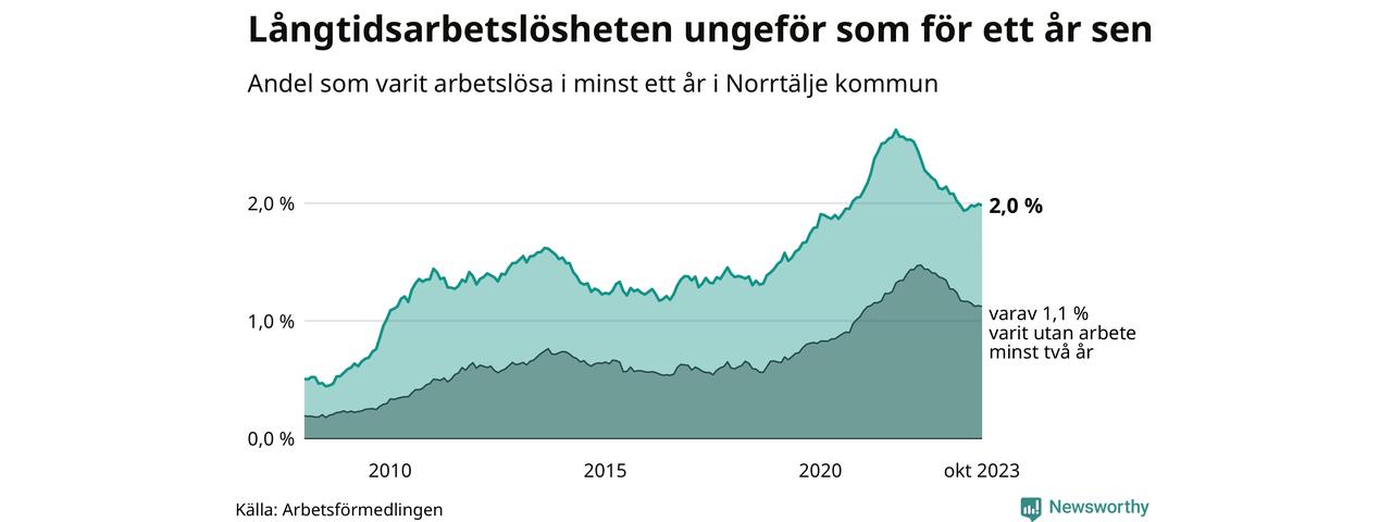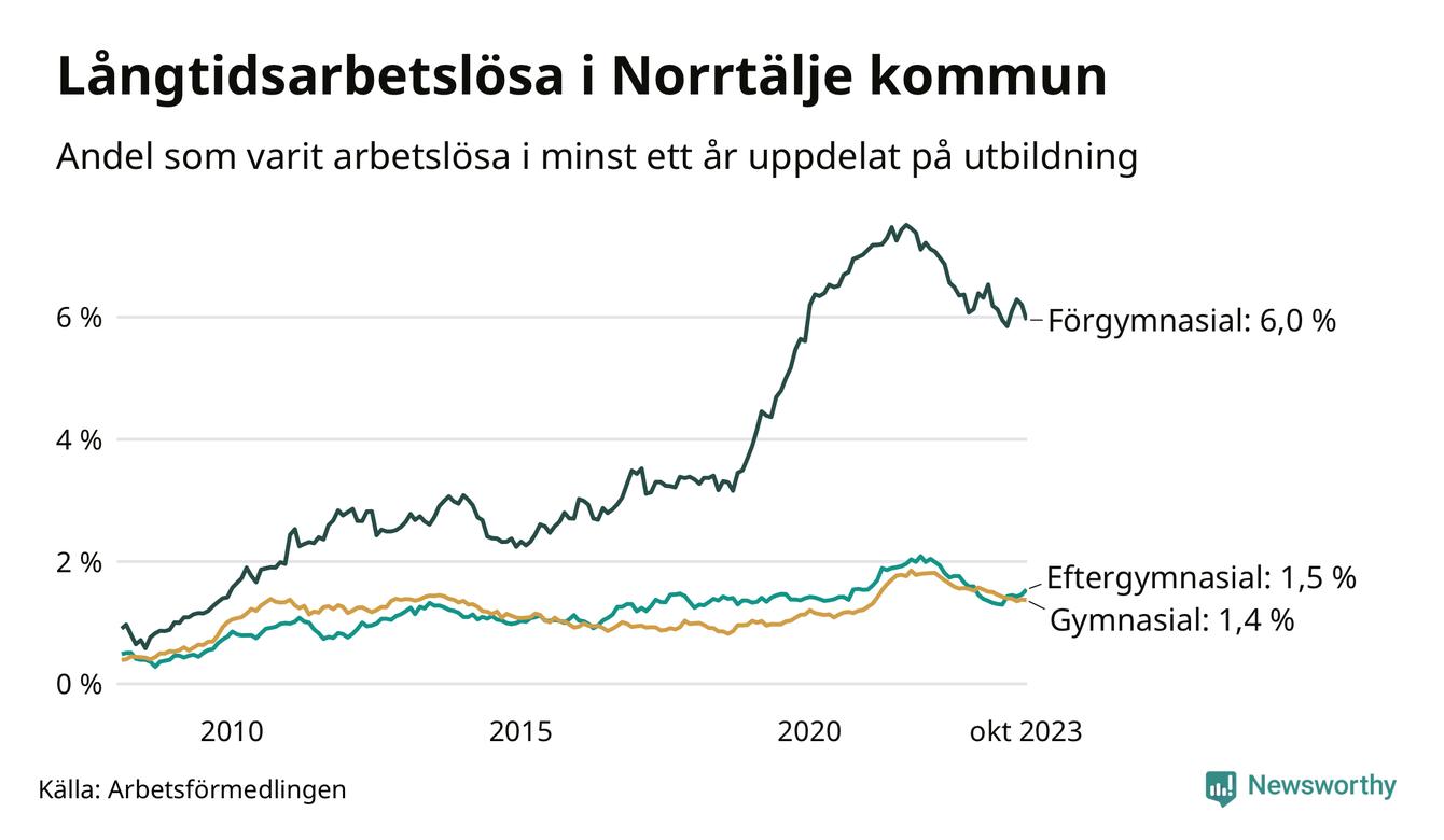 I oktober hade 602 Norrtäljebor varit arbetslösa i minst ett år, vilket är tre färre än månaden innan. 602 personer motsvarar 2,0 procent av arbetskraften i kommunen – andelen långtidsarbetslösa är ungefär på samma nivå som för ett år sedan.