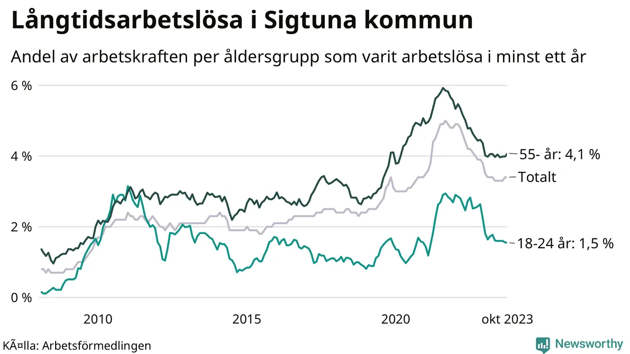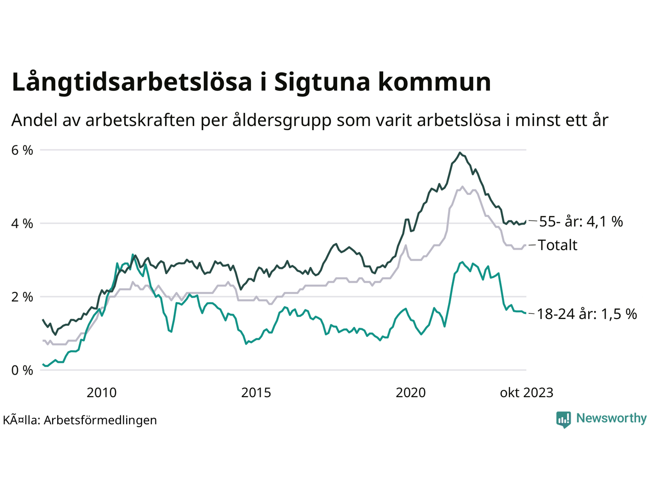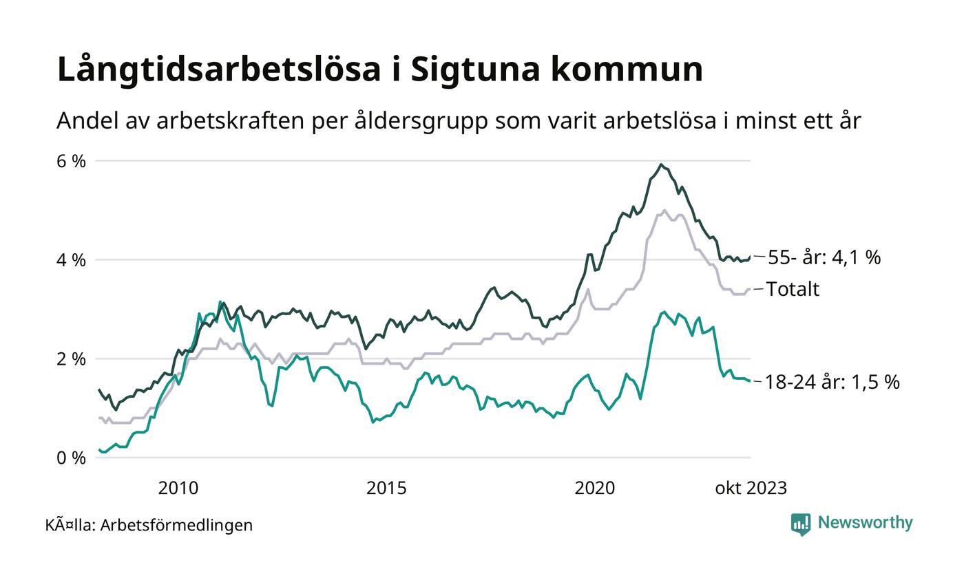 Av de 870 personerna som varit arbetslösa i mer än ett år i Sigtuna kommun är 198 personer mellan 55 och 651 år och 38 är mellan 18 och 24 år. För den äldre gruppen är andelen arbetslösa 4,1 procent medan den i den yngre gruppen är 1,5 procent. Även i riket som helhet är långtidsarbetslösheten högre i gruppen äldre.