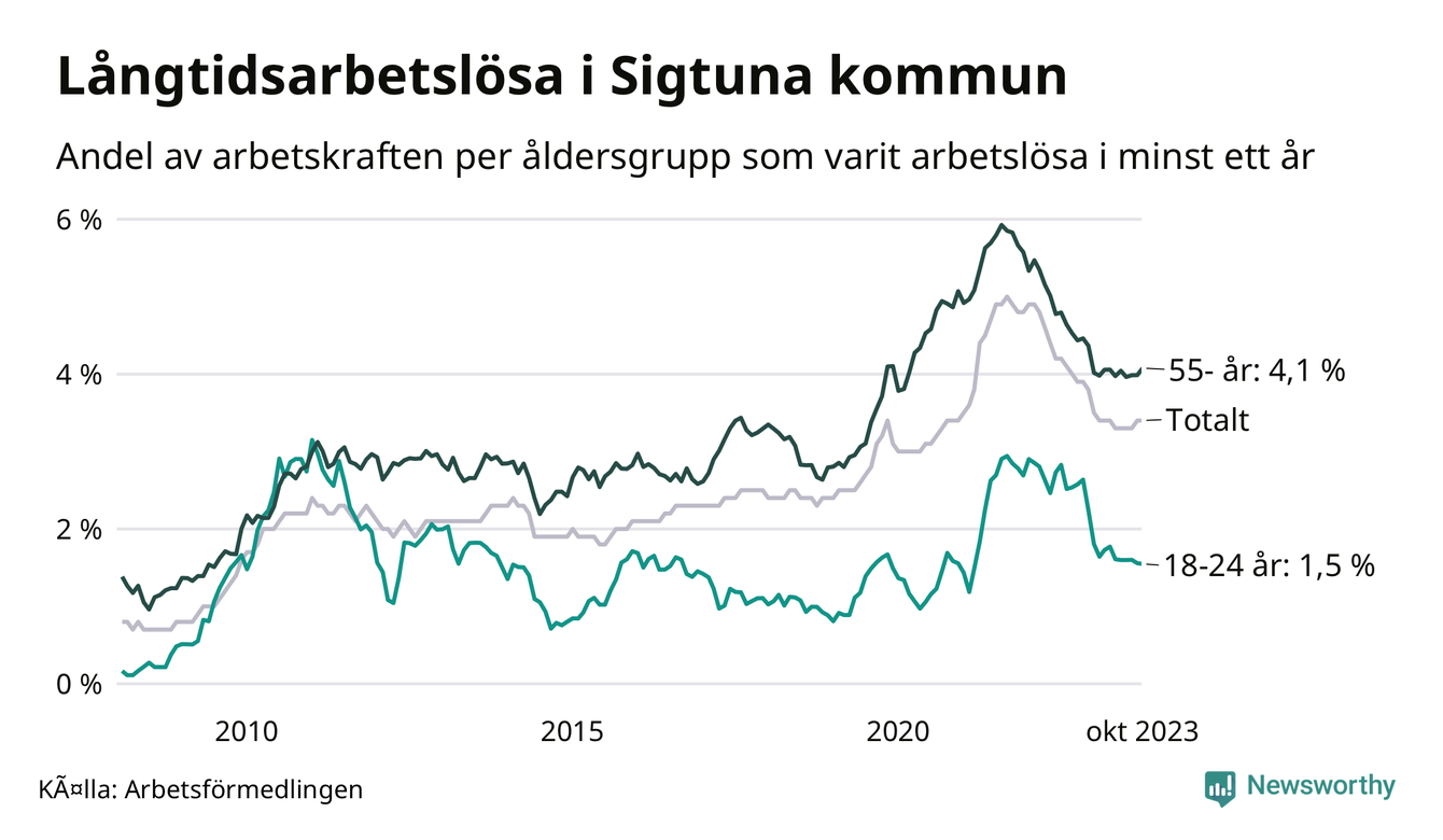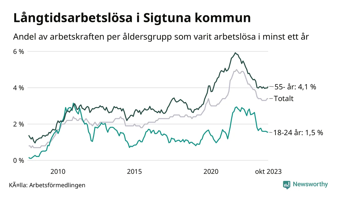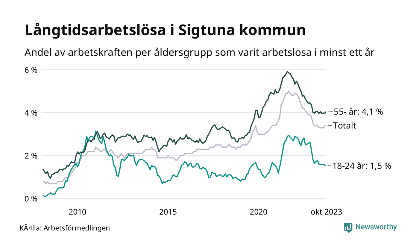 Av de 870 personerna som varit arbetslösa i mer än ett år i Sigtuna kommun är 198 personer mellan 55 och 651 år och 38 är mellan 18 och 24 år. För den äldre gruppen är andelen arbetslösa 4,1 procent medan den i den yngre gruppen är 1,5 procent. Även i riket som helhet är långtidsarbetslösheten högre i gruppen äldre.