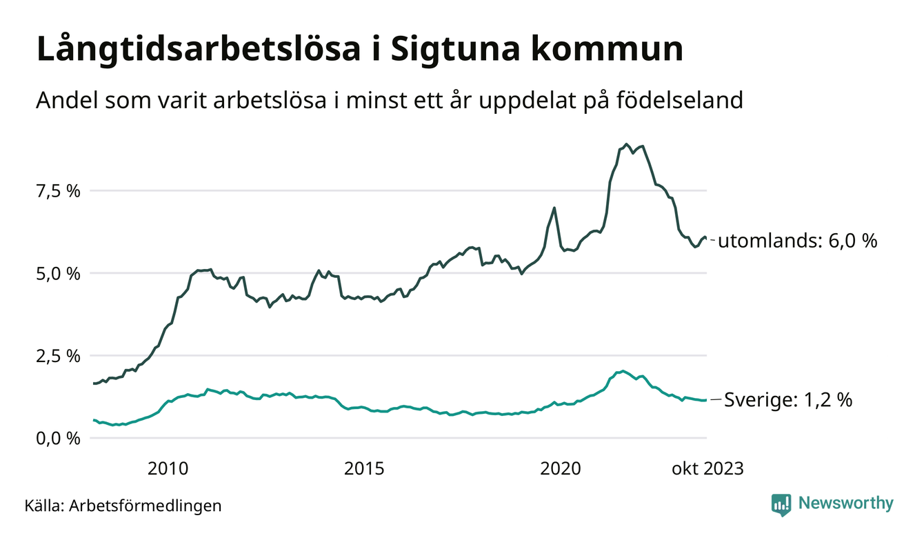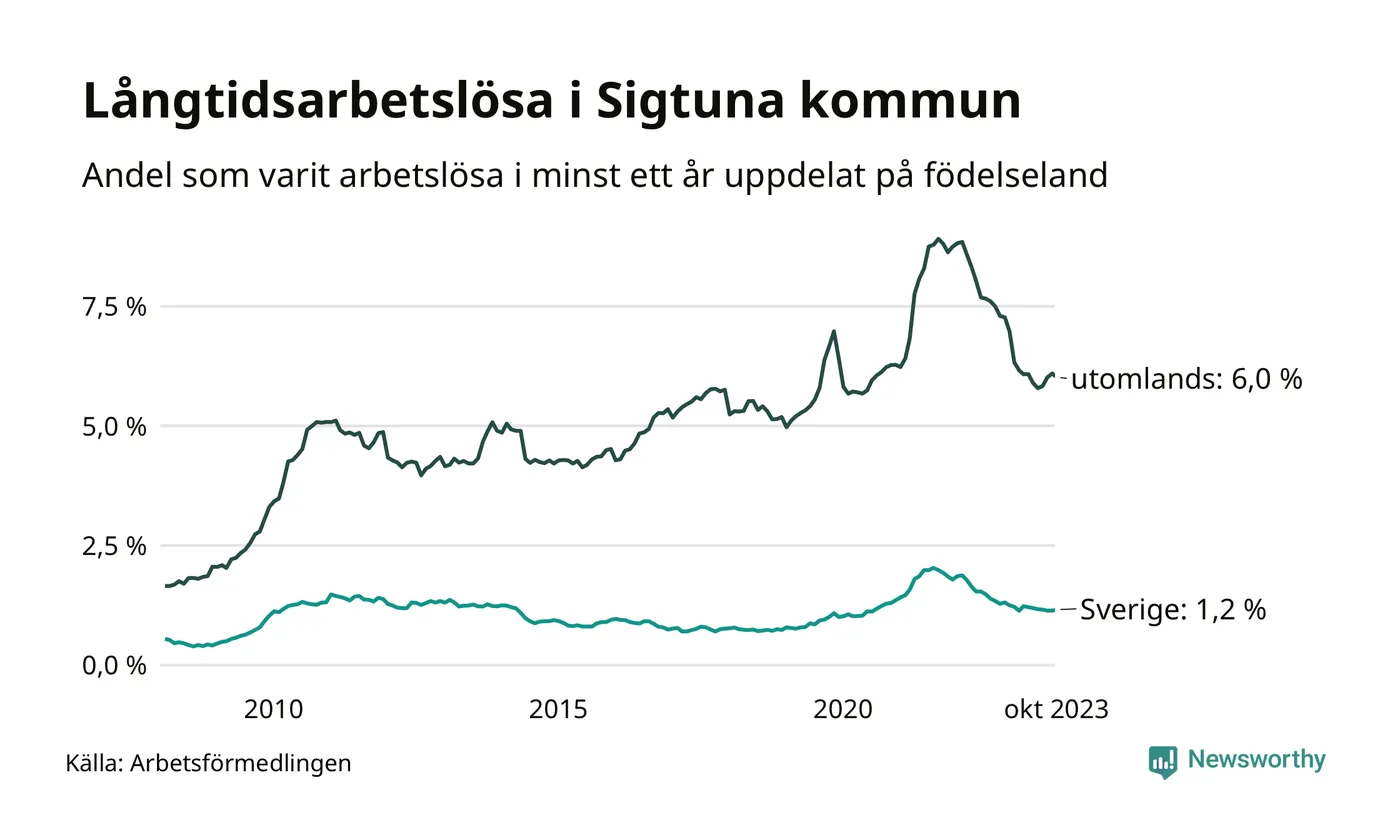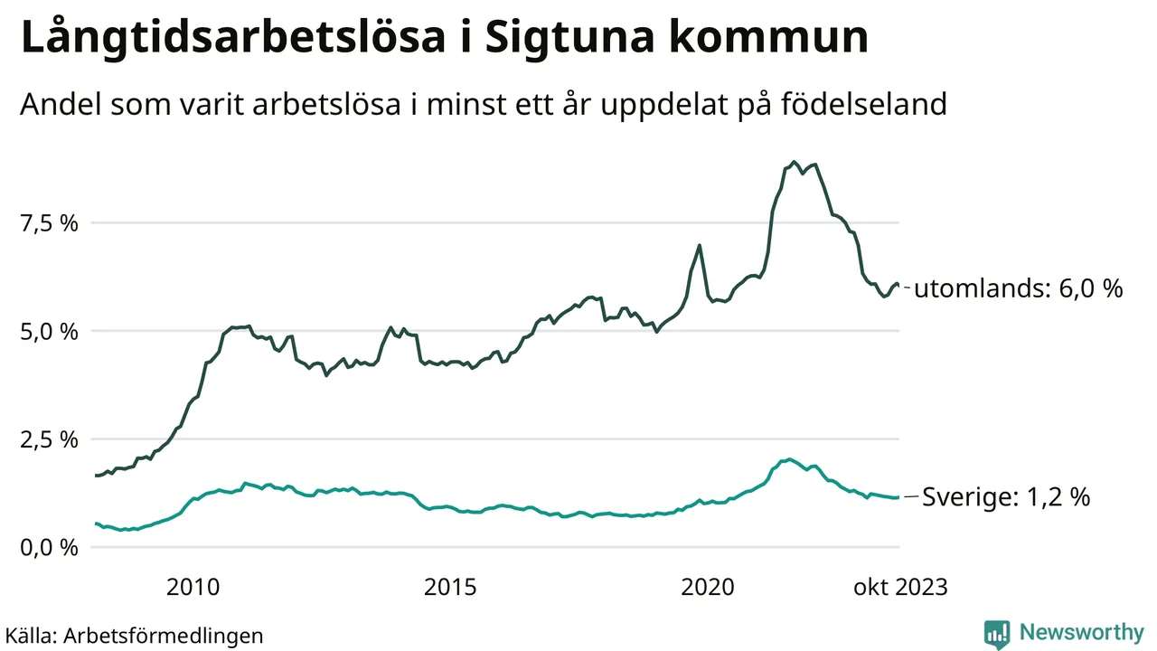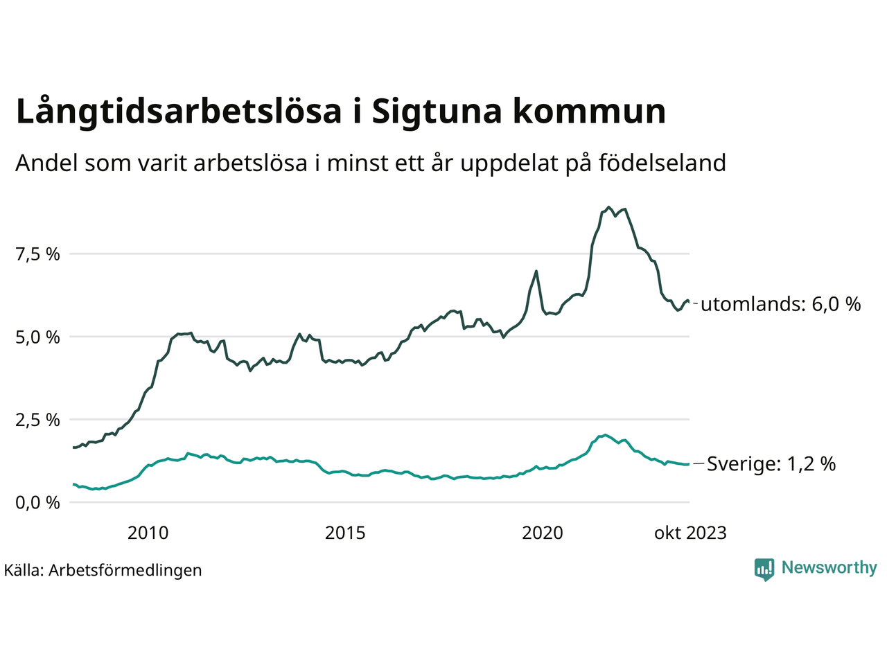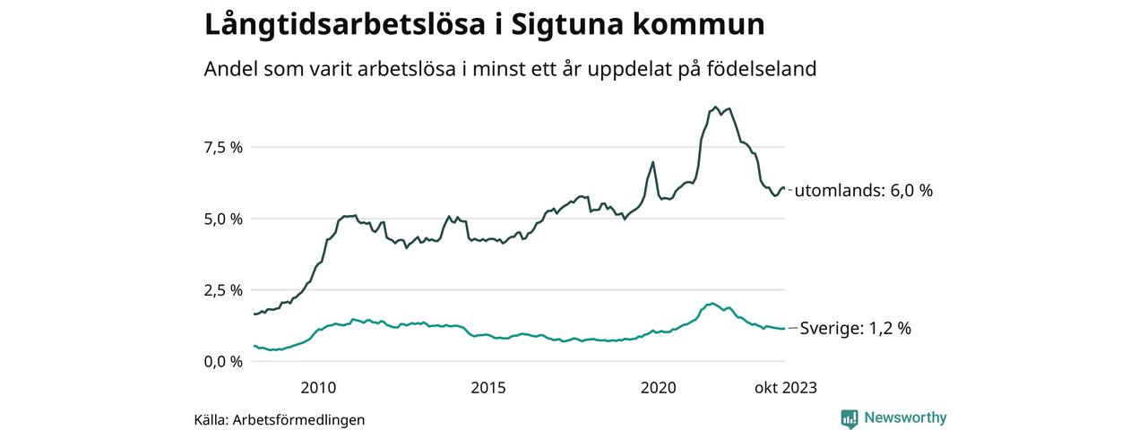 164 av de långtidsarbetslösa i Sigtuna är födda i Sverige, medan 706 är födda utomlands. Det innebär att långtidsarbetslösheten bland Sverigefödda är 1,2 procent, medan den är fem gånger så hög – 6,0 procent – bland födda utomlands. Även i riket som helhet är arbetslösheten högre bland utrikesfödda.