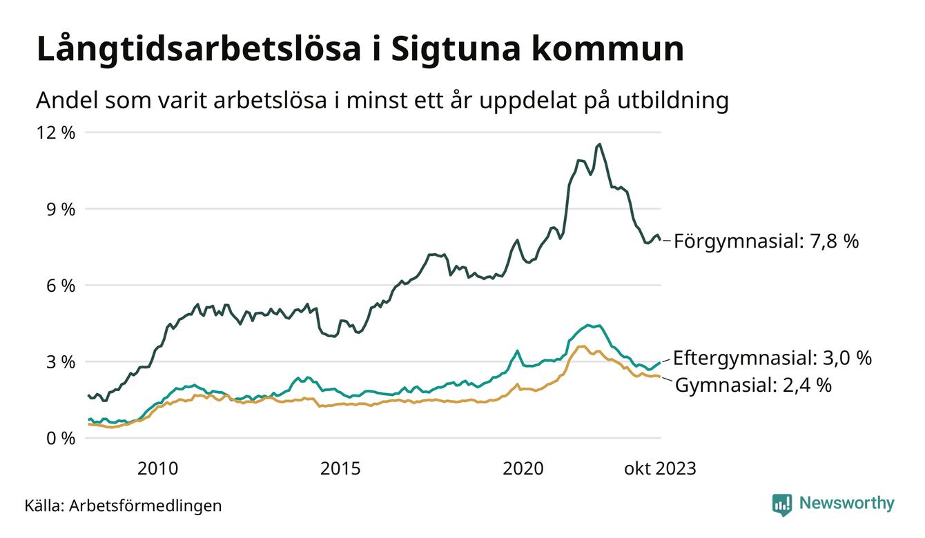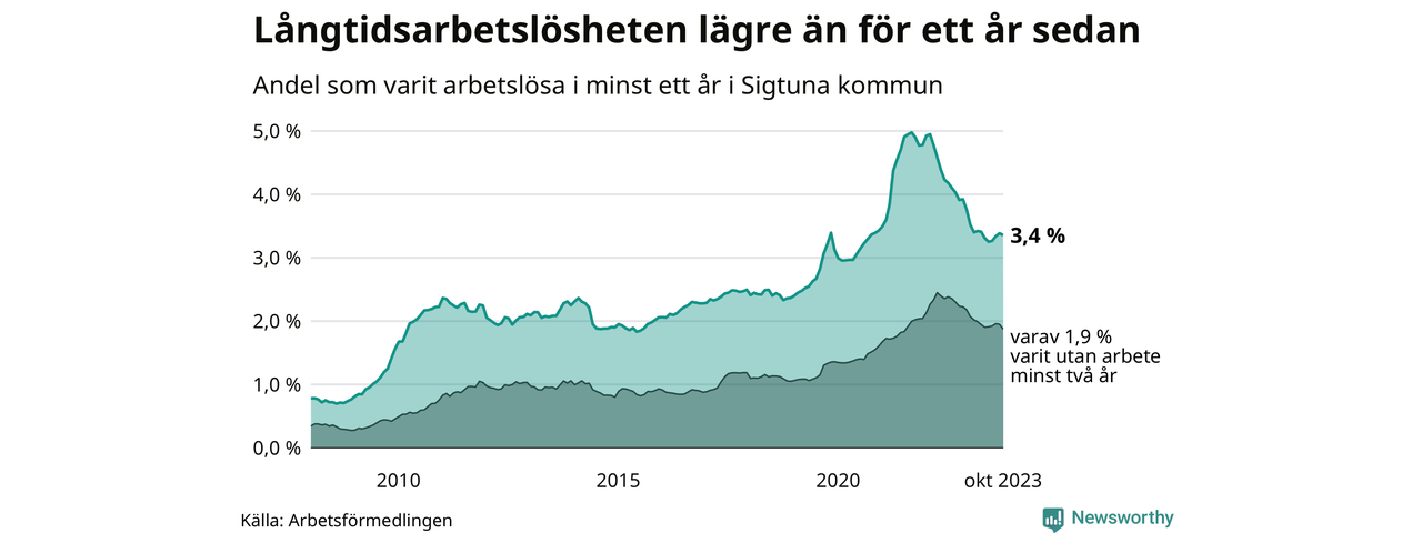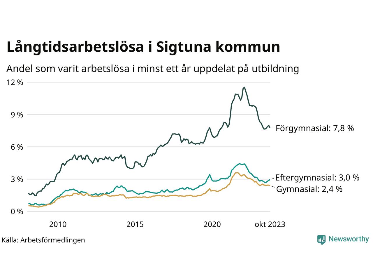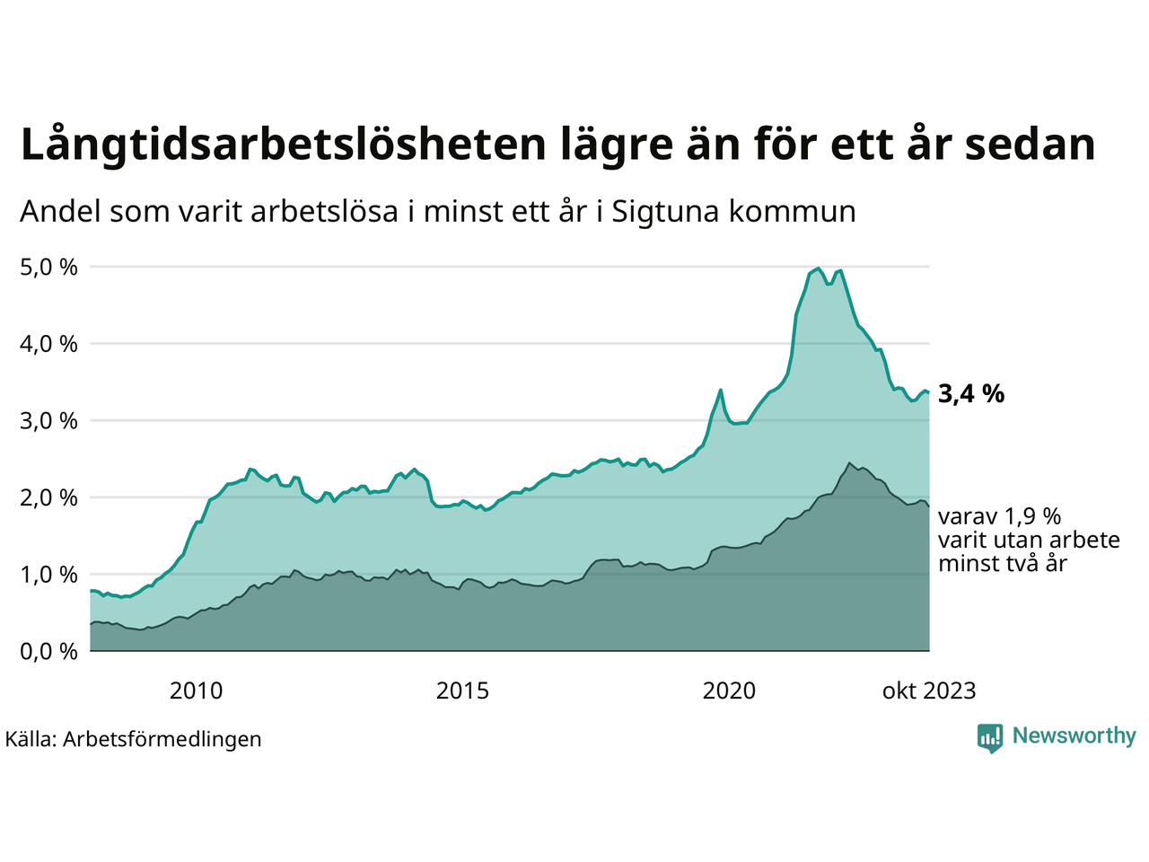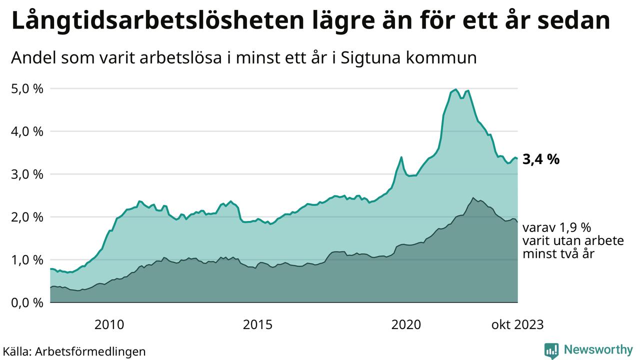 I oktober hade 870 Sigtunabor varit arbetslösa i minst ett år, vilket är sju färre än månaden innan. 870 personer motsvarar 3,4 procent av arbetskraften i kommunen – andelen långtidsarbetslösa är 0,5 procentenheter lägre än samma månad för ett år sedan.