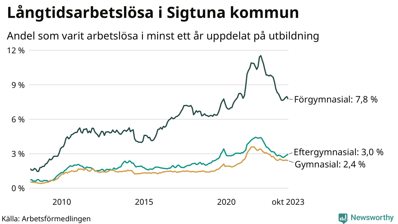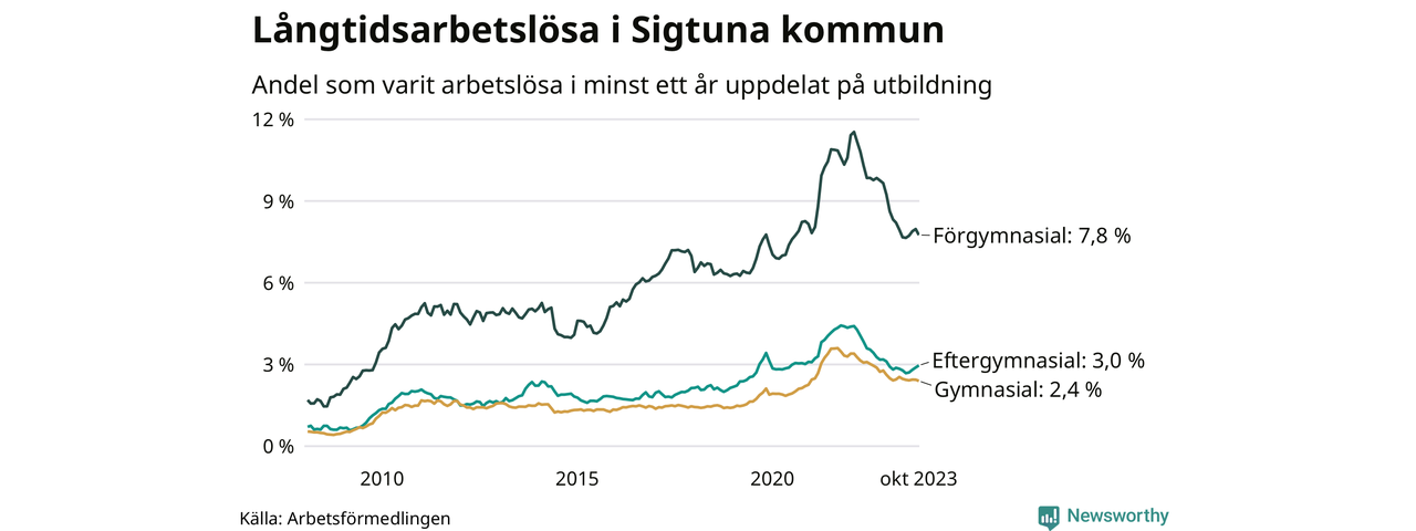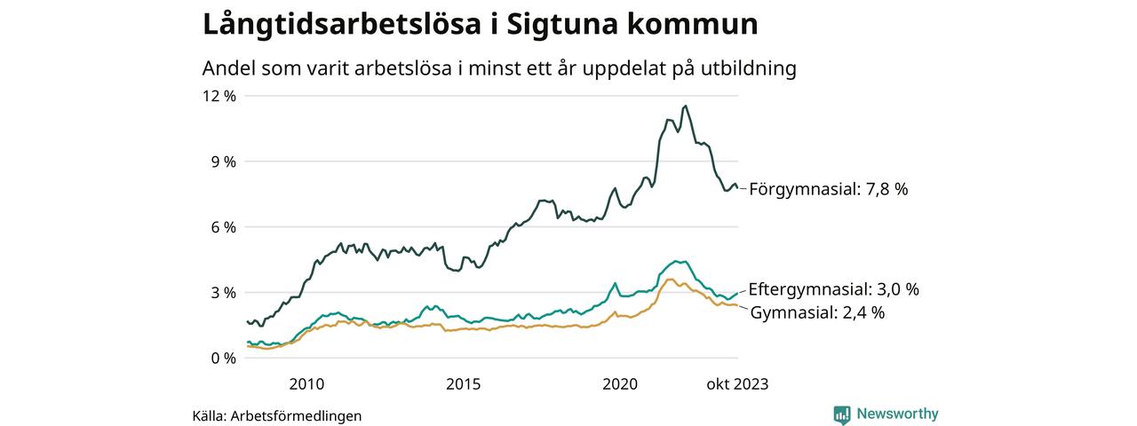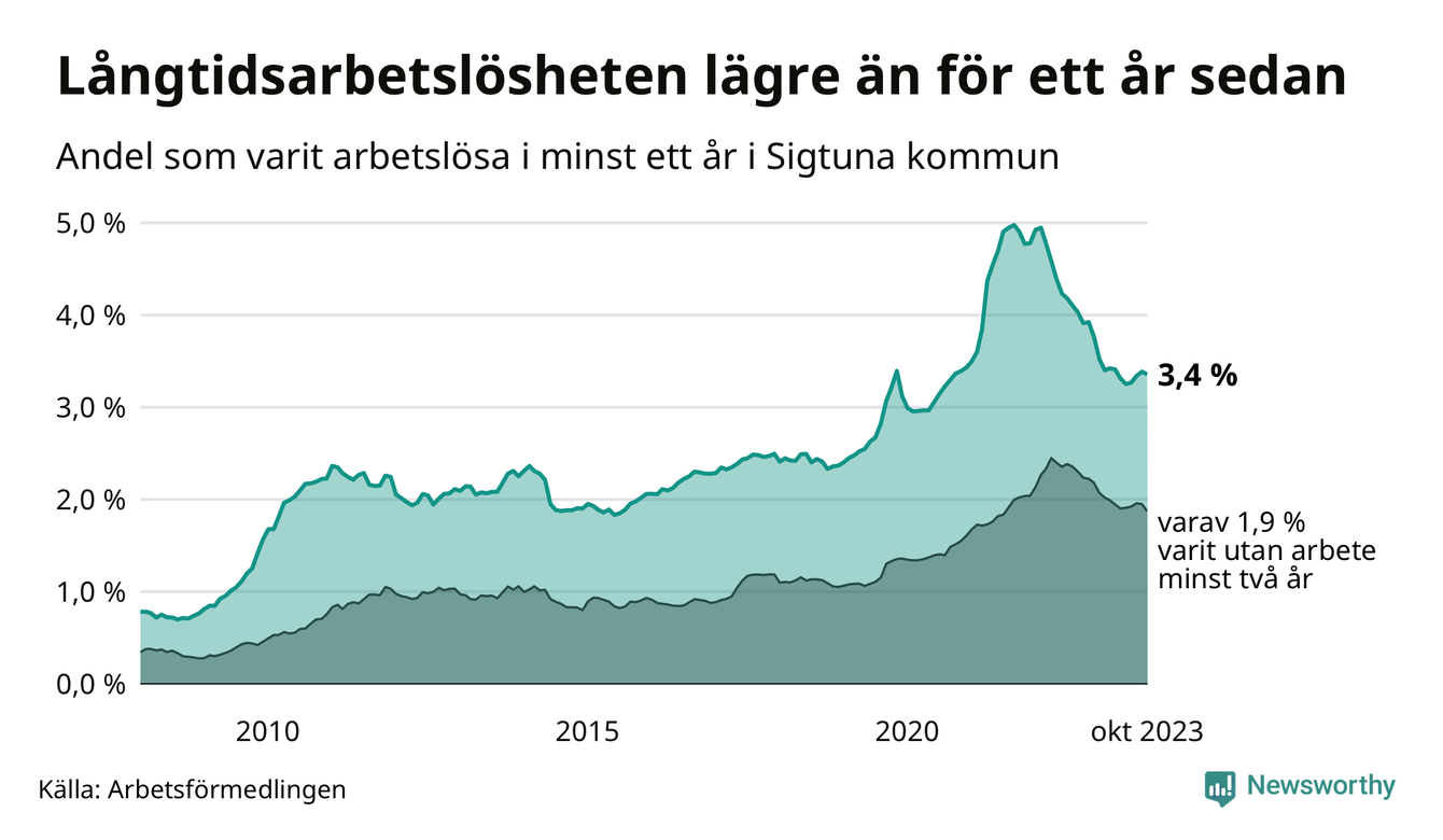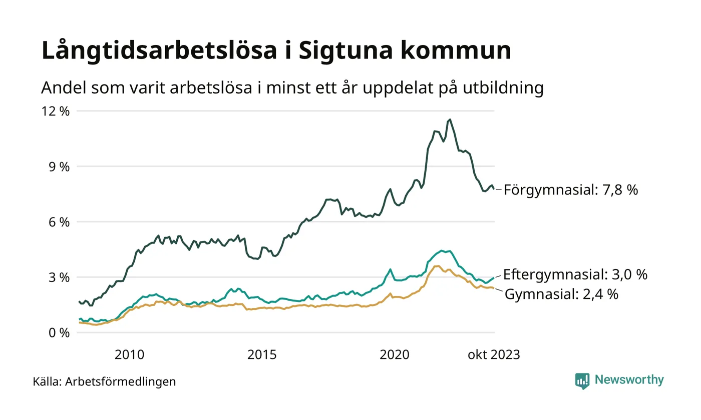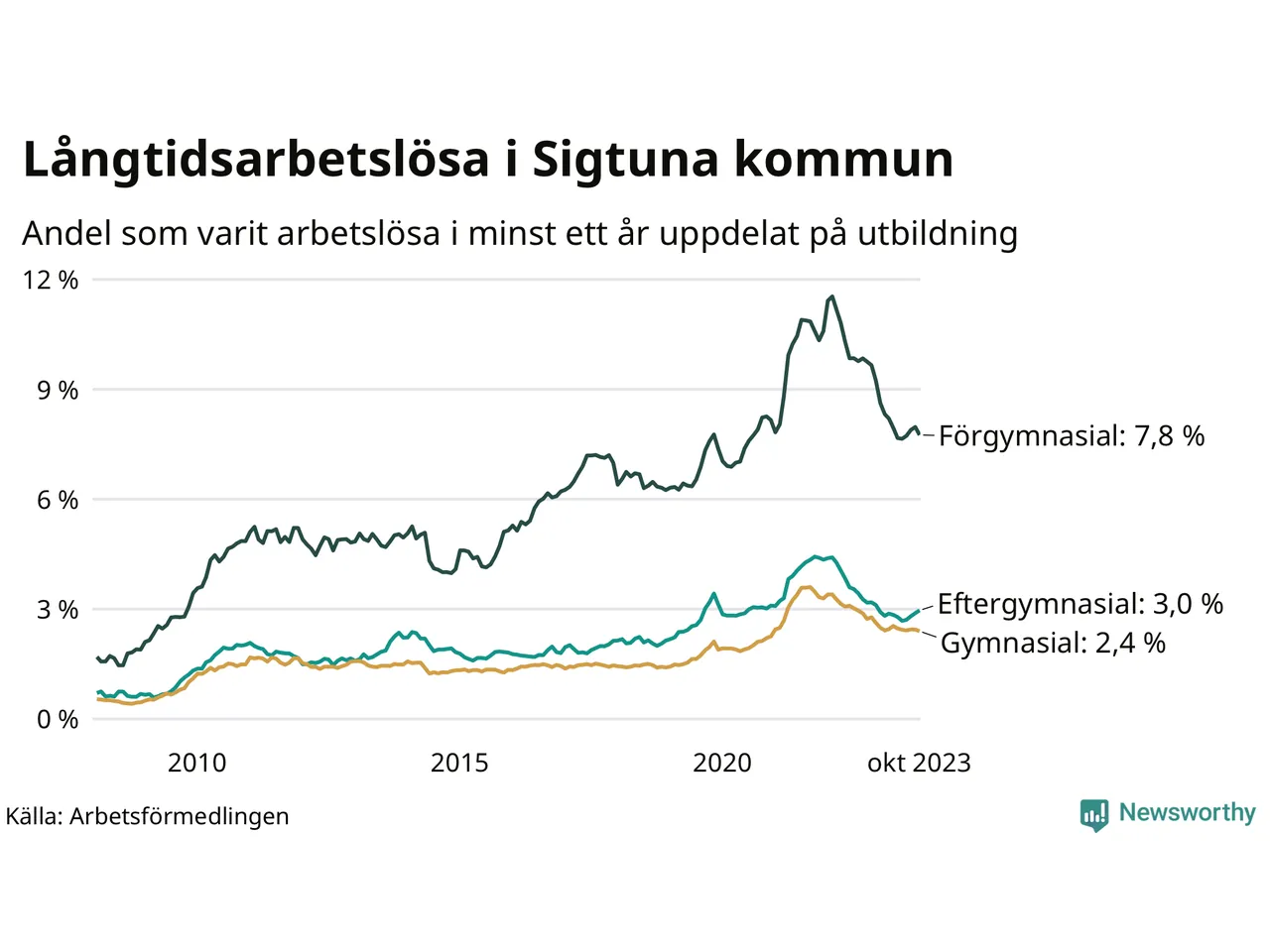 I oktober hade 870 Sigtunabor varit arbetslösa i minst ett år, vilket är sju färre än månaden innan. 870 personer motsvarar 3,4 procent av arbetskraften i kommunen – andelen långtidsarbetslösa är 0,5 procentenheter lägre än samma månad för ett år sedan.