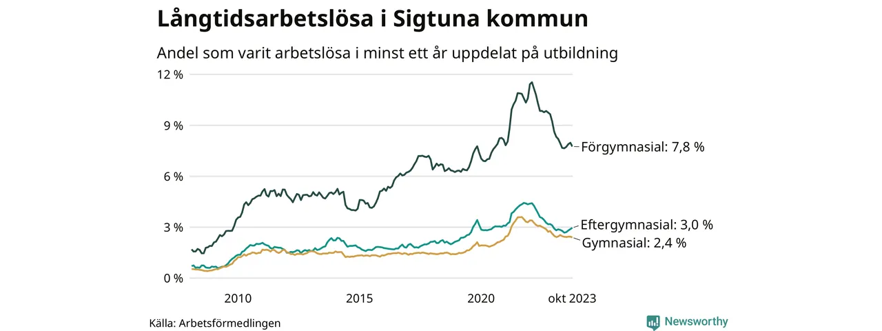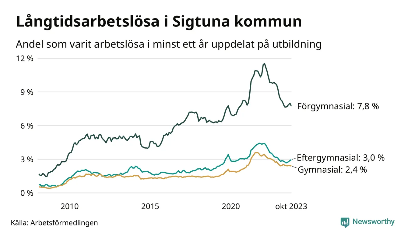 Andelen som varit utan arbete i minst ett år i Sigtuna var lägre i oktober jämfört med samma månad för ett år sedan. Det visar Arbetsfömedlingens senaste månadsstatistik.
